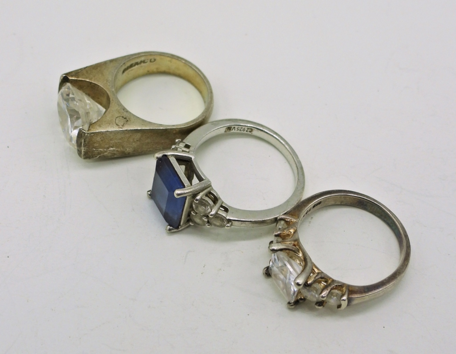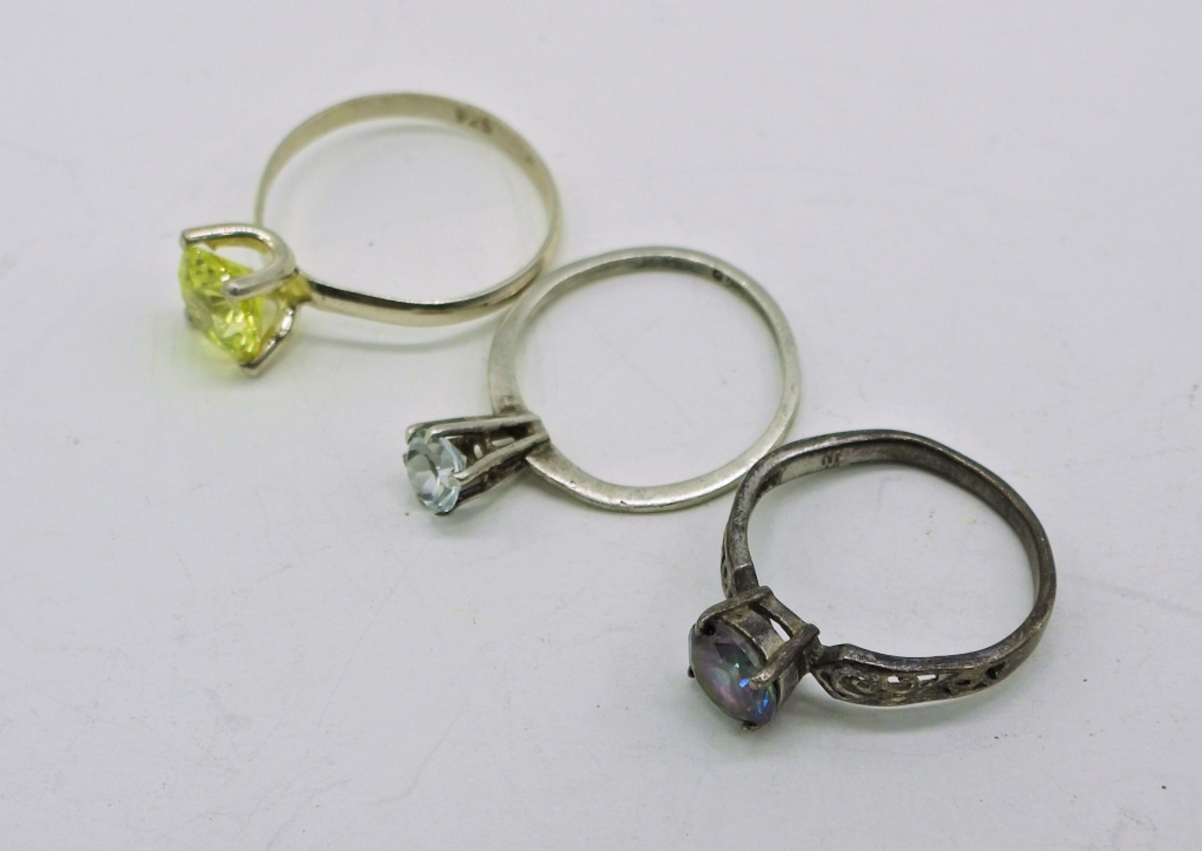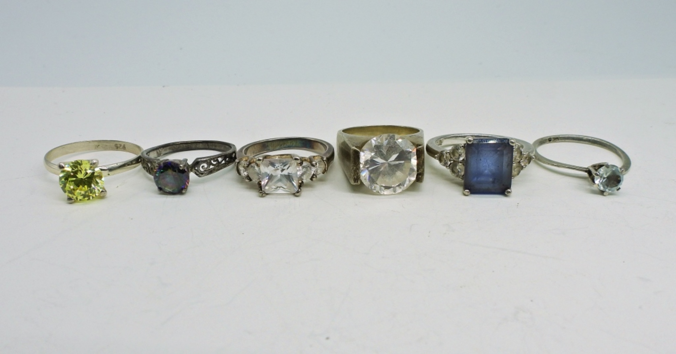 Six Sterling Rings with Various Gemstones. Sizes are 6, 7, 8, 8.5. Some bands are misshapen. 17.2 DWT