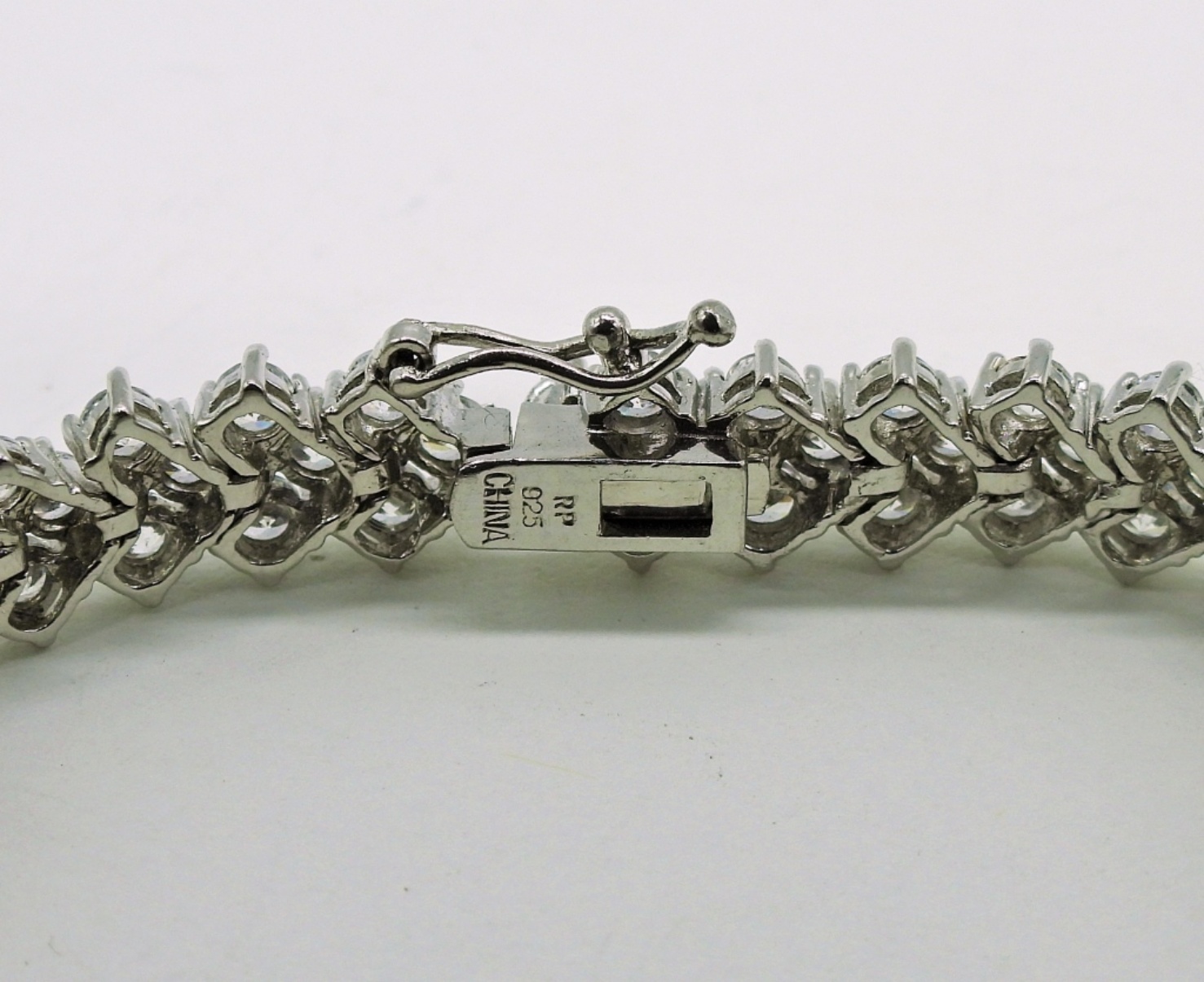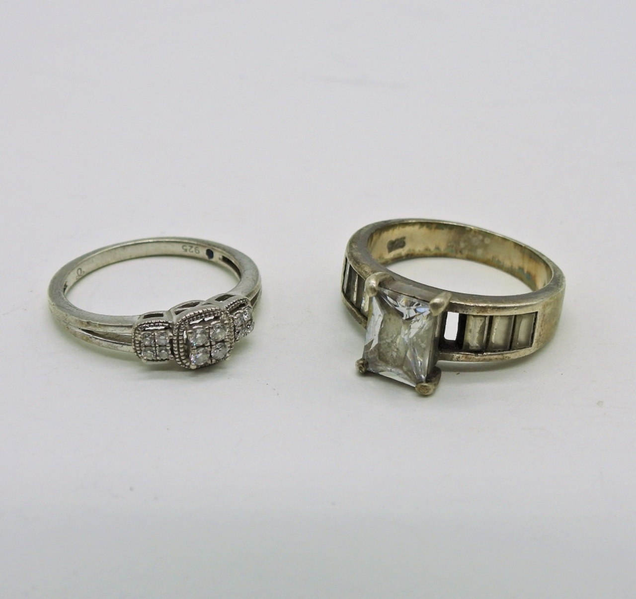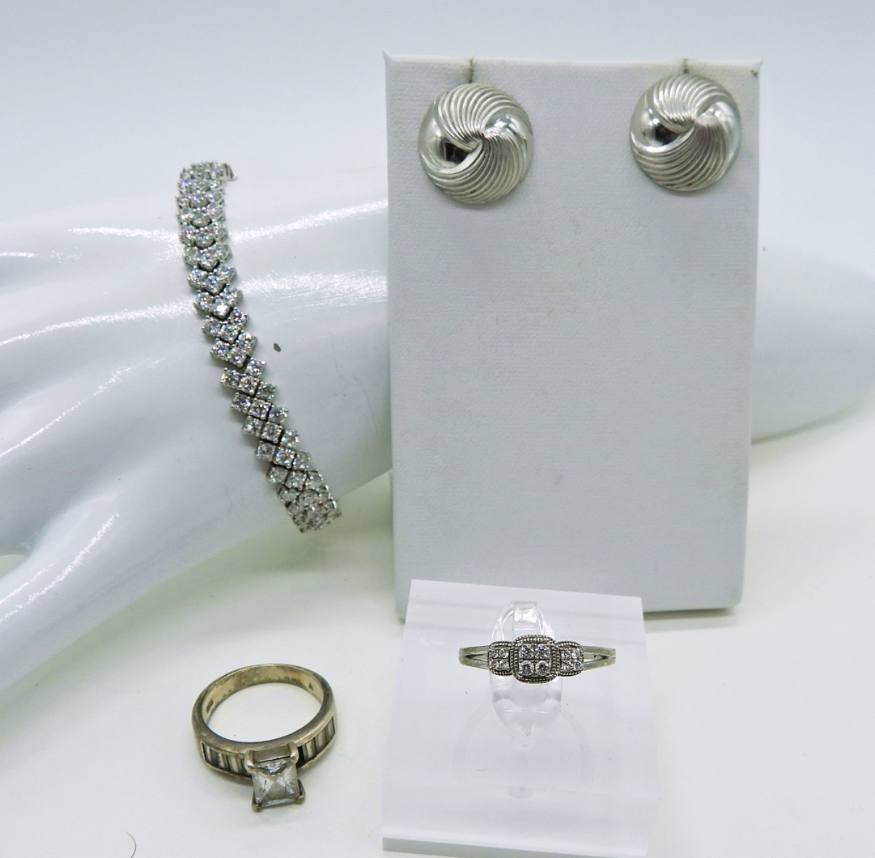 Sterling Diamond Colored Tennis Bracelet, 7″, marked “RP 925 China”. Two Sterling Rings with Diamond Colored Gemstones, Marked “925”. Round Sterling Earrings Marked “Beau Sterling”. 17DWT