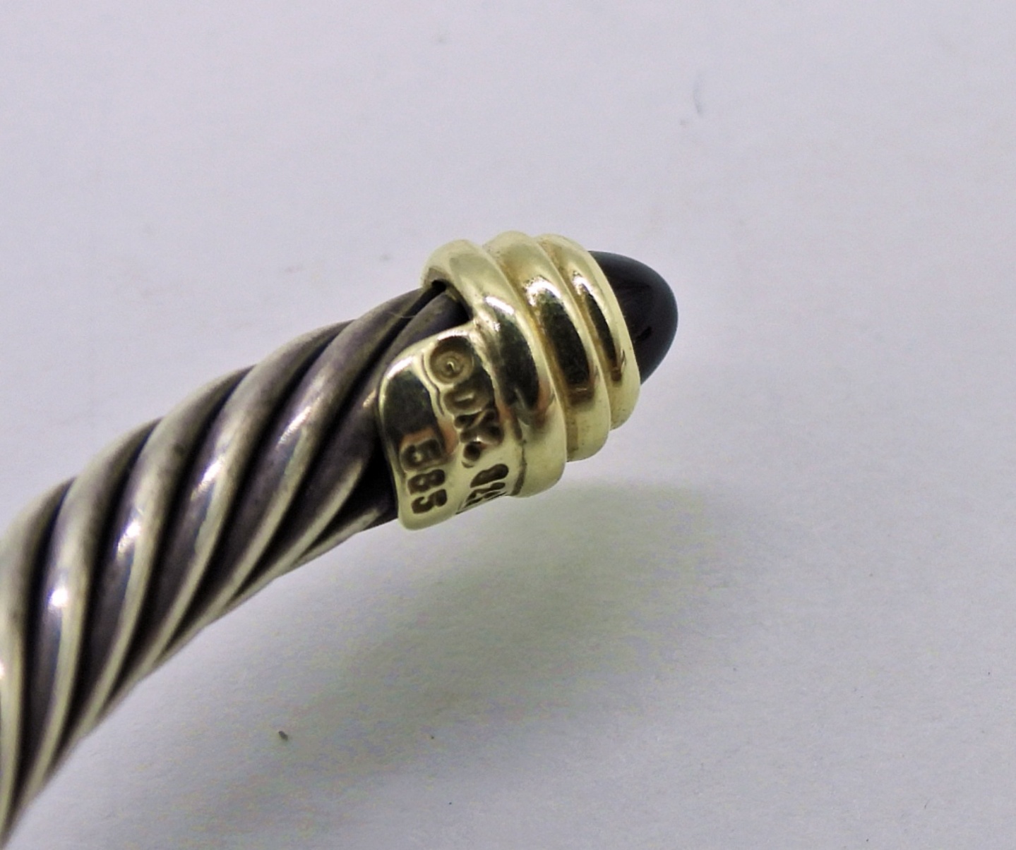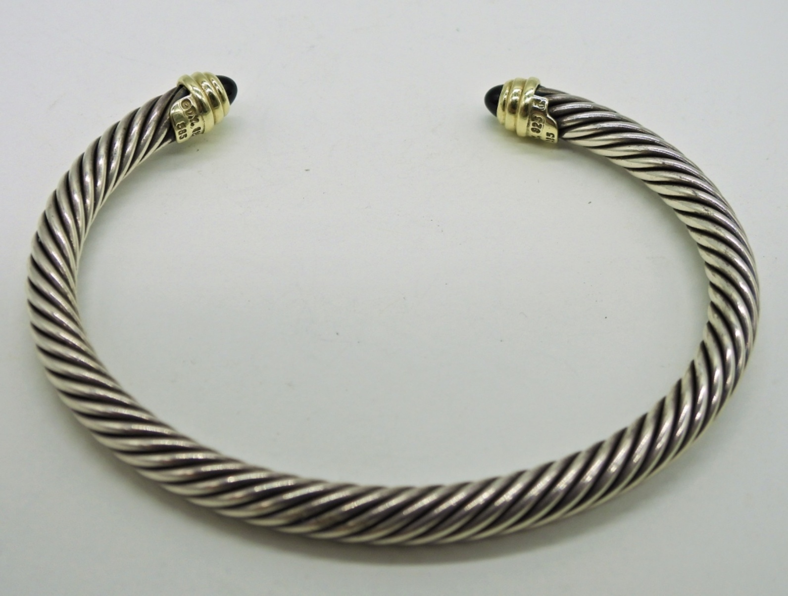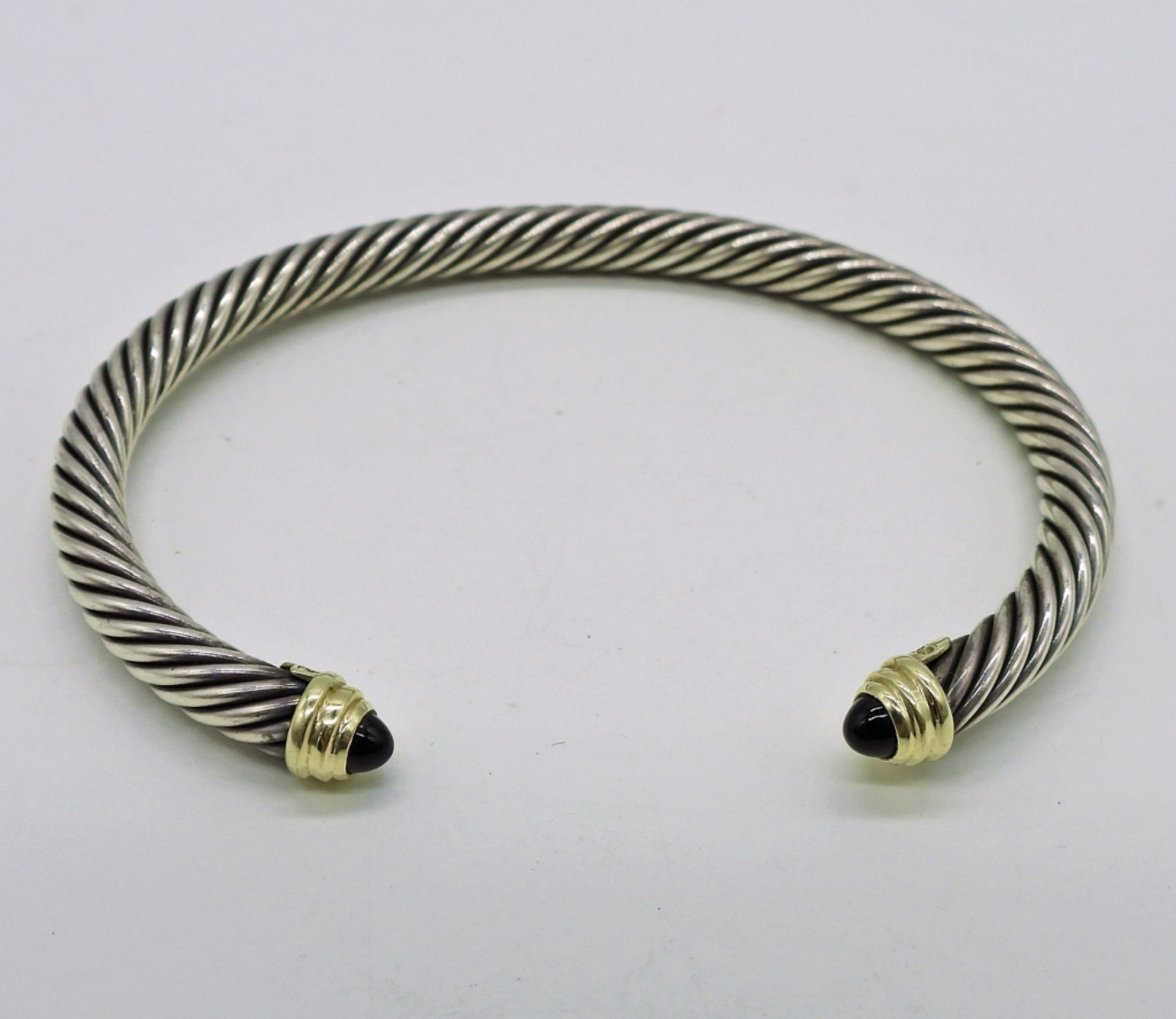 David Yurman 7mm Classic Cable Bracelet with 14K YG Tip Accent, Onyx Tipped. Marked “DY 925 585”. 16.4 DWT Retails around $800.