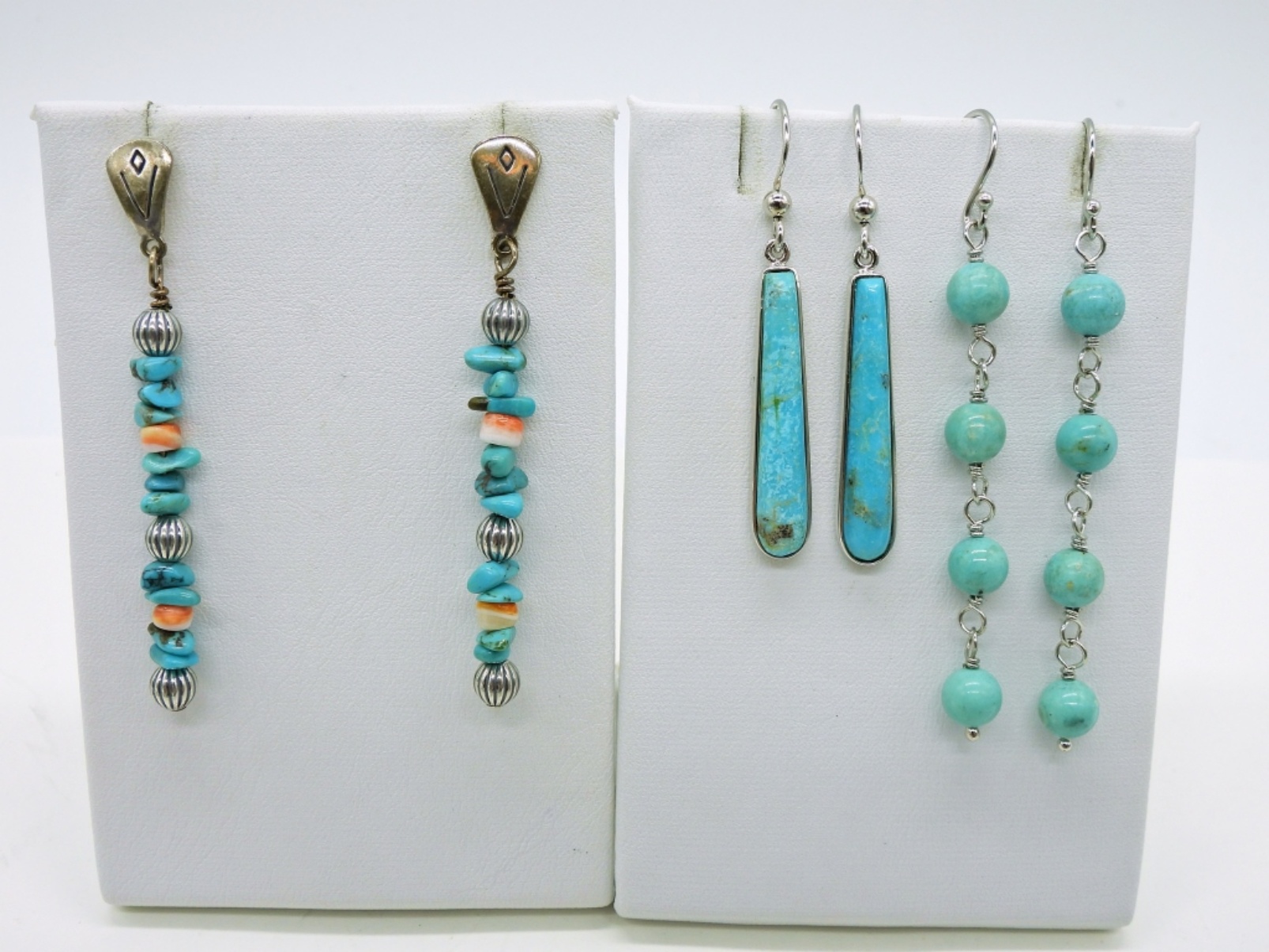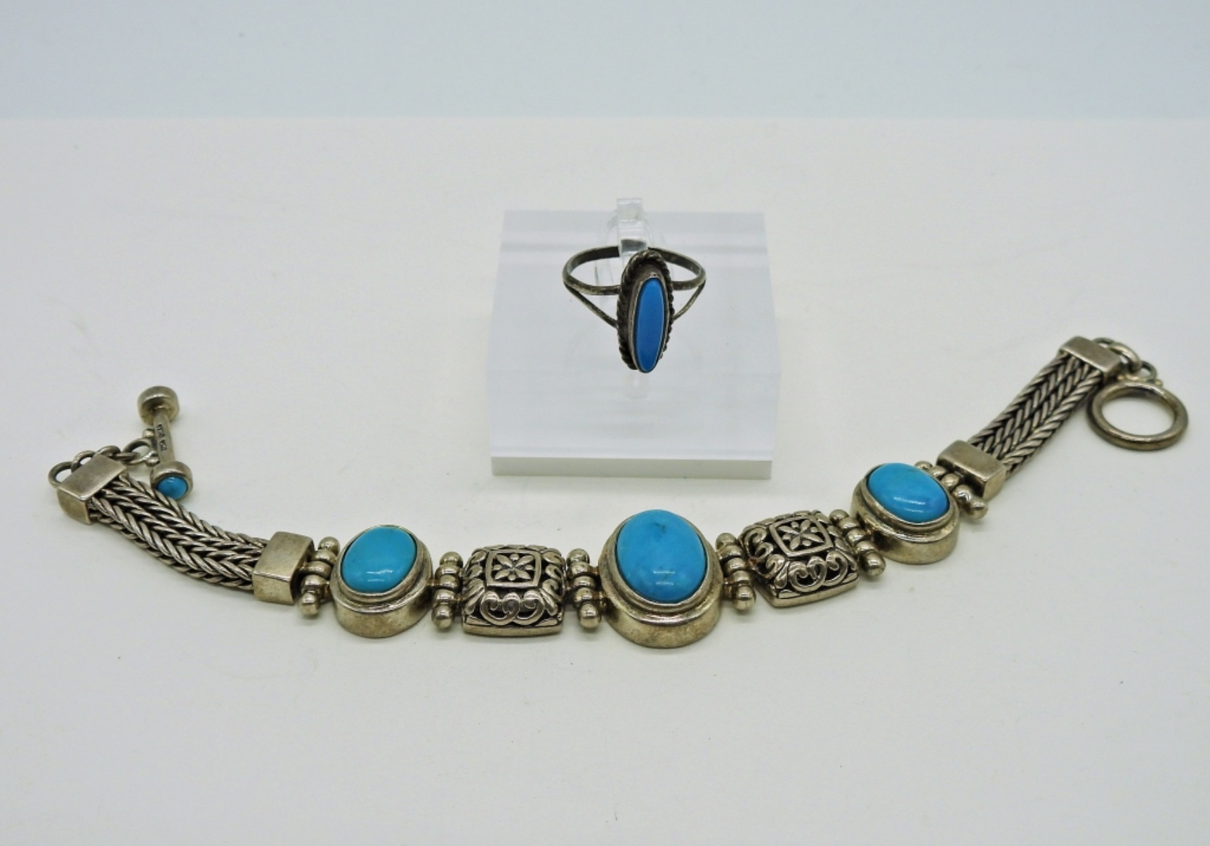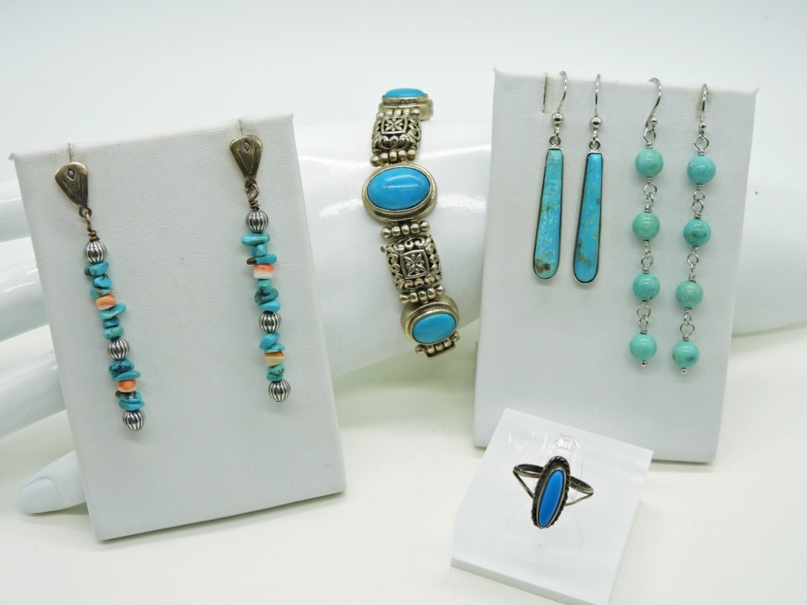 Sterling Silver & Turquoise Colored Gemstone Jewelry. Bracelet is 7″ marked 925 China. Vintage size 5 Ring. 3 Pair of Dangly Earrings. 28.8 DWT