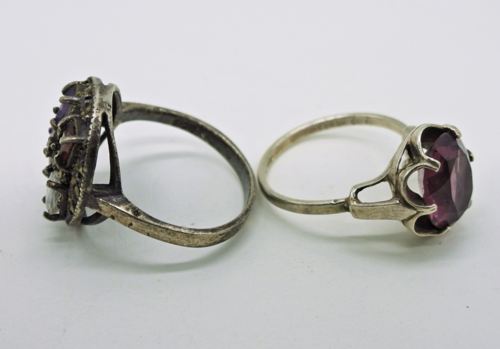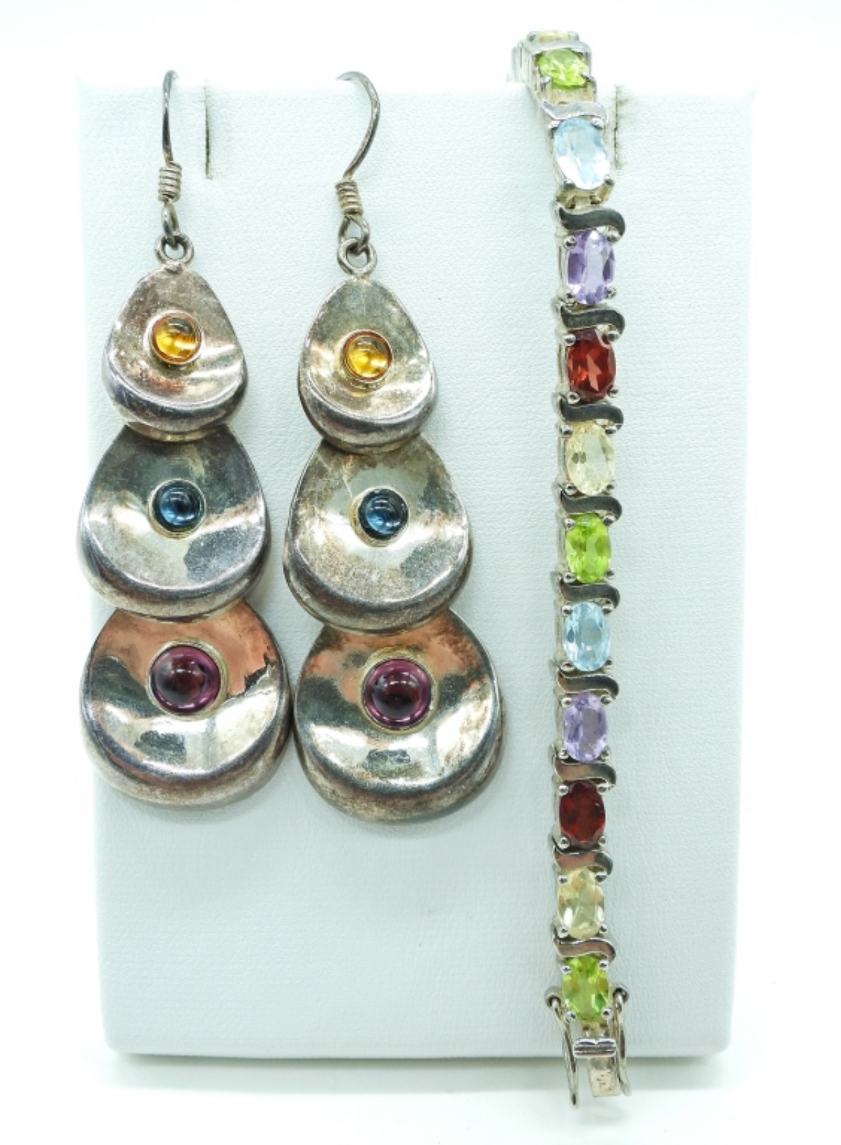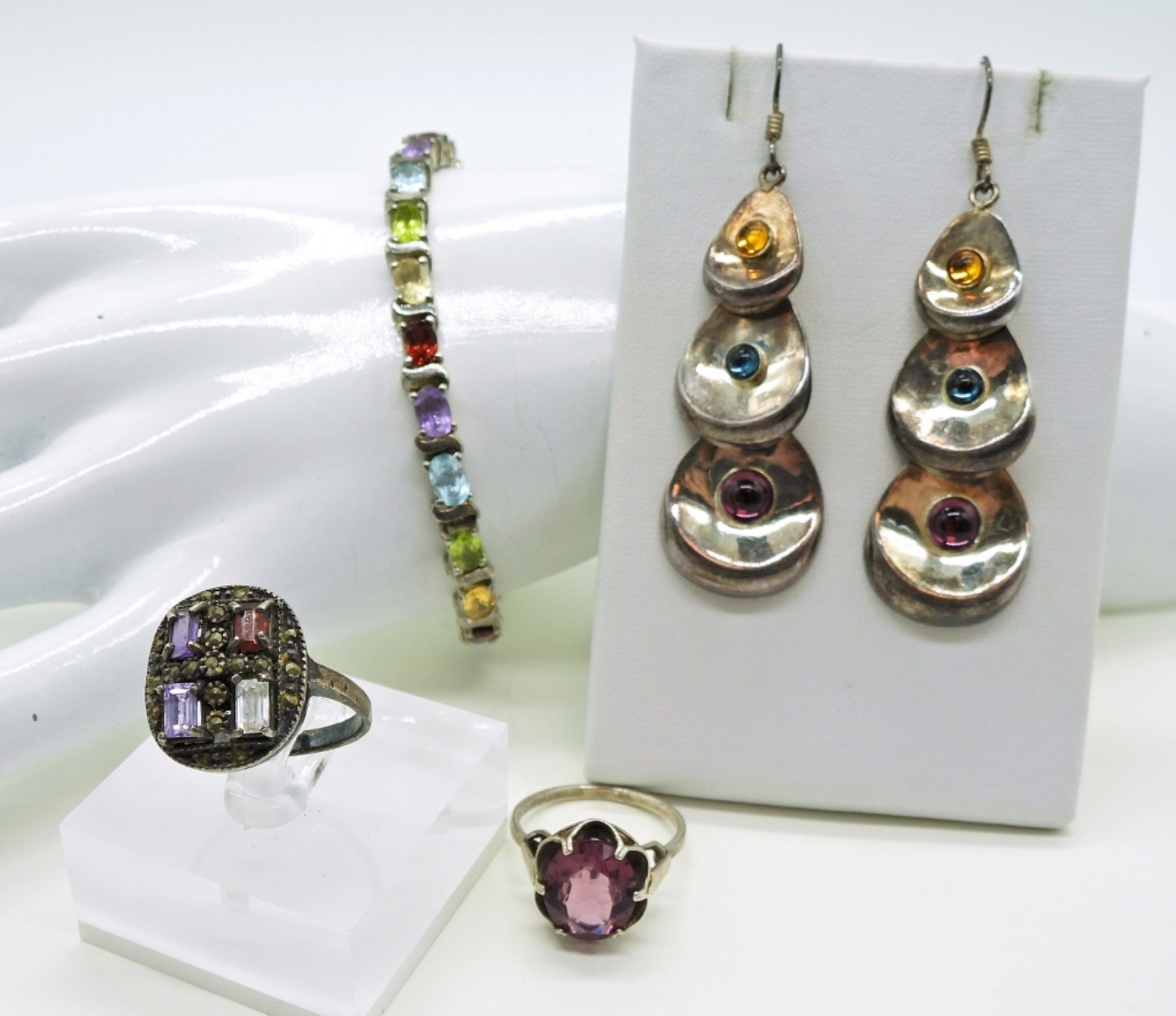 Sterling Bracelet with Colorful Gemstones, 7″ marked 925. Earrings with Colorful Gemstones marked “925 Thailand”, 2″ long. SARAH COVENTRY Sterling Ring with Purple Gemstone, Size 8. Sterling Ring with 4