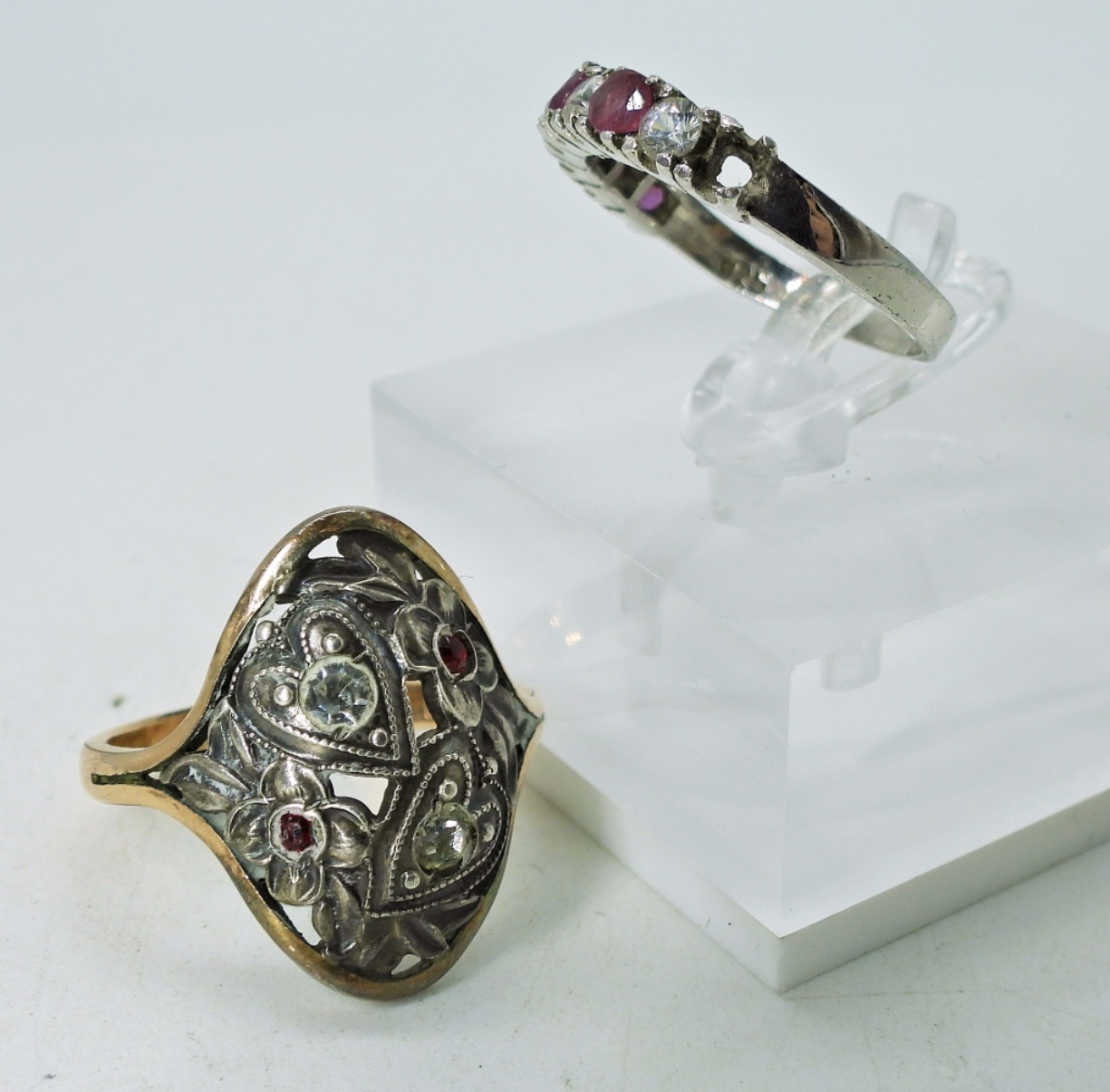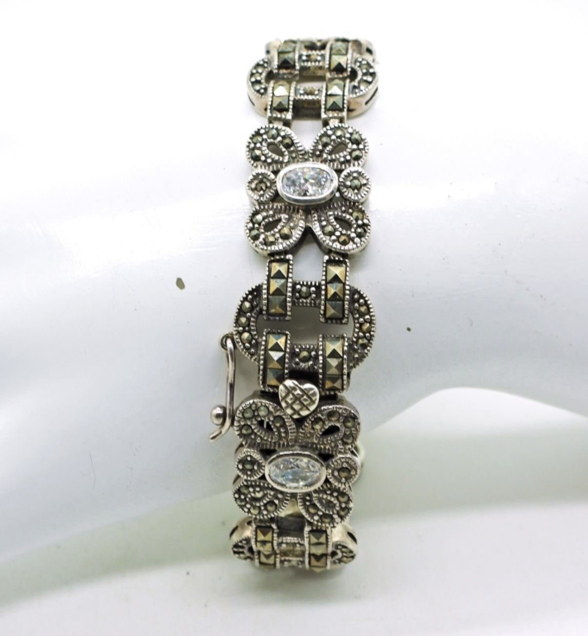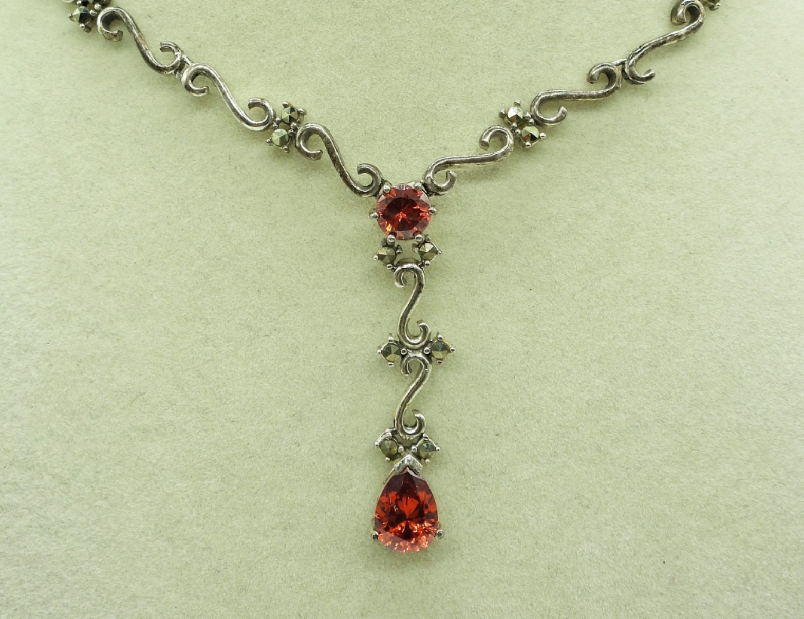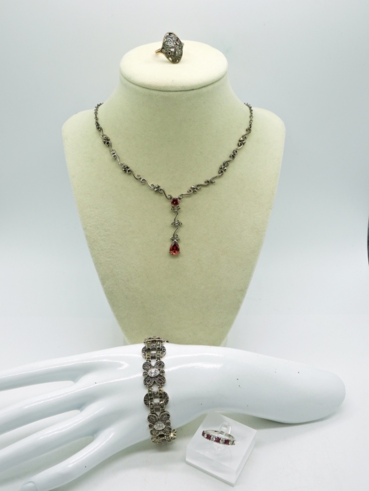 Sterling Gemstone and Marcasite Jewelry. Necklace is 19″ with Red Gemstones, Marked “925 CZ”. Bracelet is 7″ and Marked 925. Gemstone Band is a size 6.5 and missing a gemstone, marked 925. Filigree Style Ring is