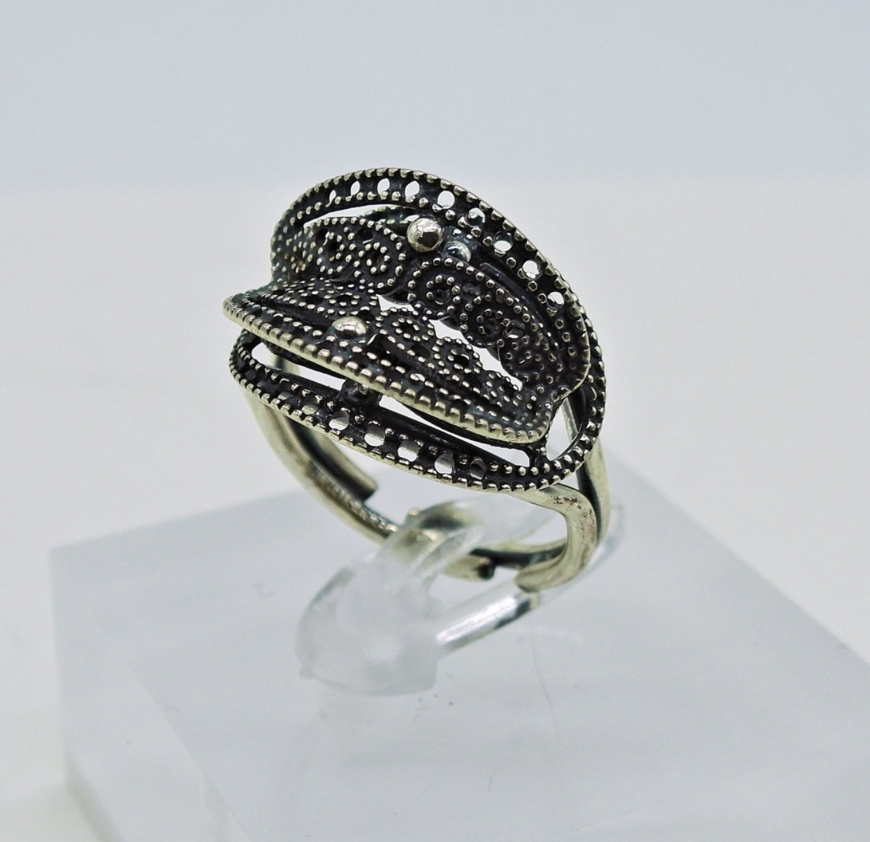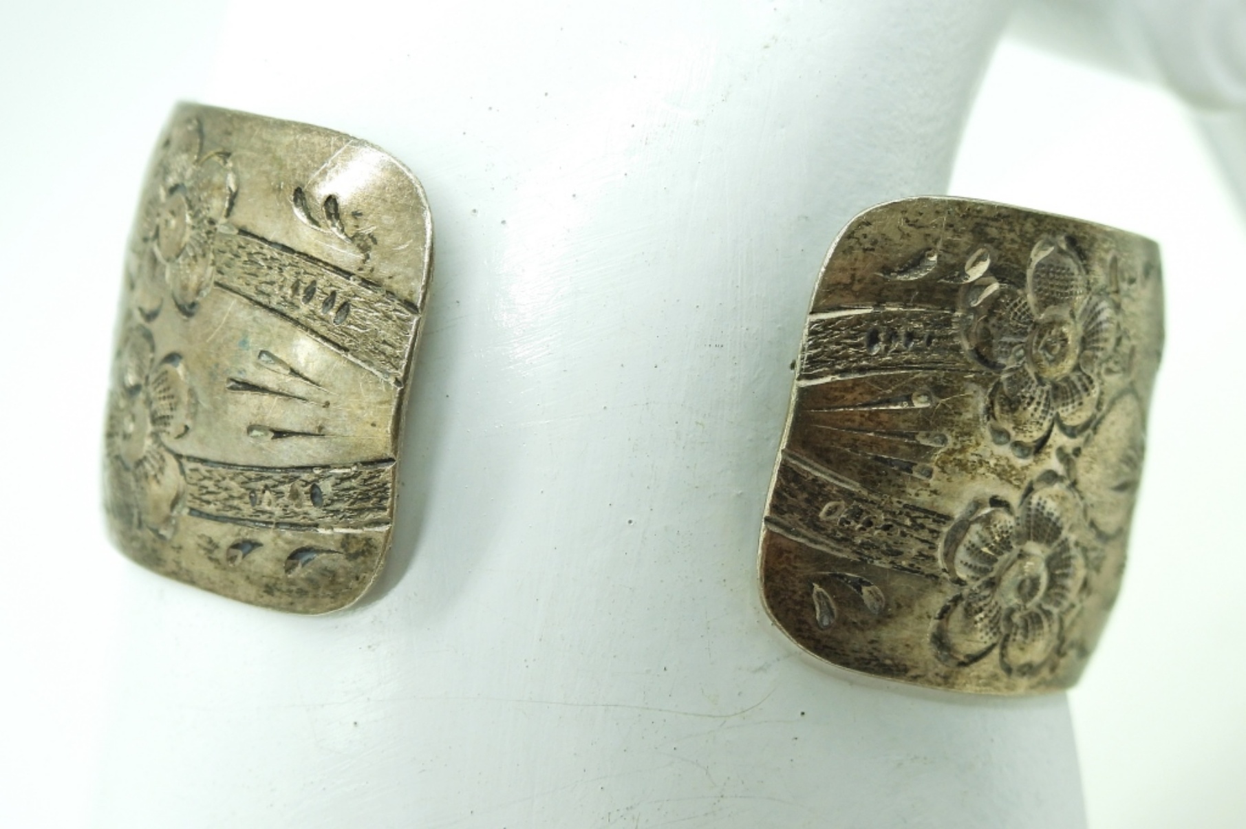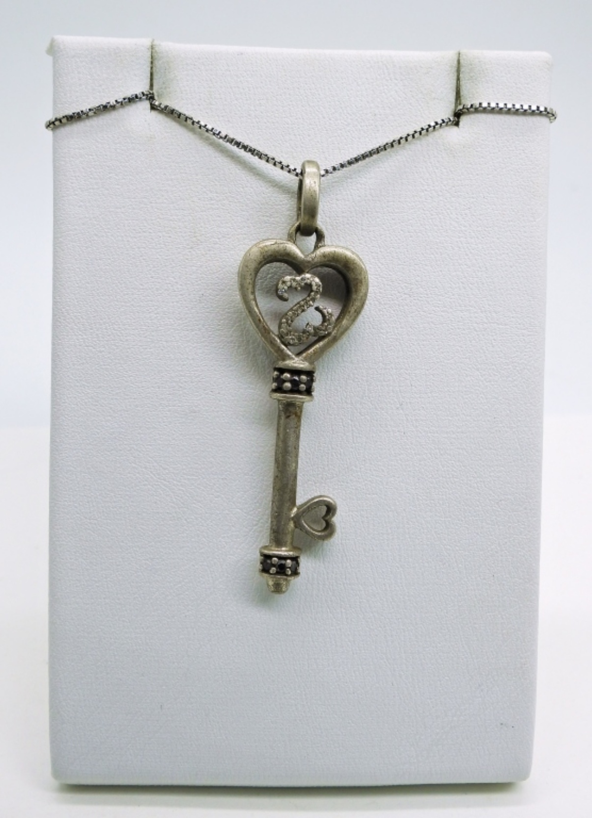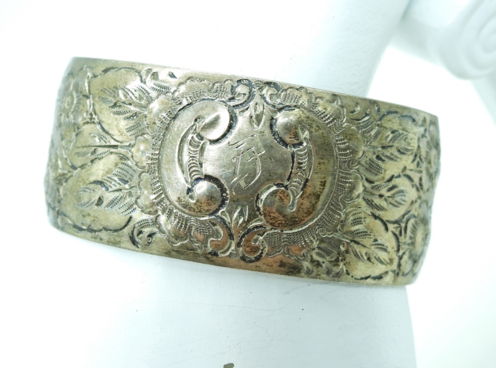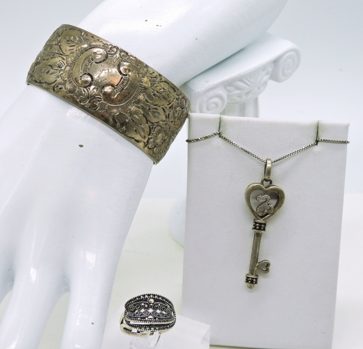 Sterling Open Heart Pendant on a 19″ Sterling Chain, Pendant is 2″ long. Sterling Cuff Style Bracelet with Engraved Flowers, 6″. Super Cute Sterling Ring, Size 6 adjustable. Marked Sterling or 925. 27.1 DWT