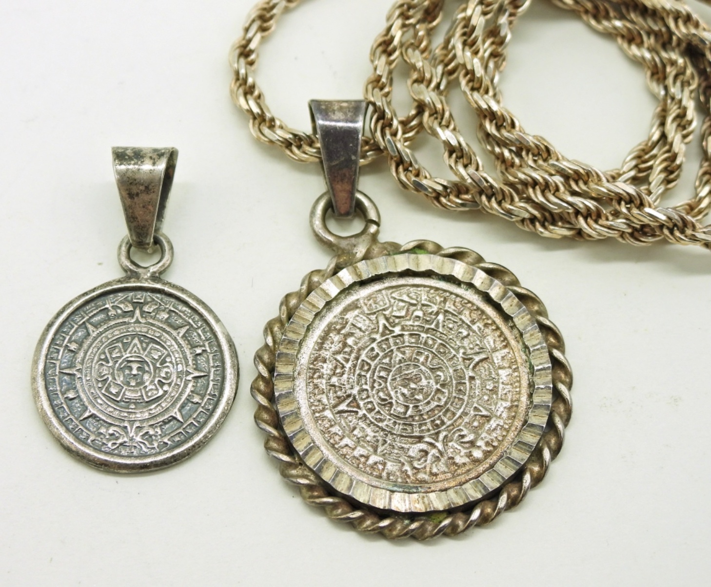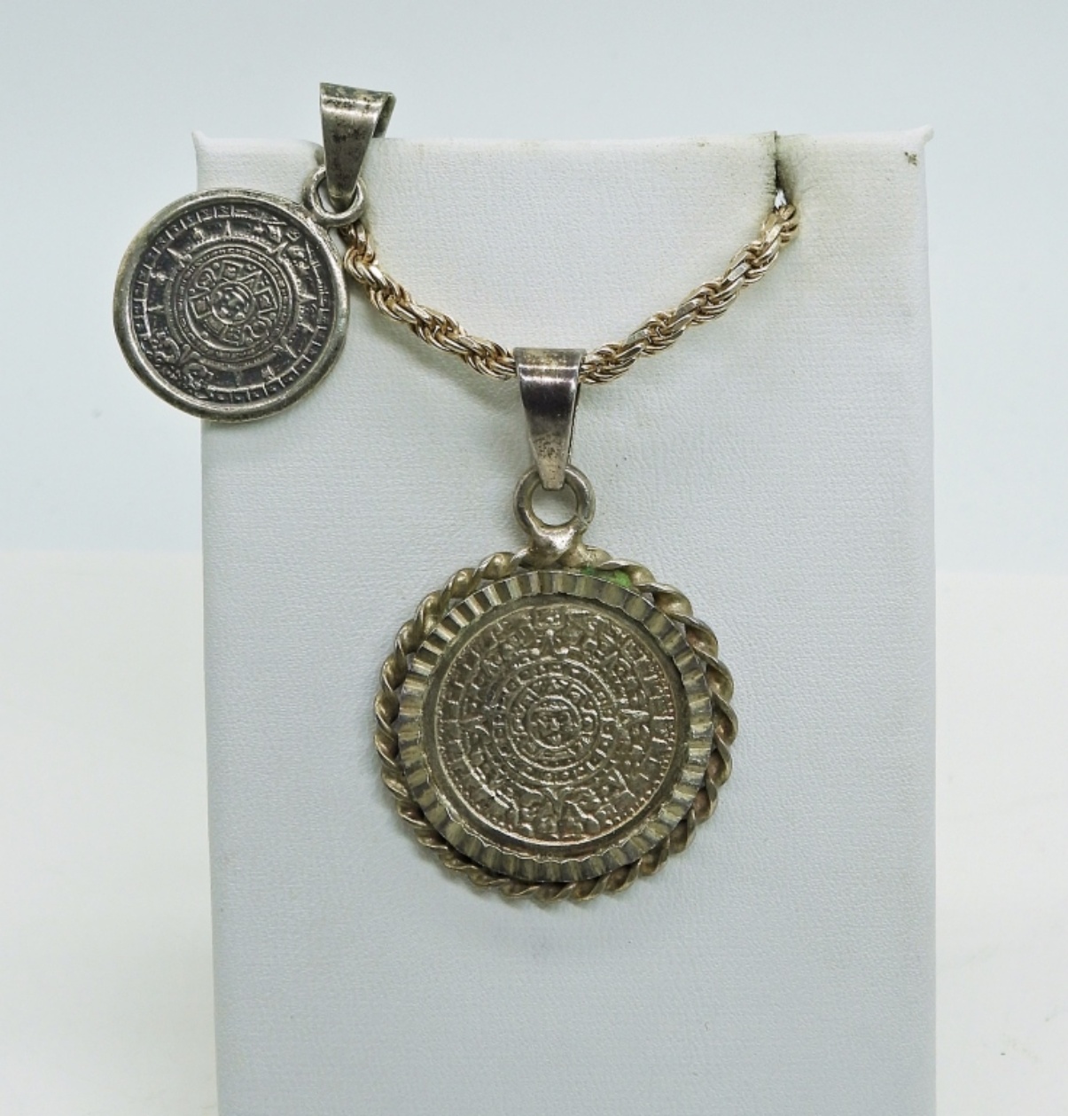 Two Sterling Mayan Calendar Pendants and a 20″ Sterling Chain. Stamped 925. 18.2 DWT