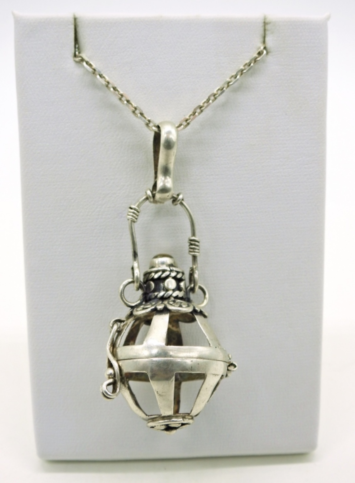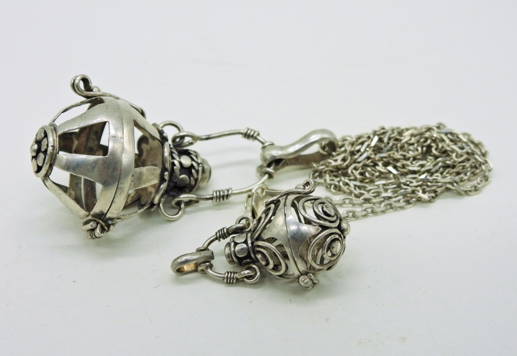Two Sterling “Cage” Pendants, One sterling chain 24″. Largest pendant is 2″x 1″. 13.3 DWT
