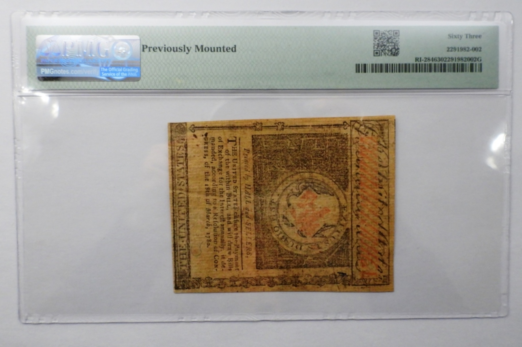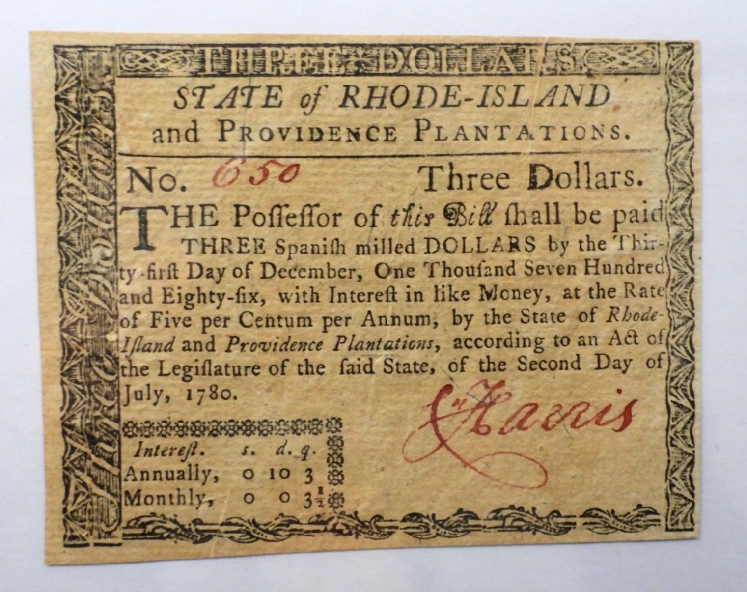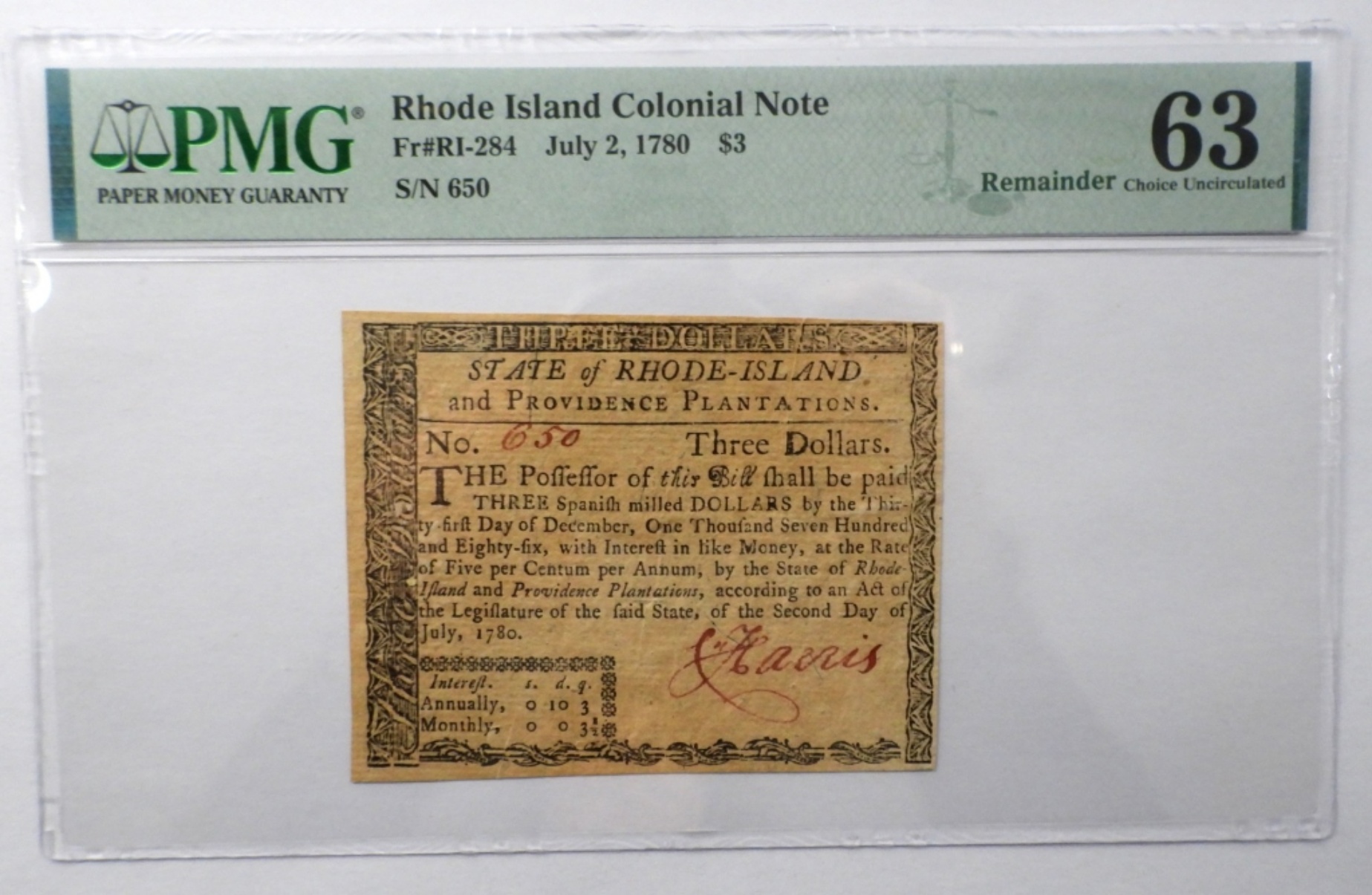 63 REMAINDER, CHOICE UNCIRCULATED, FR#RI-284, JULY 2, 1780, THREE DOLLARS, S/N 650