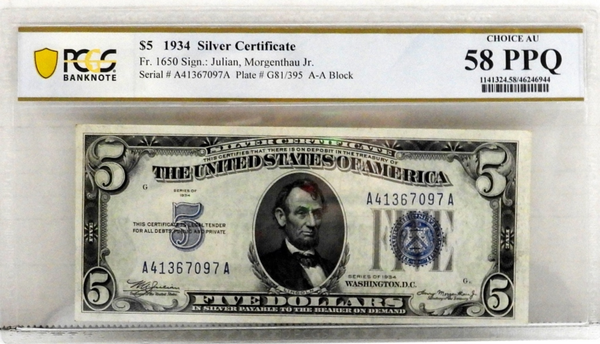 PCGS 58 PPQ $5 SILVER CERTIFICATE