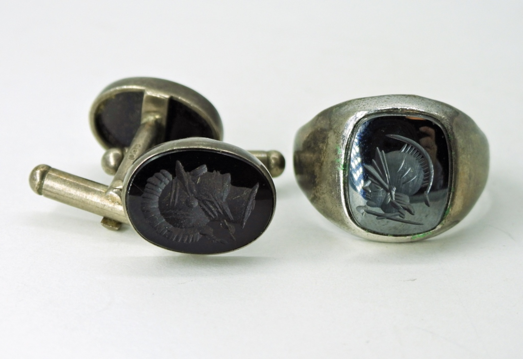 Vintage Roman Bust Ring and Cuff Links, Ring is Marked Sterling. Ring Size 9. 10 DWT