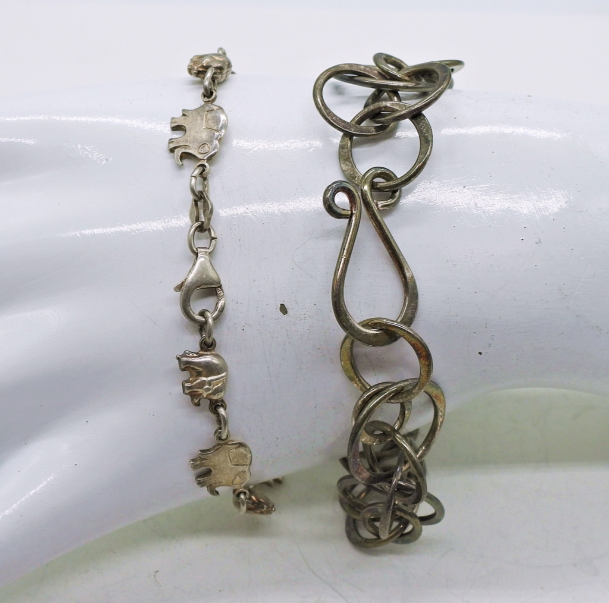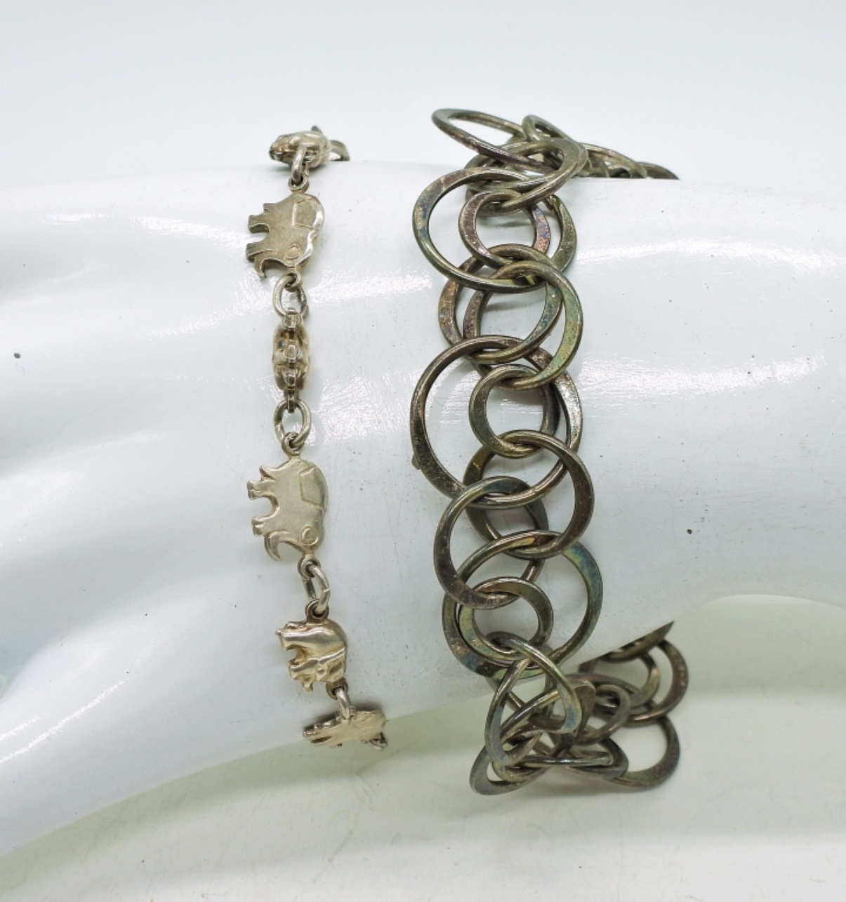 Two Lovely Vintage Sterling Bracelets, Elephants and Circles. 7″ & 7.5″. 18 DWT