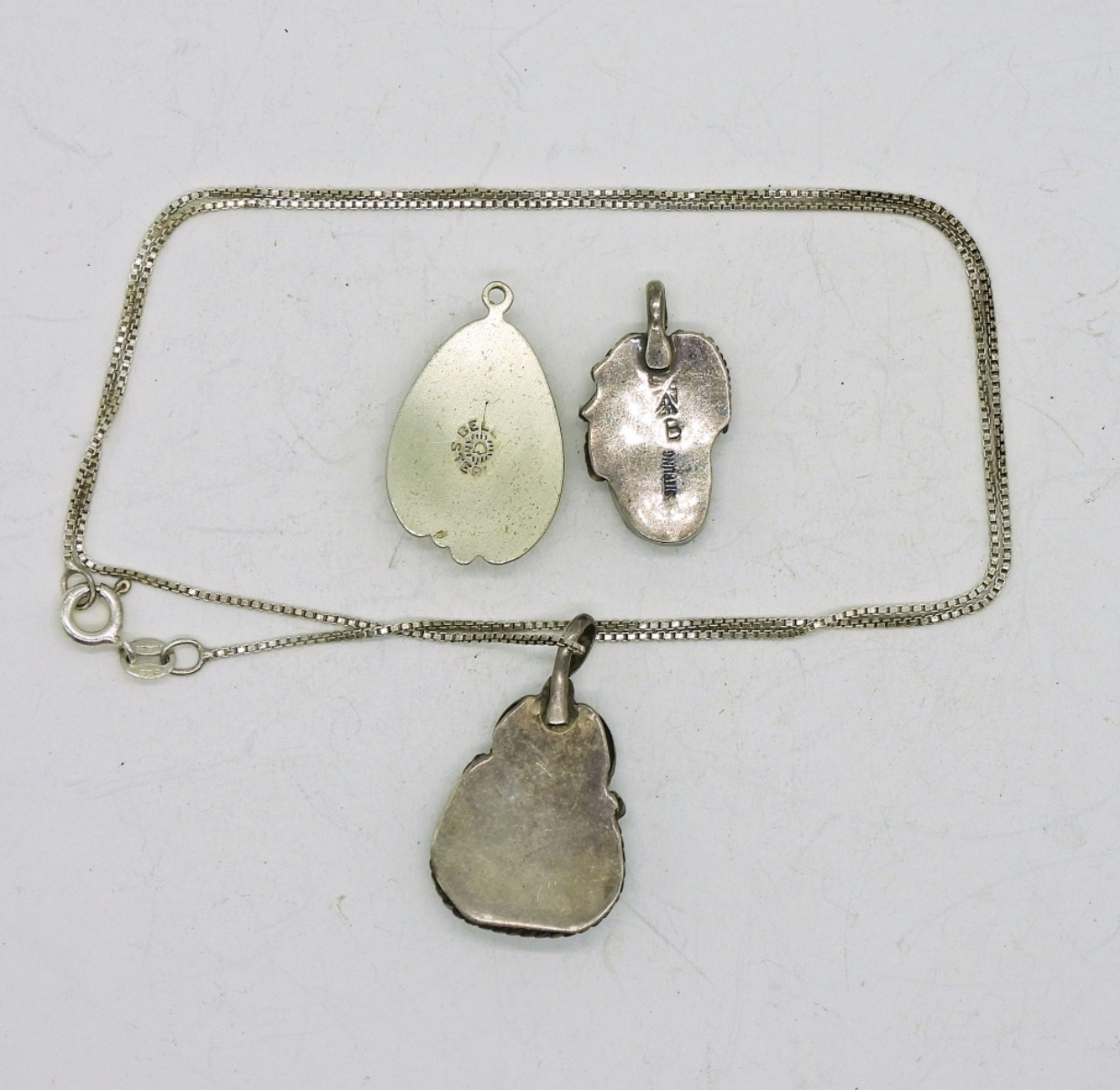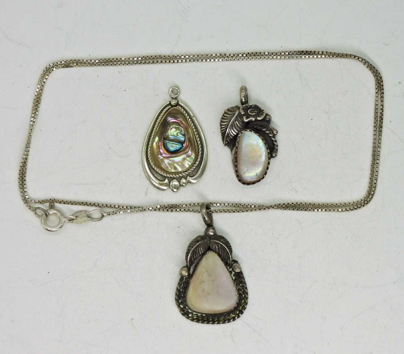 Three Sterling Silver Pendants (Mother of Pearl & Abalone) and an 18″ Chain. 8.1 DWT