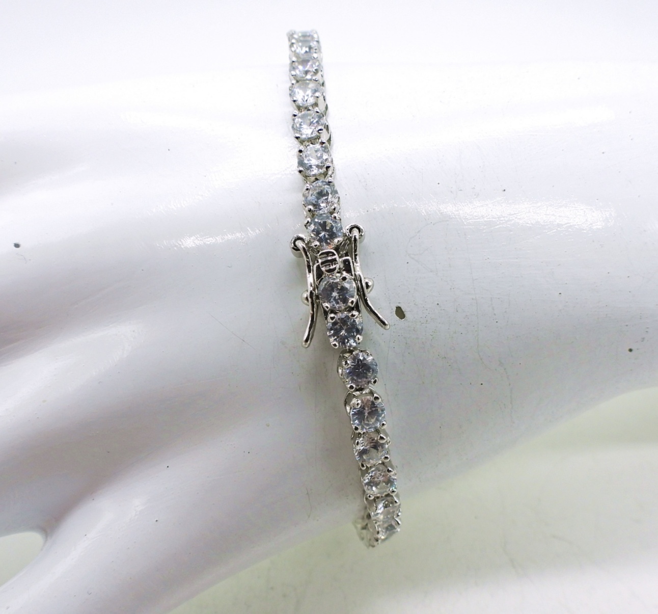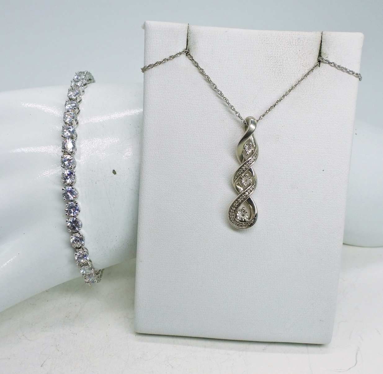 Sterling Tennis Bracelet with Diamond Colored Gemstones, 7.5″, Sterling 3 Stone Necklace with Diamond Colored Gemstones, 18″ Chain. Marked 925. 9.9 DWT