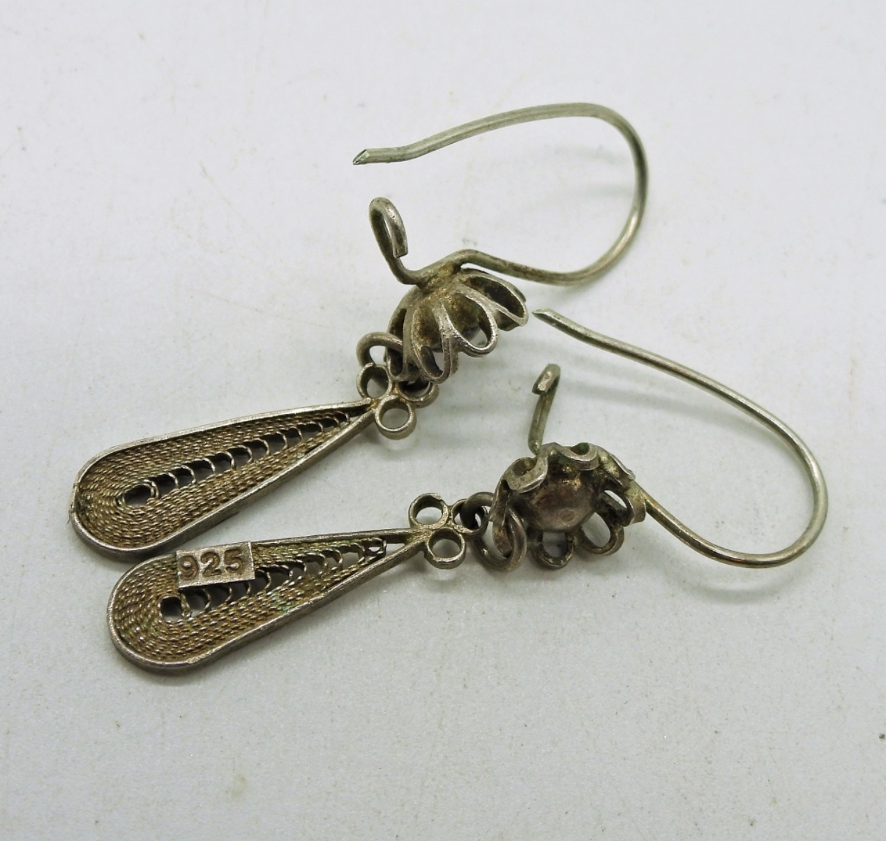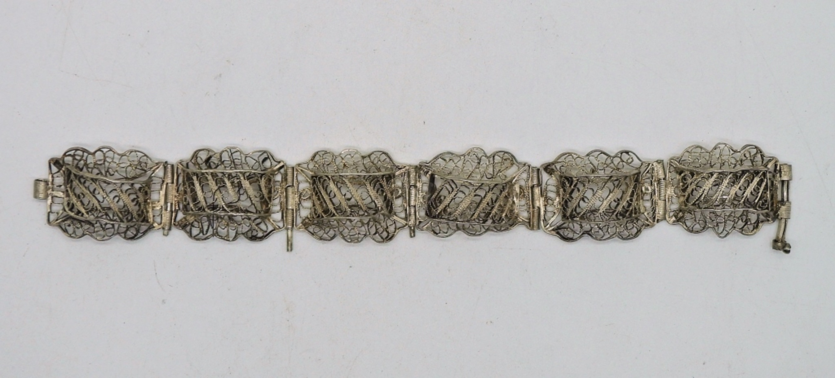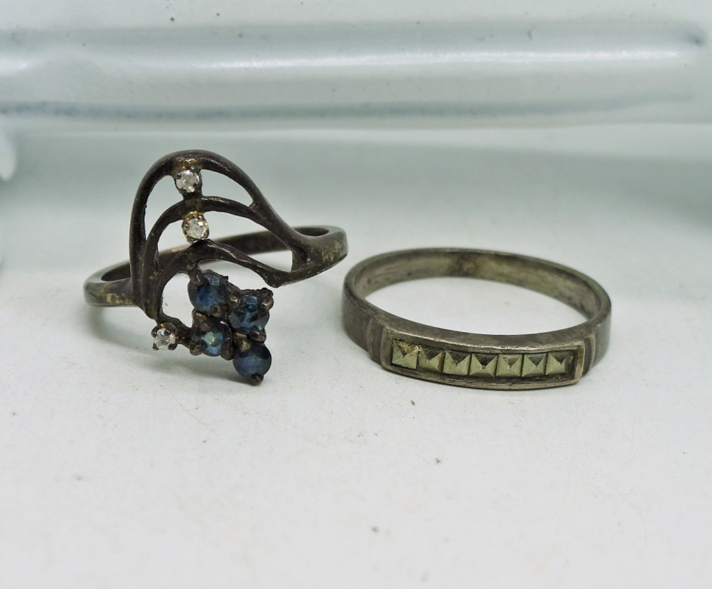 Vintage Sterling Silver Filigree Bracelet & Earrings, Bracelet is 6 1/4″. There is a clasp and it does work, its just unusual. Two Sterling Rings, One with marcasite and one with blue and clear gemstones. Sizes 6.5