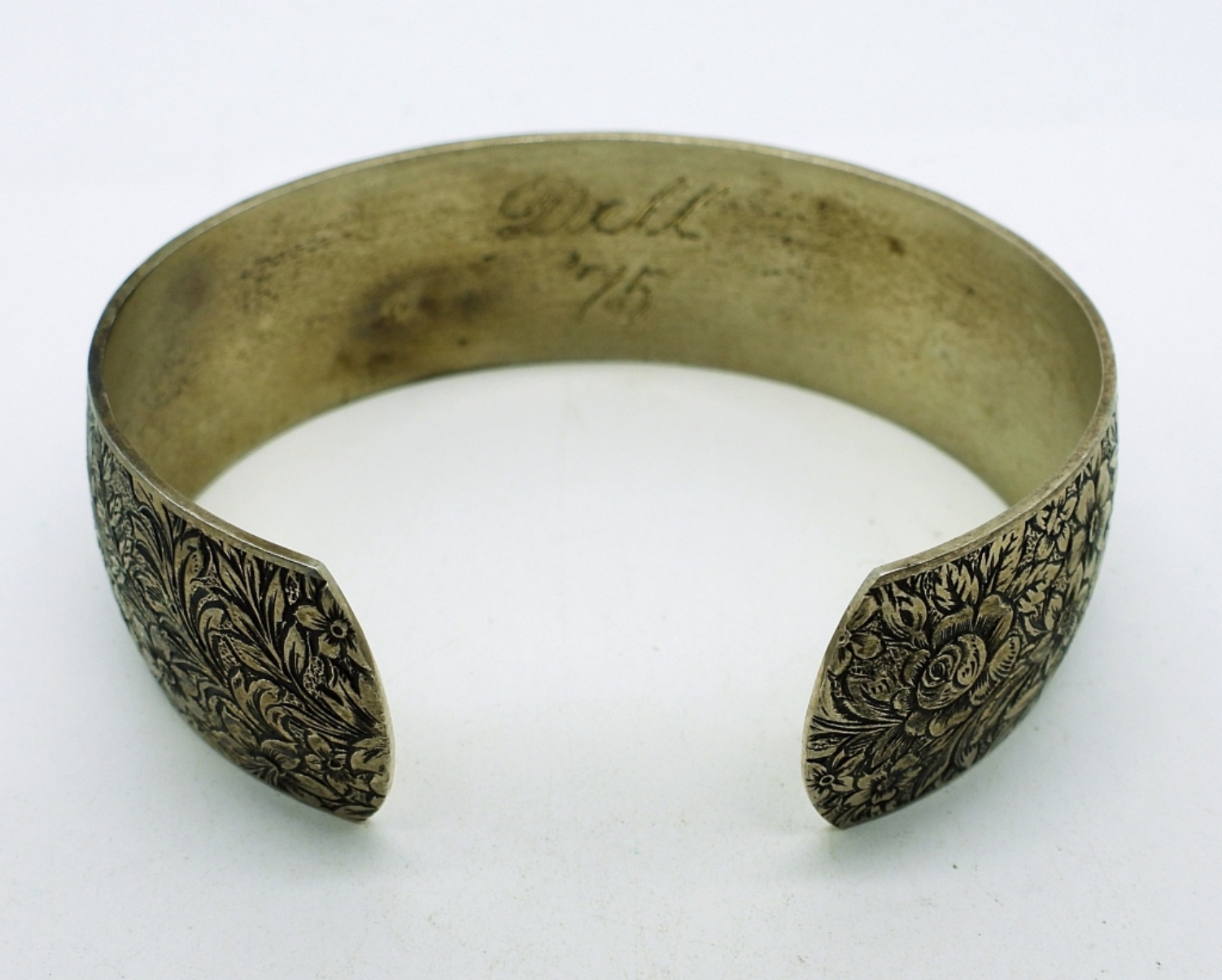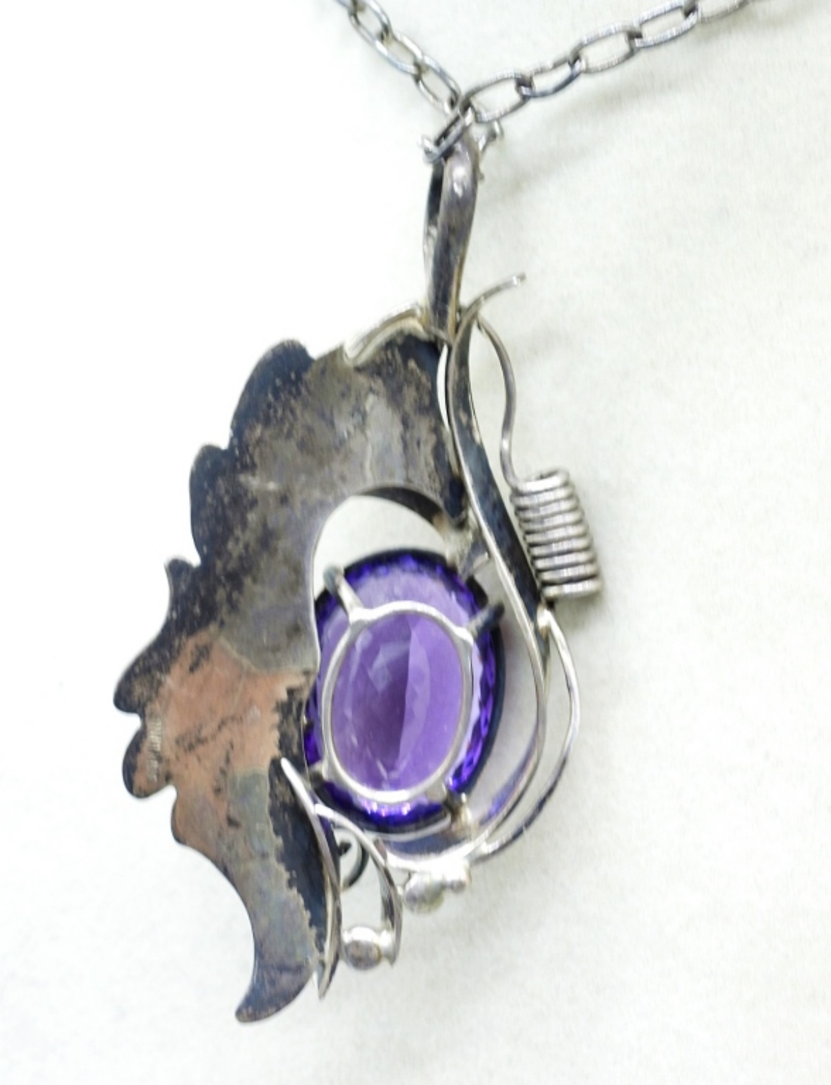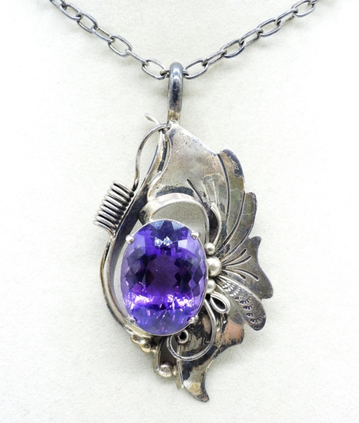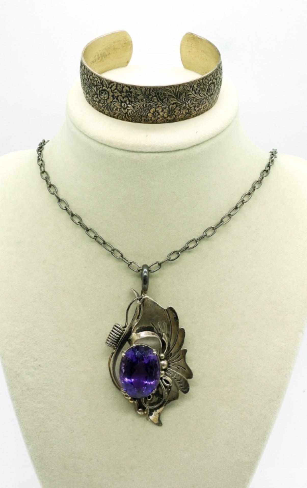 Gorgeous Sterling Silver Hand made Pendant with very large purple gemstone on a 22″ Sterling Chain. Pendant is 3″x 1.5″. Sterling bracelet, fully etched with flowers marked “Hayward Sterling” and engraved inside