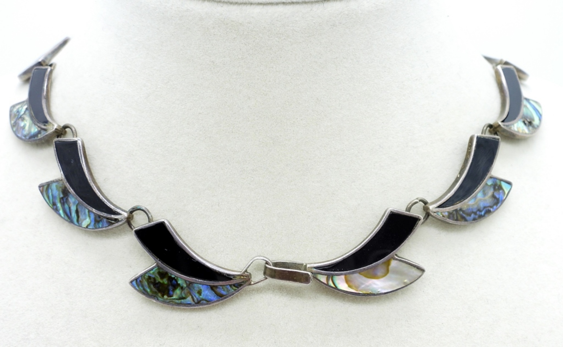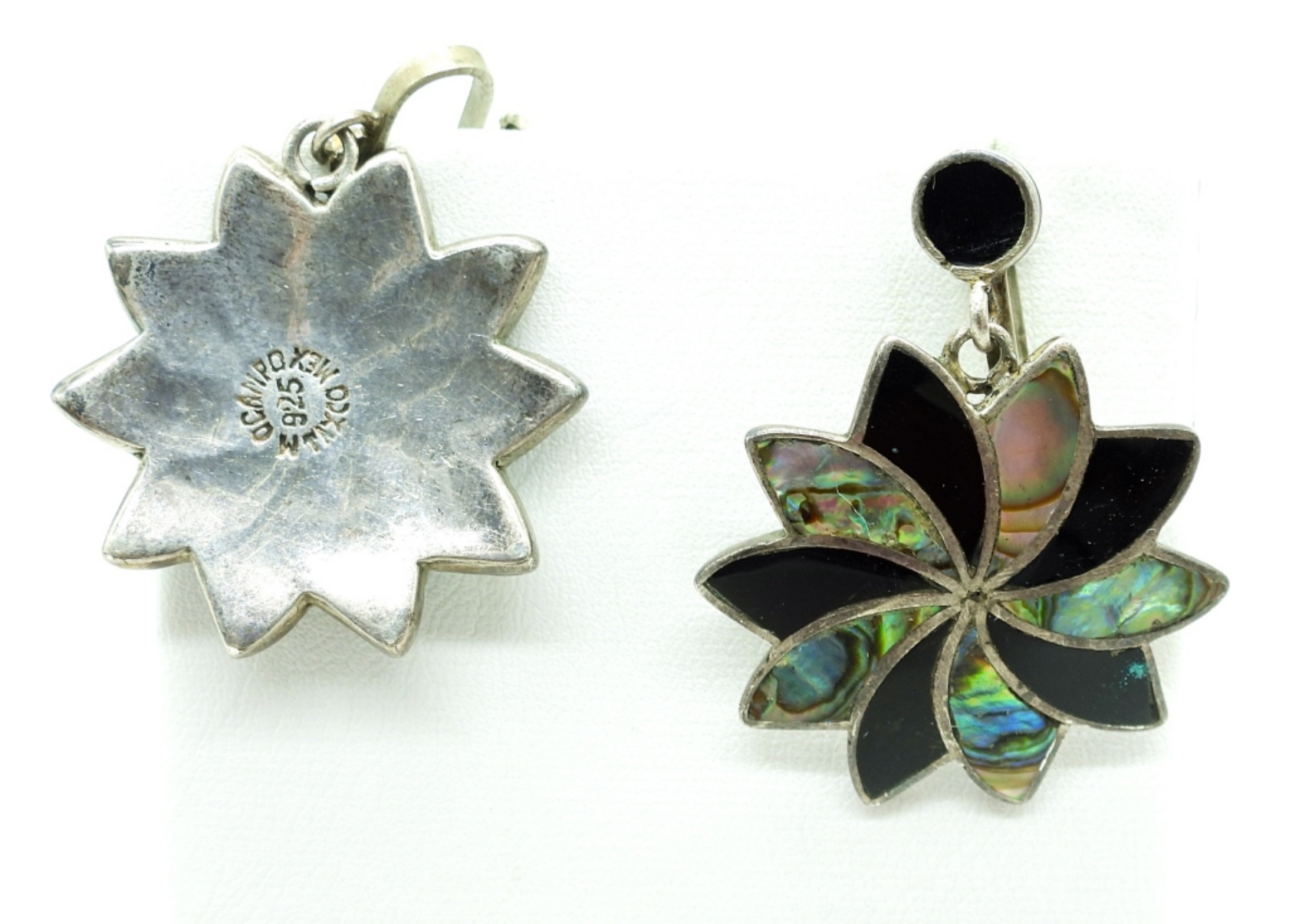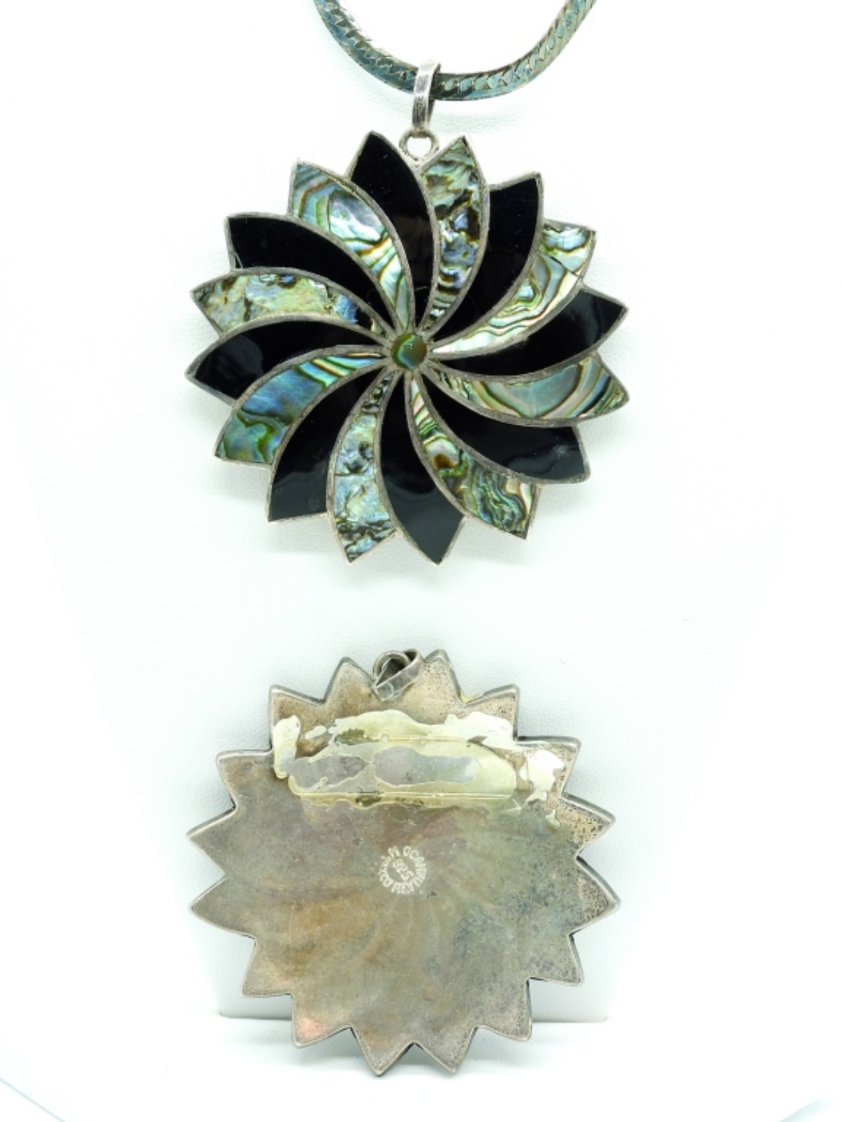 Vintage Sterling Abalone Onyx Pinwheel Set, Taxco. Screw Back Earrings, Necklace 15″, Two Pendants (one is also a brooch) 2″, Sterling chain 22″. 65.5 DWT