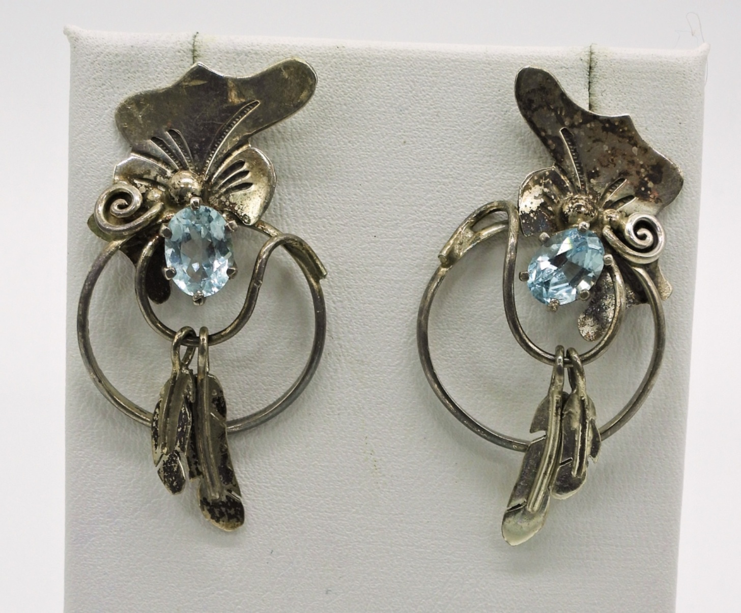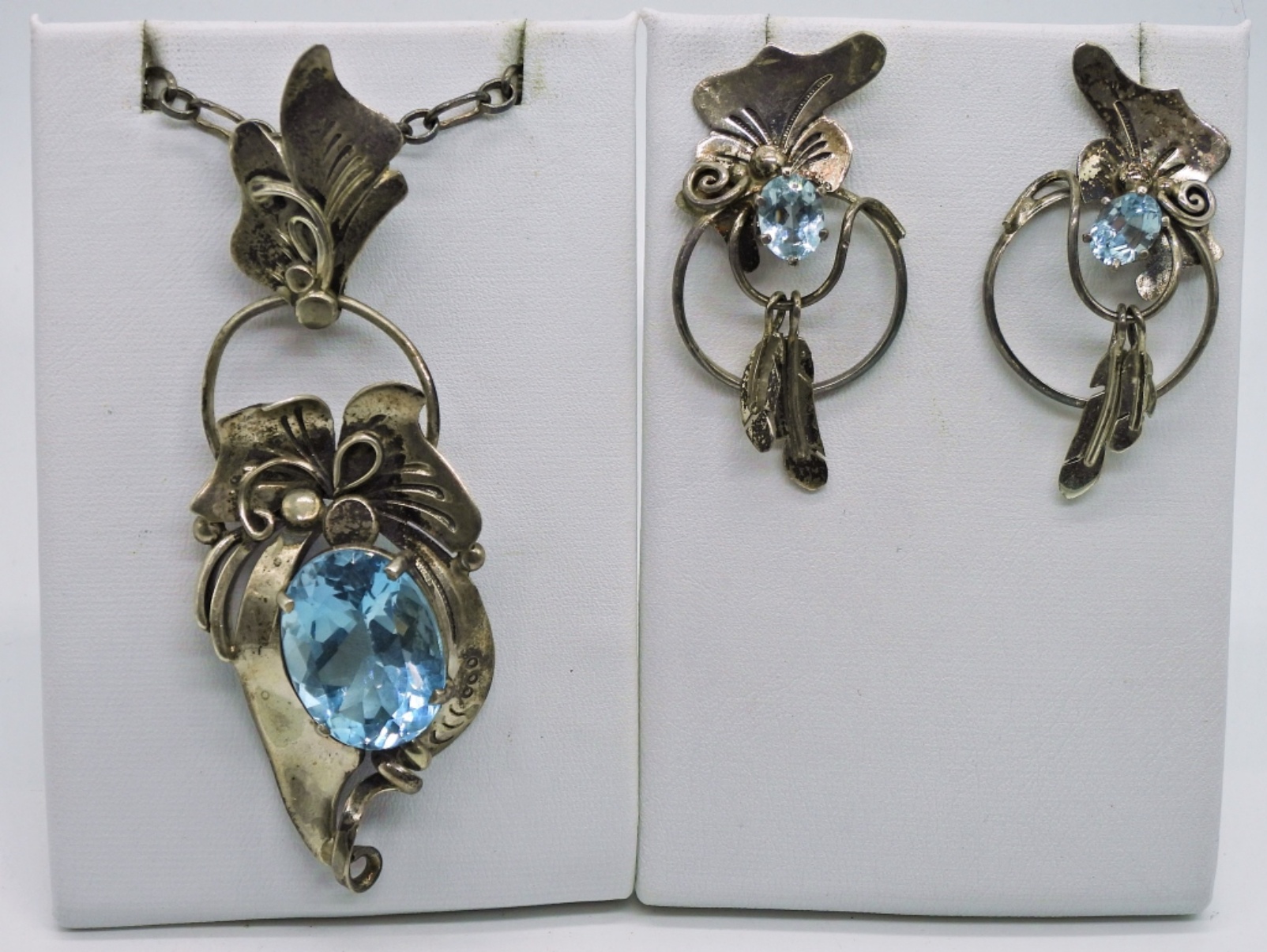 Sterling Silver, Native American Hand made Necklace and Earrings with Blue Topaz Gemstones. Chain is 24″. Marked “HS”. 25.5 DWT