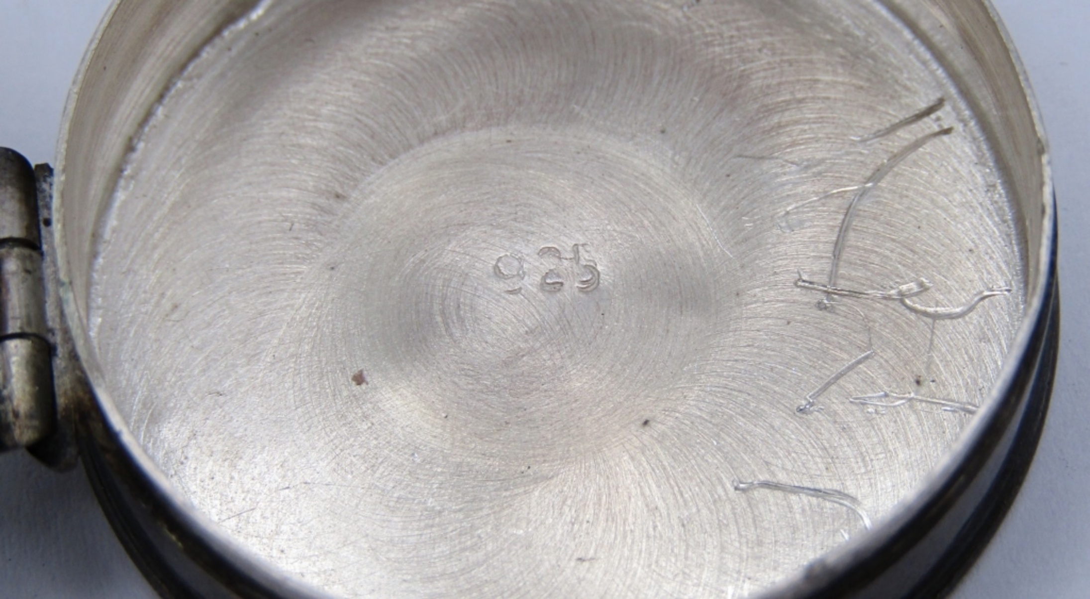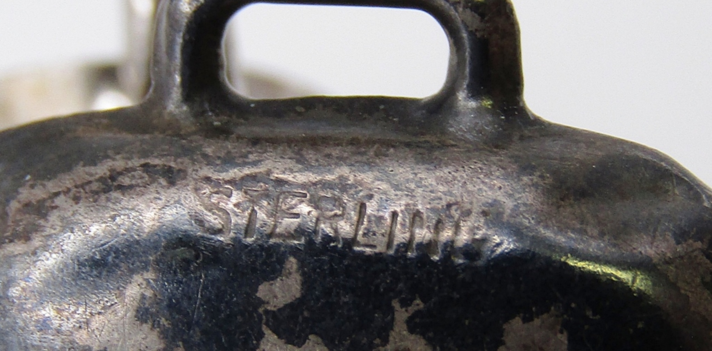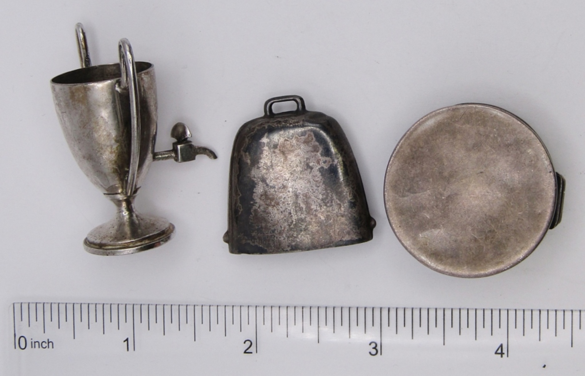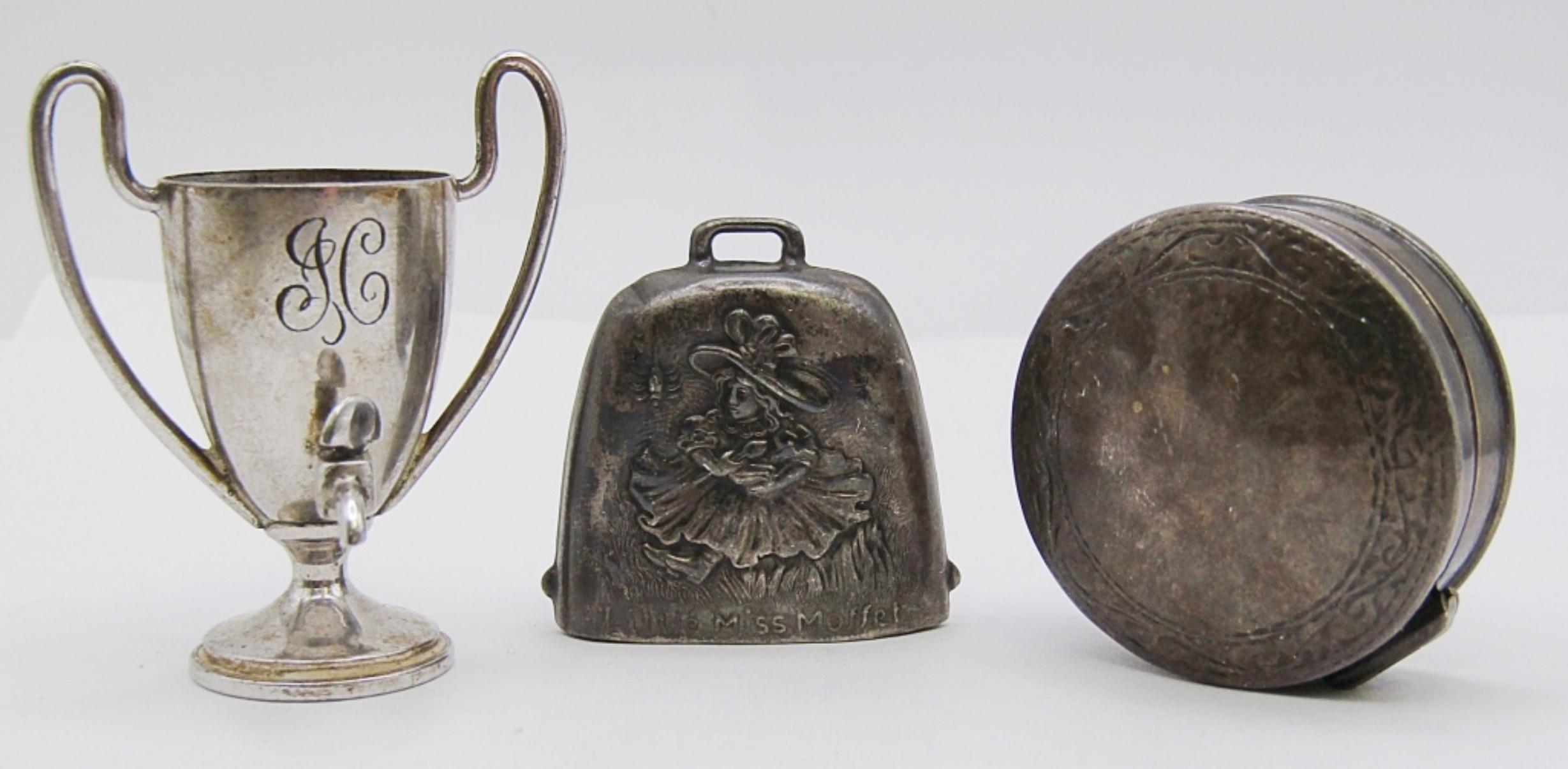 24 DWT. PILL BOX STAMPED 925, LITTLE MISS MUFFET BELL & “JC” TROPHY BOTH STAMPED STERLING.