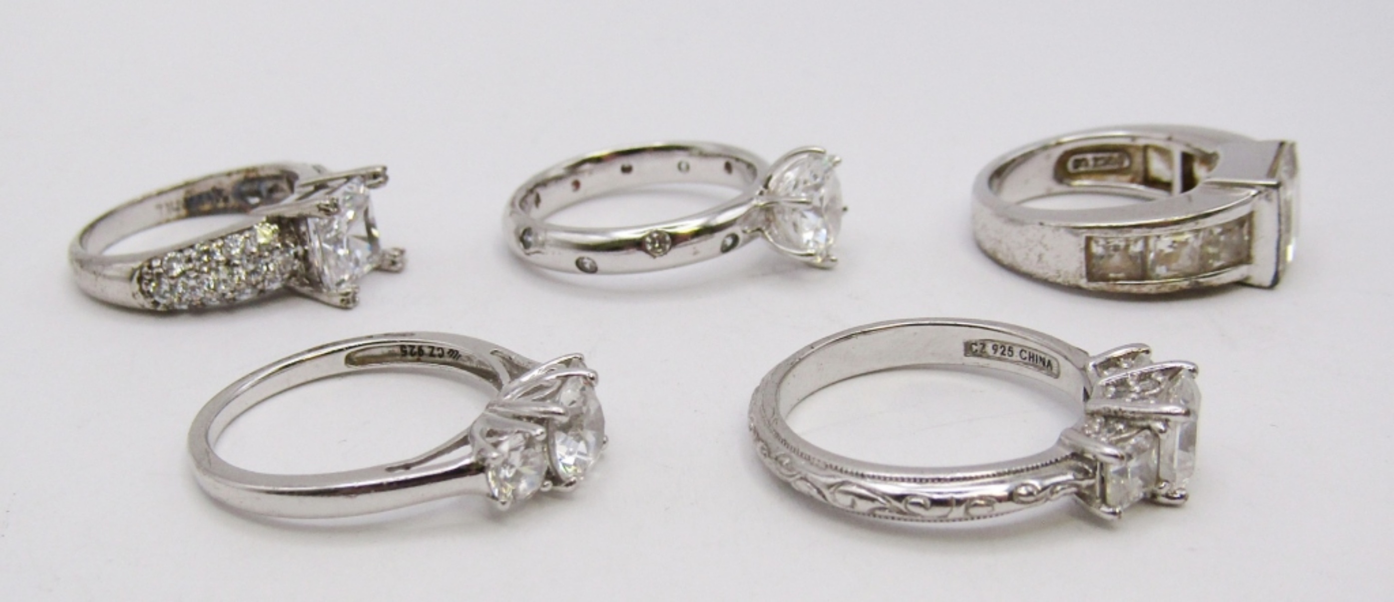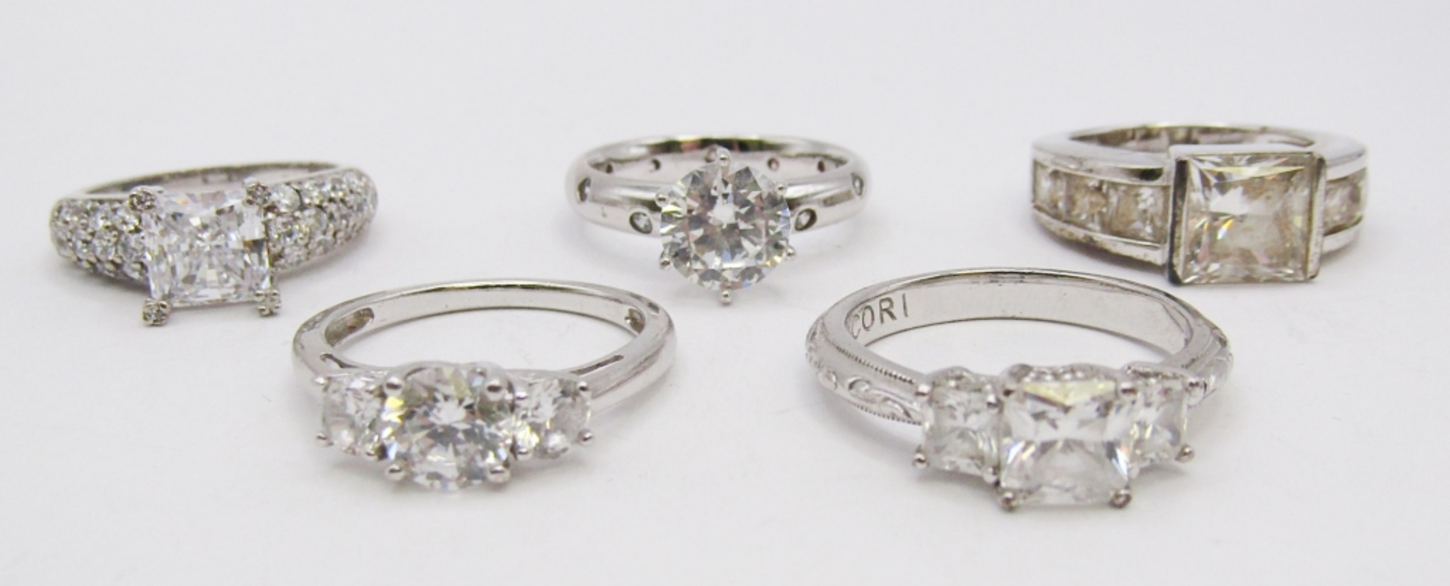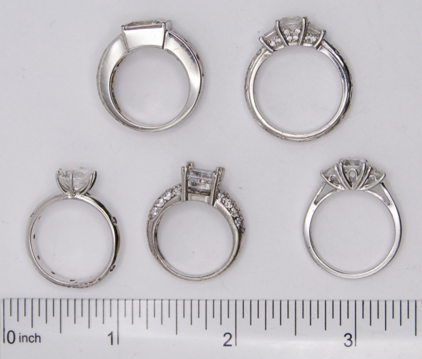 15 DWT. (4) CUBIC ZIRCONIA. ALL STAMPED. SIZES: 8.25, 6, 6.5, 7.5, 7