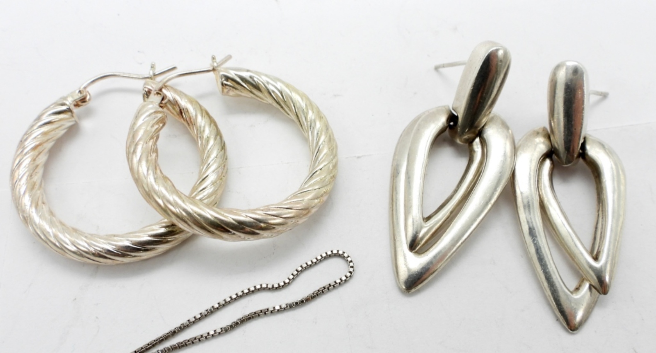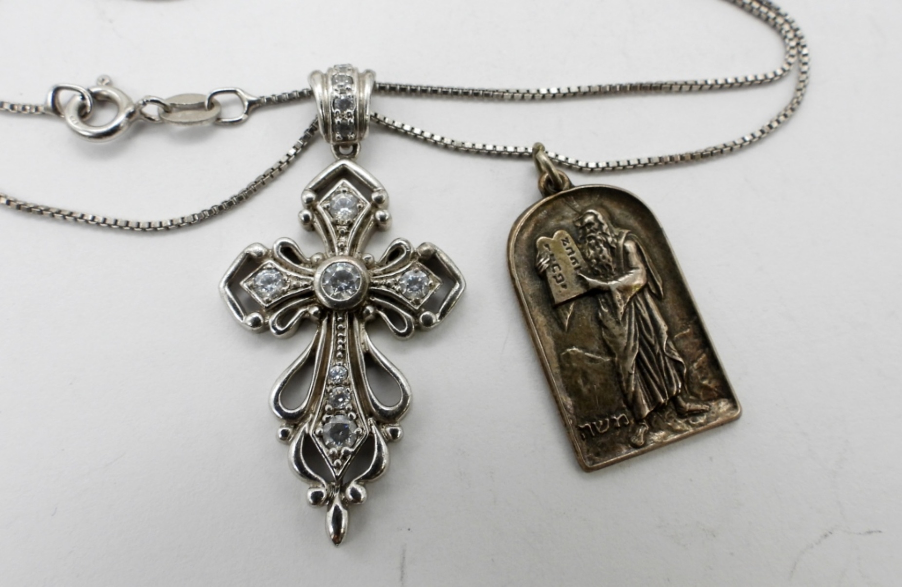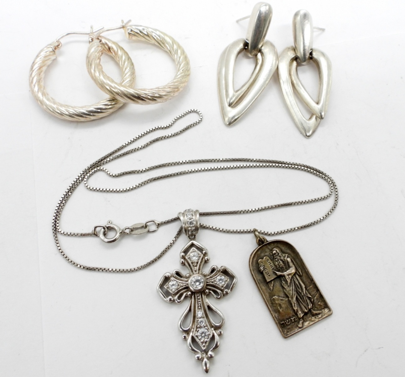 18.3 DWT. ALL STAMPED 925. (2) PAIRS OF PIERCED EARRINGS, (1) RELIGIOUS PENDANT, & (1) 18″ CROSS NECKLACE.