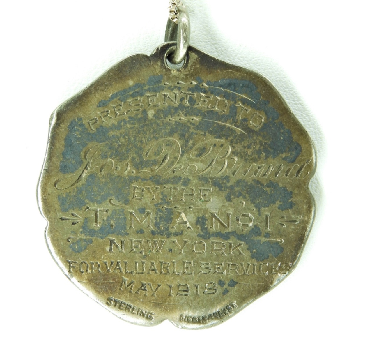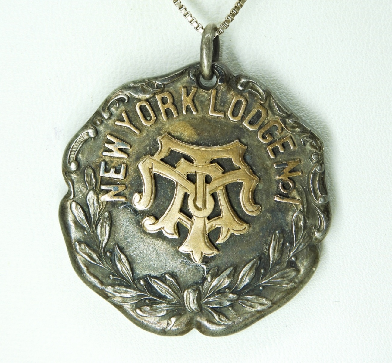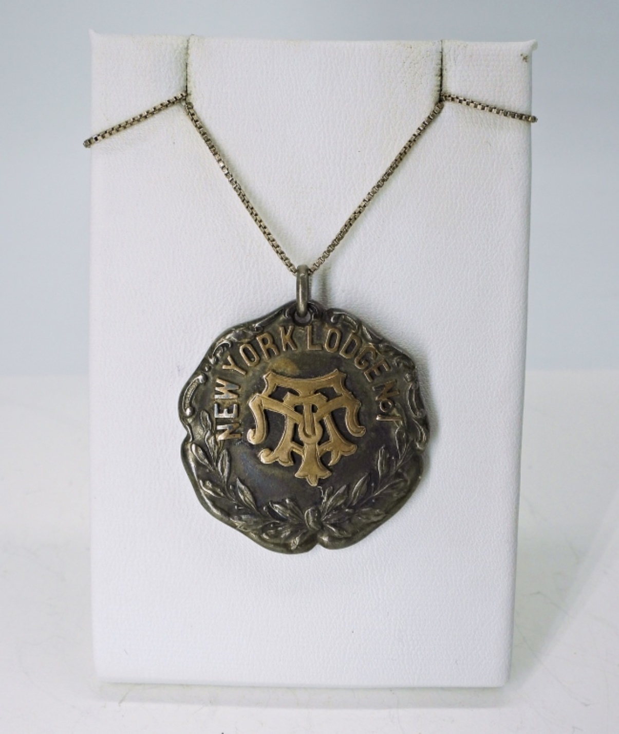 Sterling New York Lodge No 1 Pendant. Back reads: Presented to J. DeBrand By the T.M.A. No 1 New York For Valuable Services May 1918. 18″ Chain. 15.6 DWT