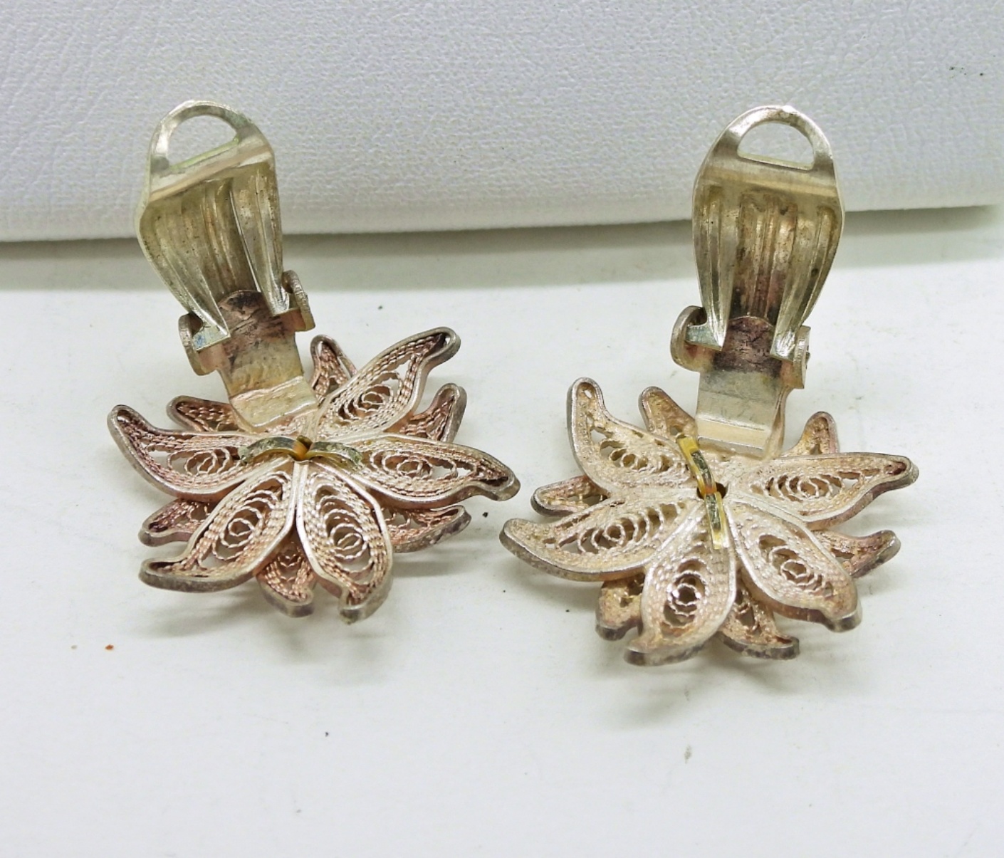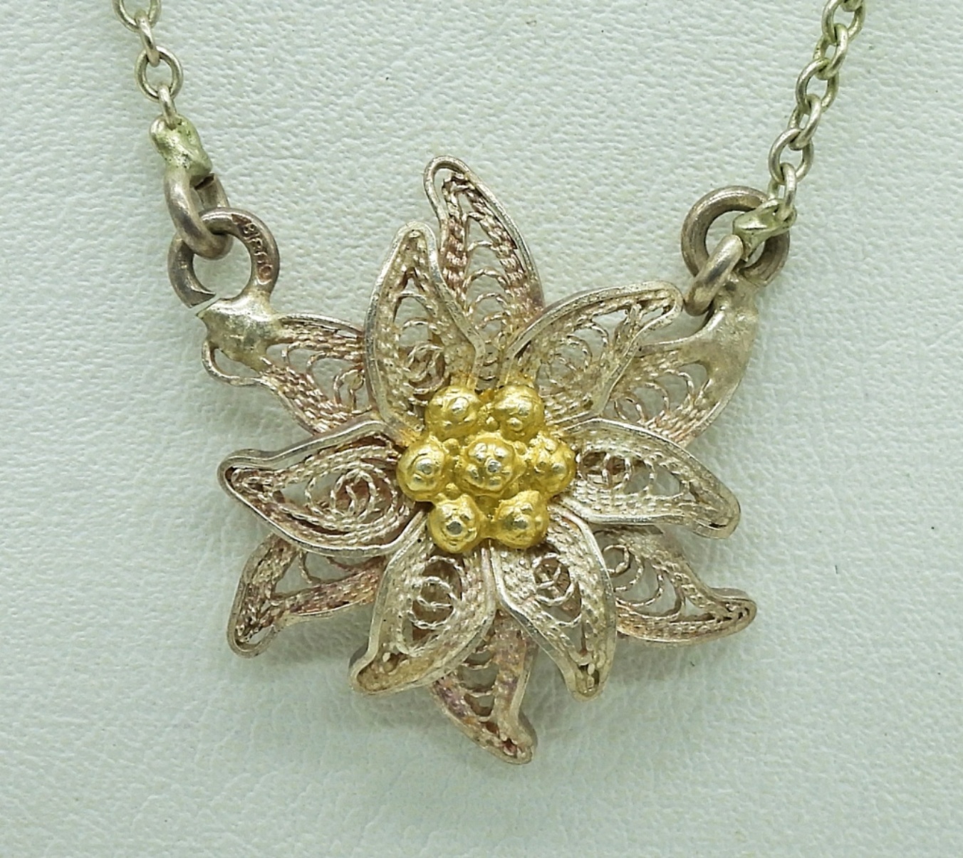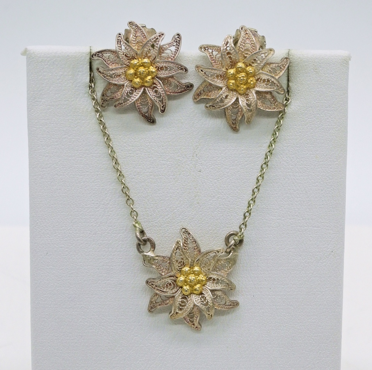 Vintage Silver Flower Necklace & Earring Set. Marked “800”. Necklace is 15″ Long. Earrings are Clip Ons. 4.7 DWT