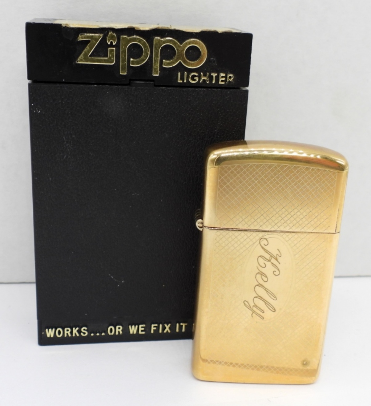 ENGRAVED “KELLY” IN THE MIDDLE, UNFIRED, IN A ZIPPO BOX
