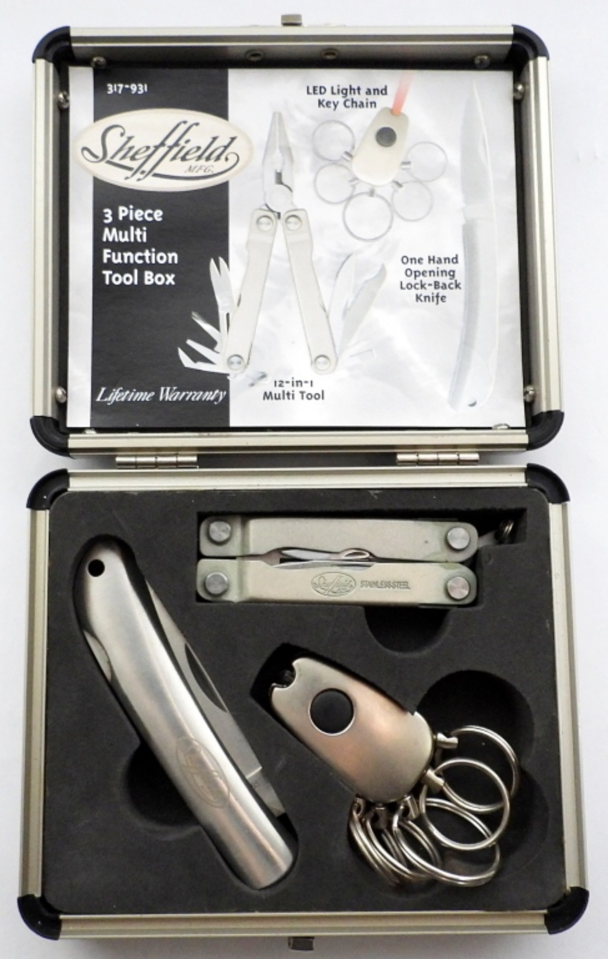 NEW! SHEFFIELD 3 PIECE MULTI FUNCTION TOOL BOX 317-931, LOCK-BACK KNIFE, 2-IN-1 MULTI TOOL, LED LIGHT & KEYCHAIN – BRAND NEW IN BOX!