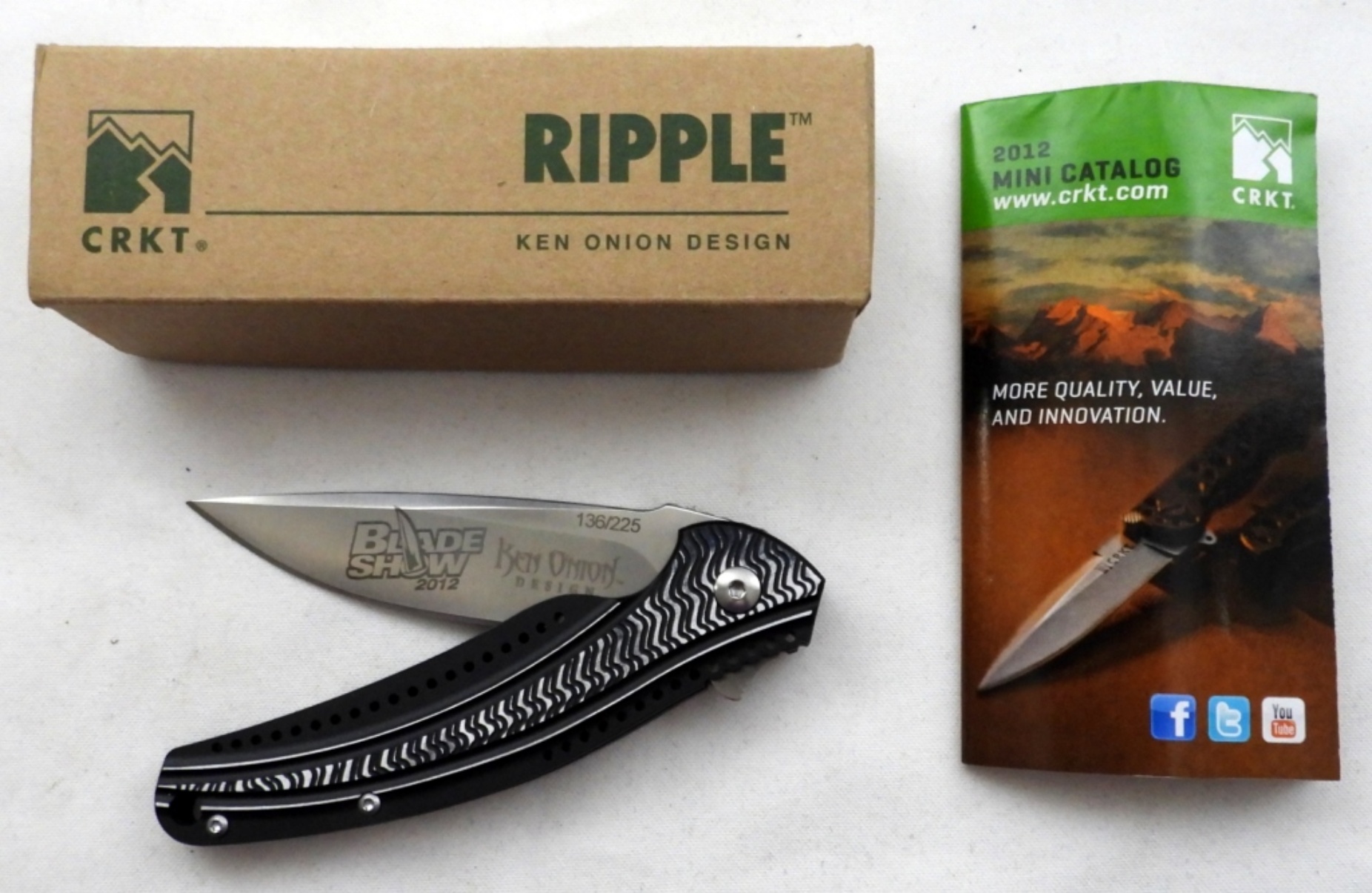 CRKT RIPPLE K415KXP KEN ONION FOLDING KNIFE, BRAND NEW IN ORIGINAL BOX, ENGRAVED “BLADE SHOW 2012” 136/225