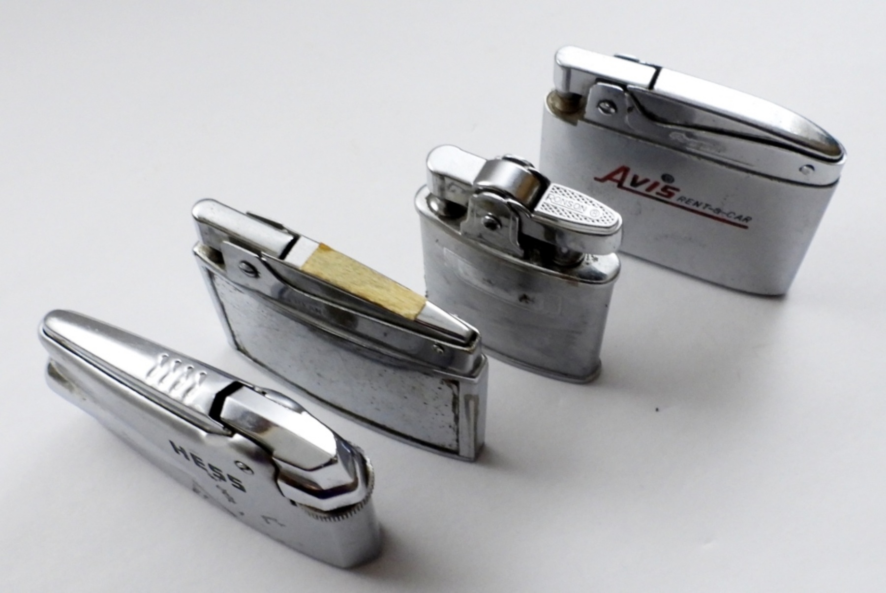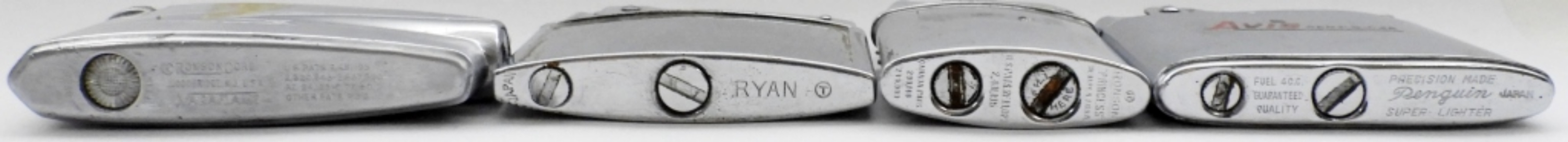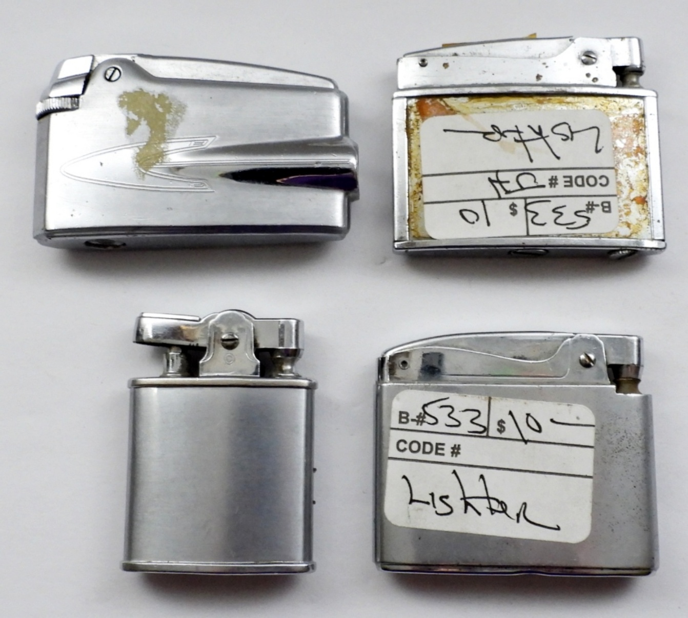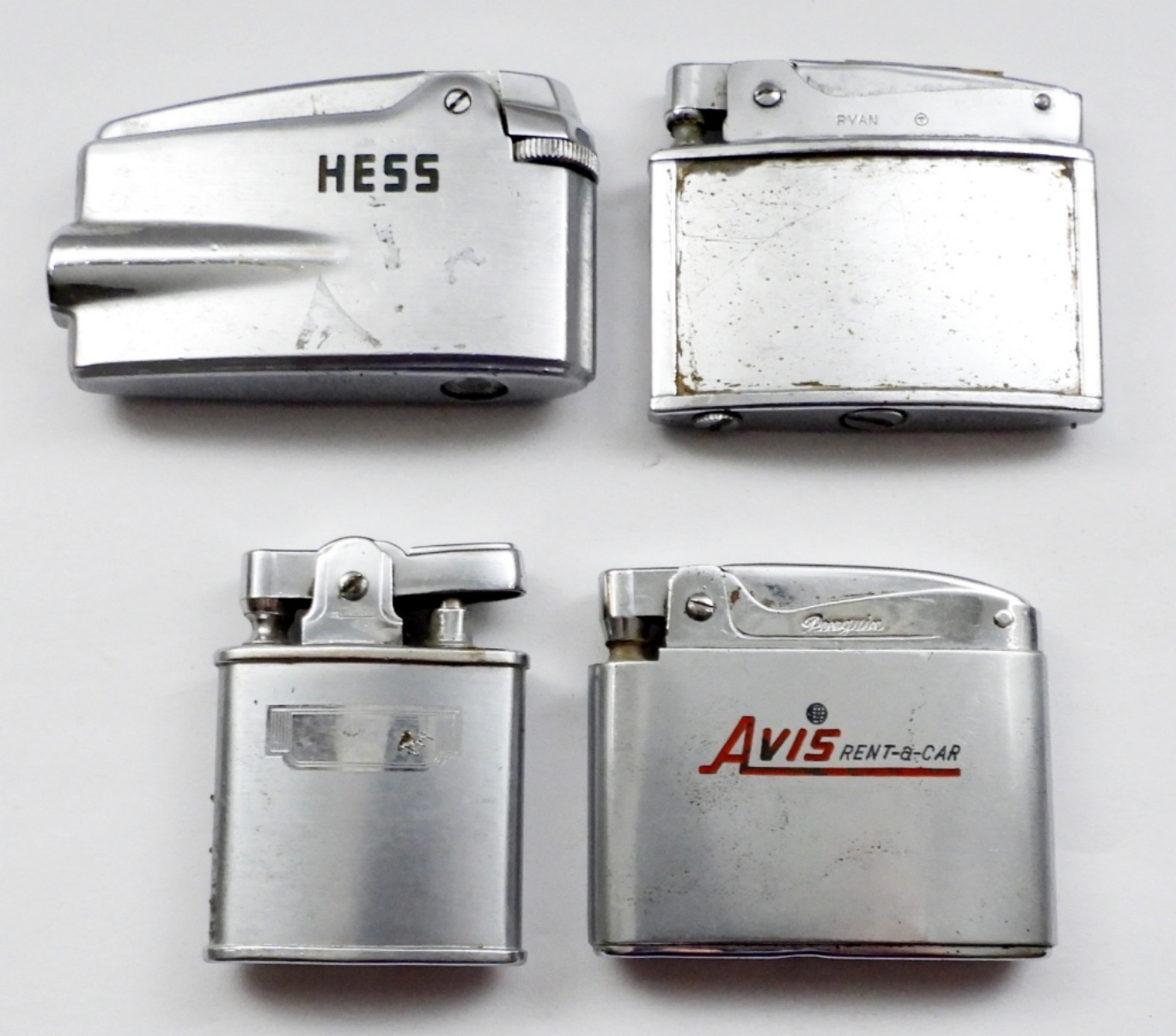 VINTAGE SILVER TONE HANDHELD LIGHTERS WITH ENGRAVING / ADVERTISING, USED CONDITION