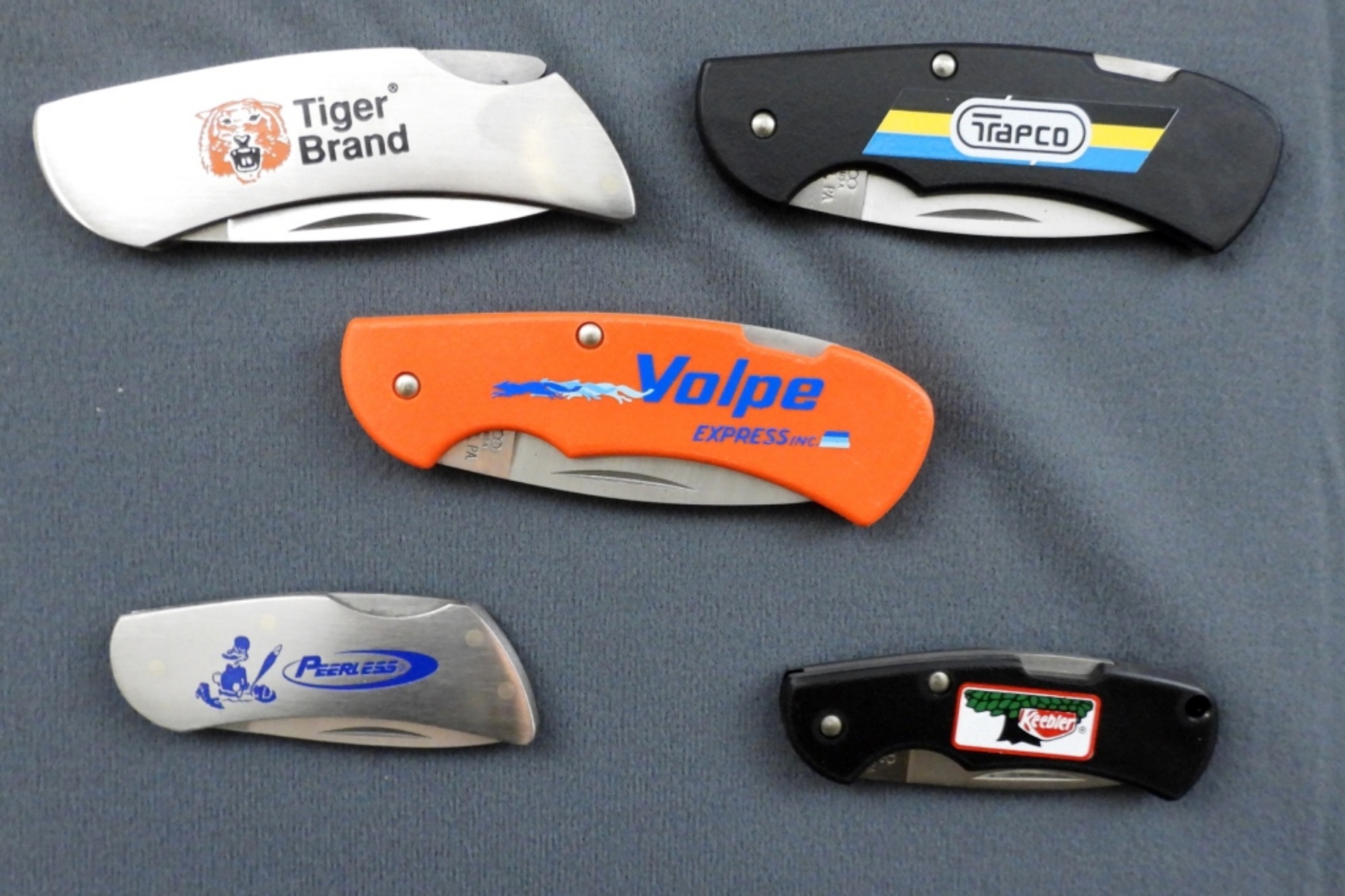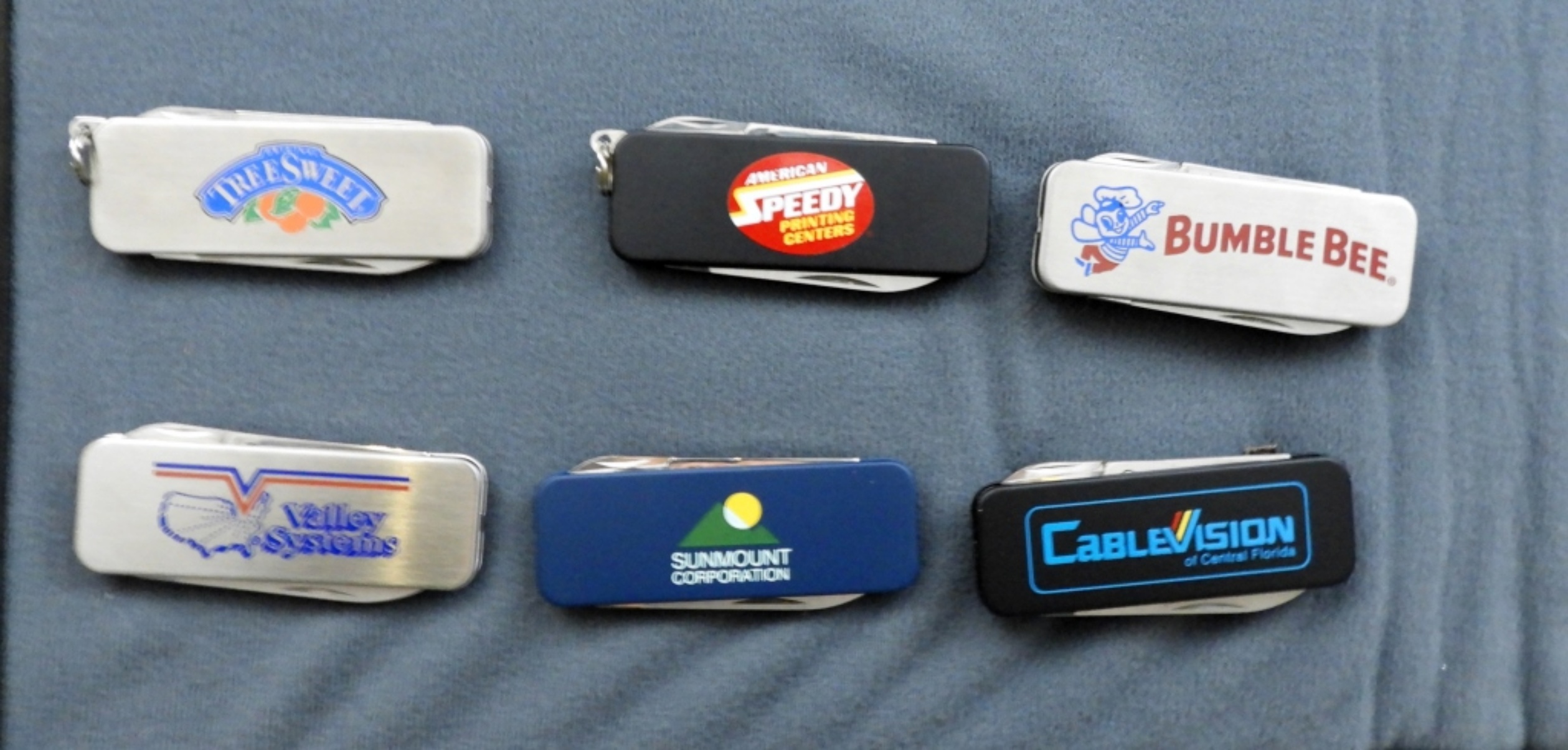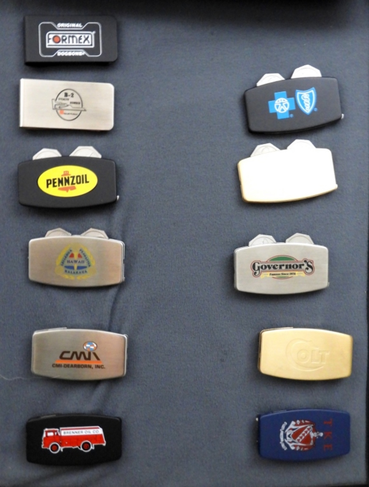 ALL VELCRO TO THE COLLECTORS DISPLAY BOOK, ALL DIFFERENT ADVERTISING, POCKET KNIVES, MONEY CLIPS, GREENKEEPER TOOL