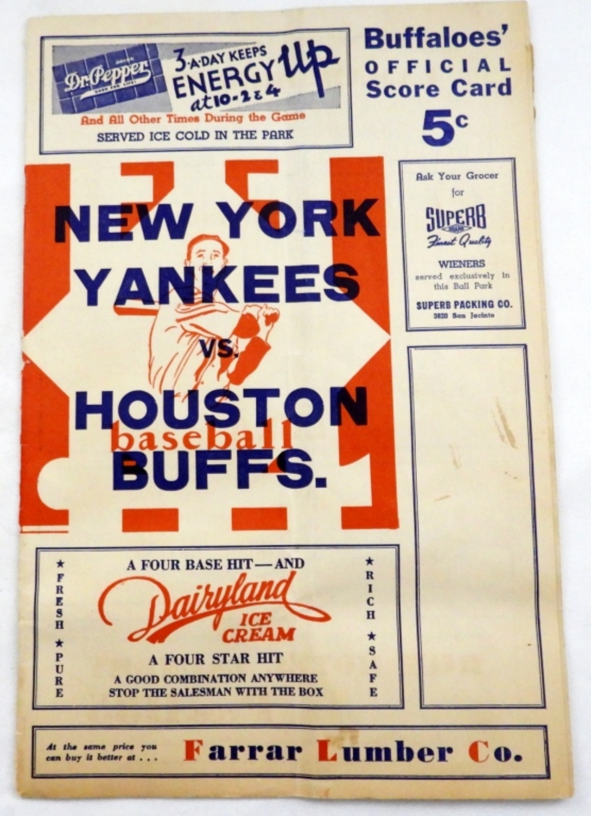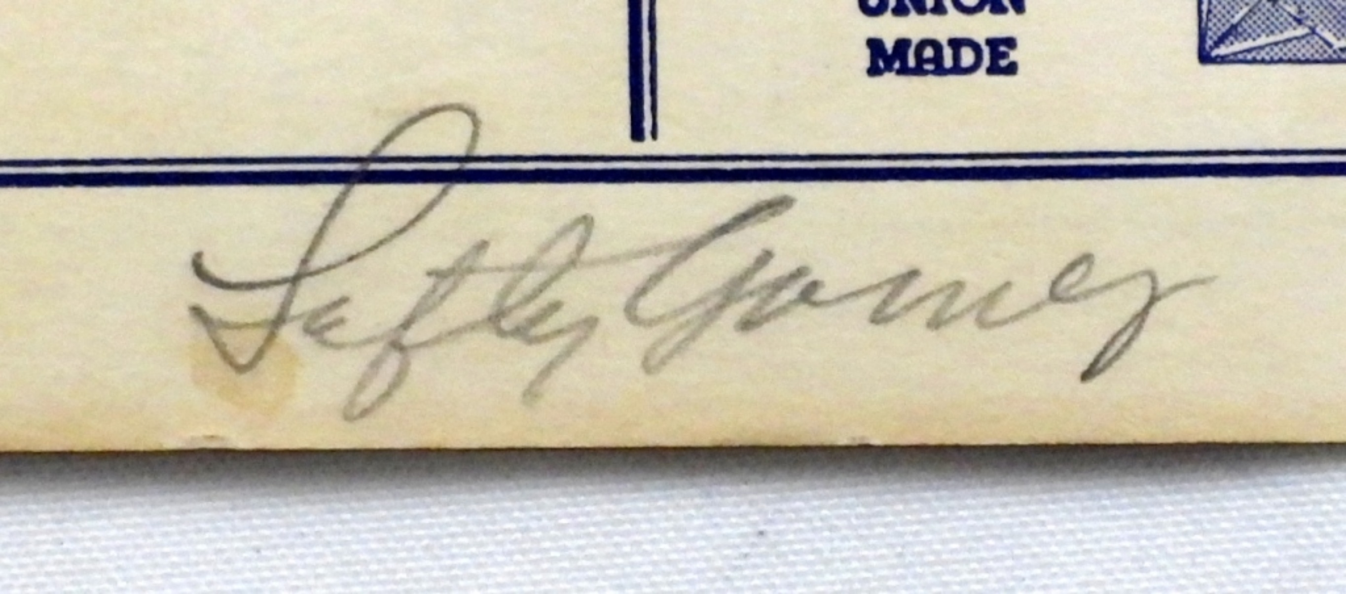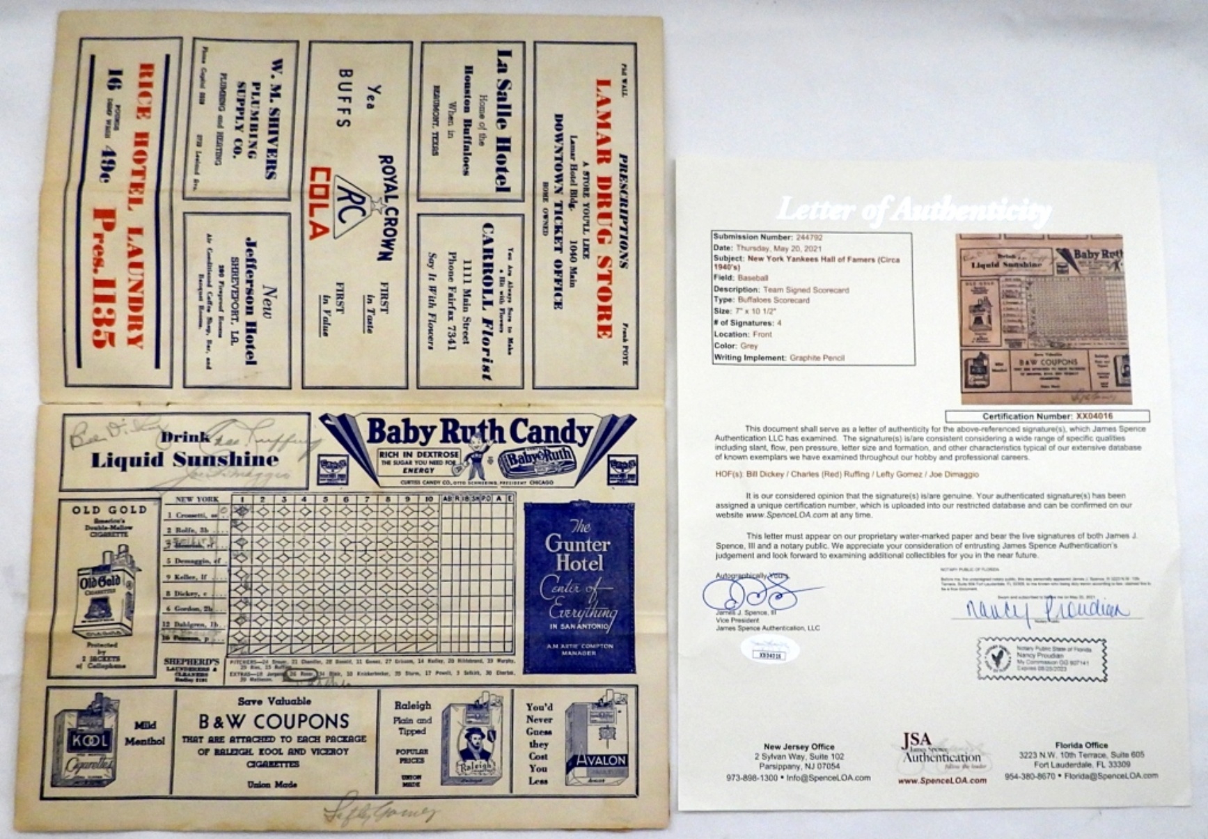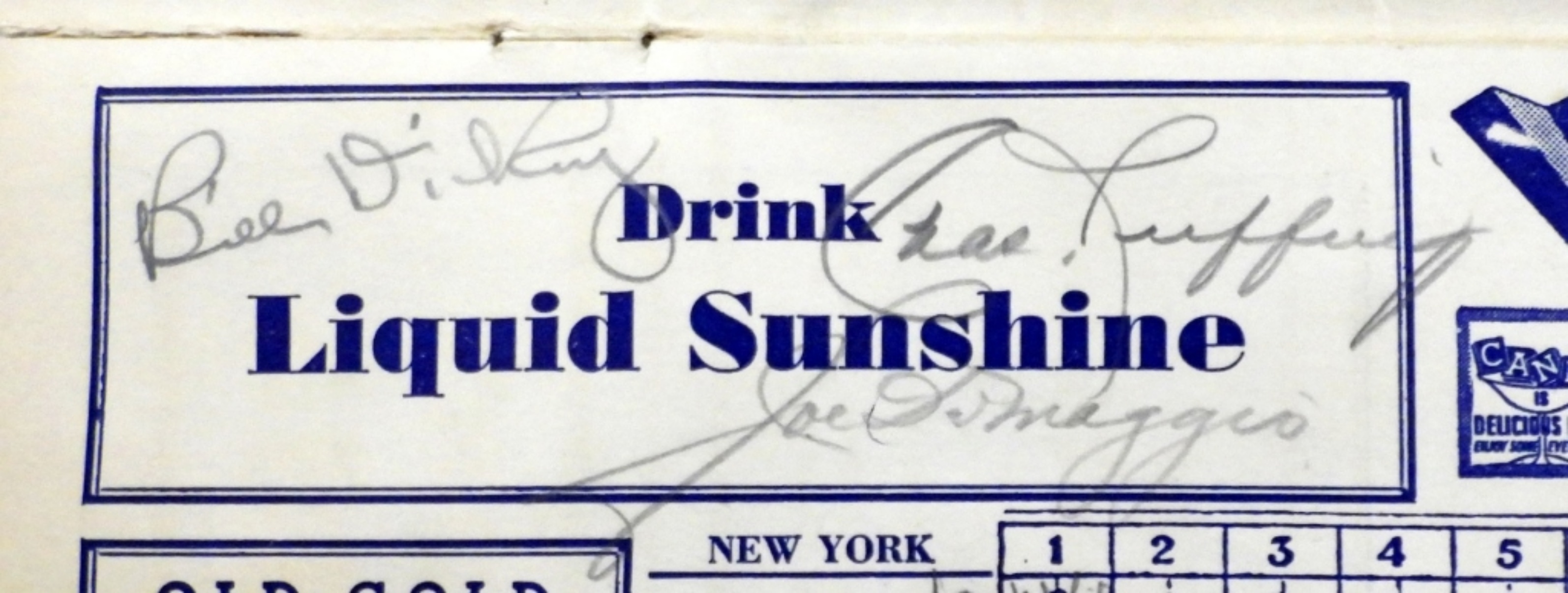 BILL DICKEY / CHARLES (RED) RUFFING / LEFTY GOMEZ / JOE DiMAGGIO – AUTOGRAPHED SCORECARD (was glued at one time on back cover)