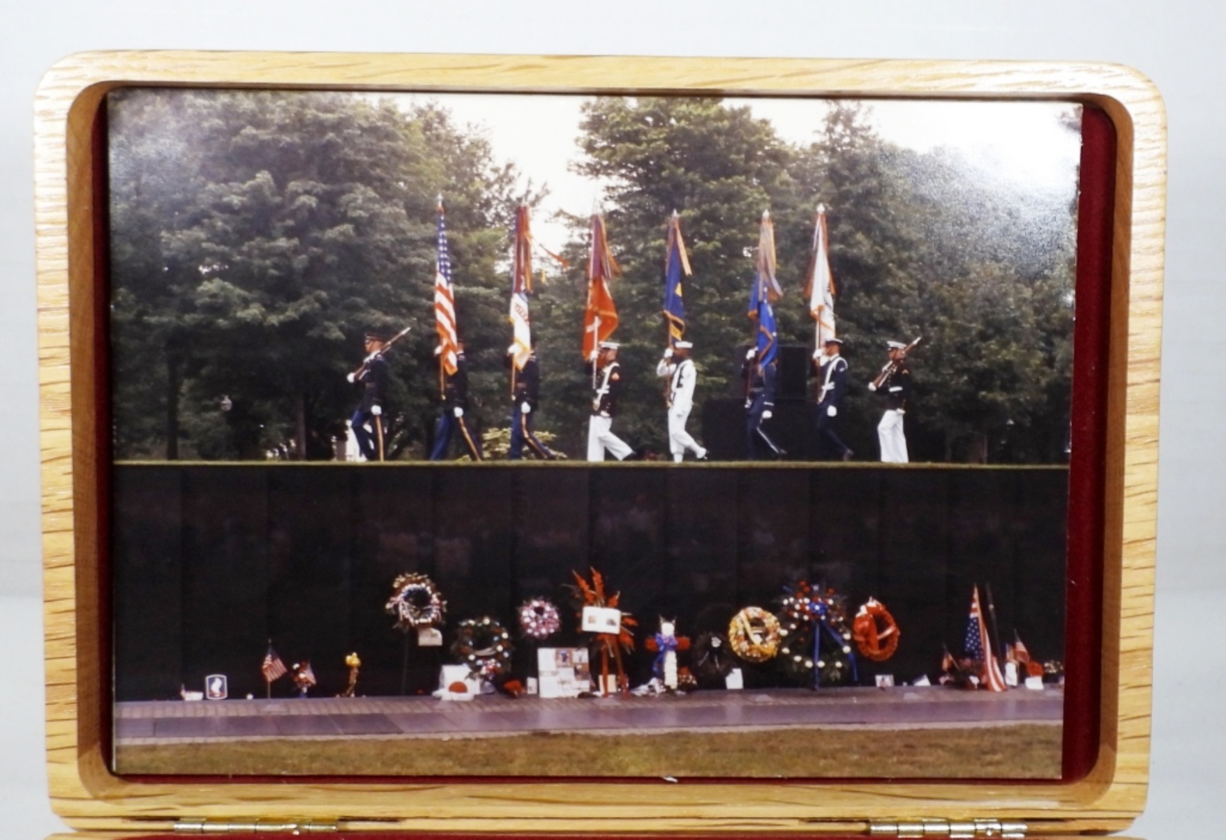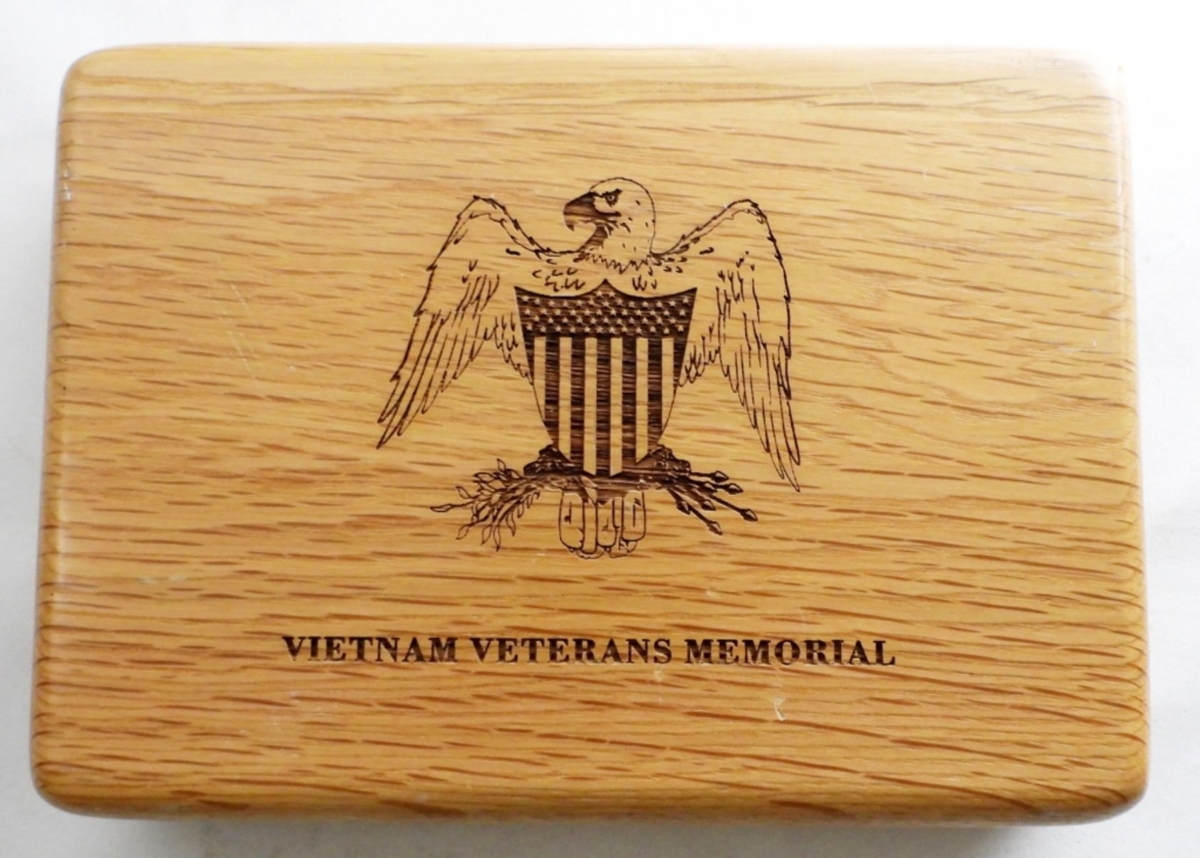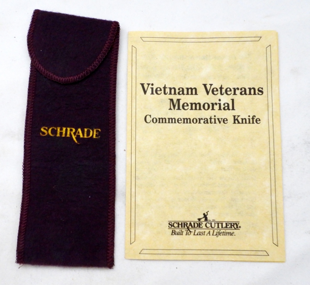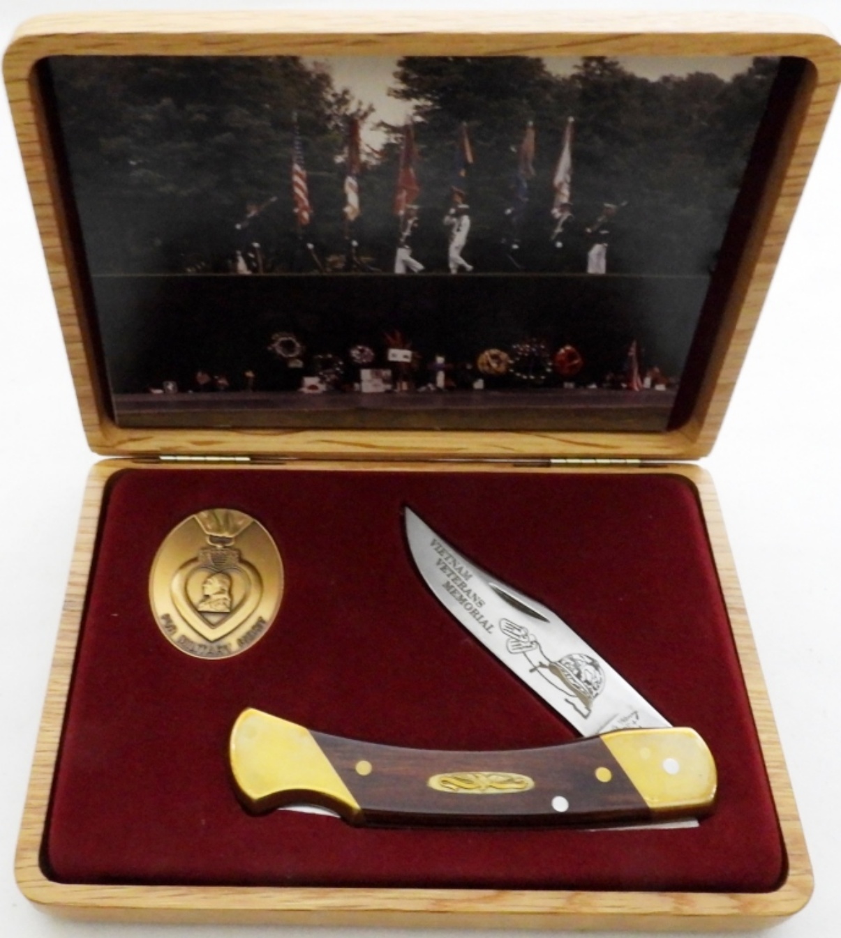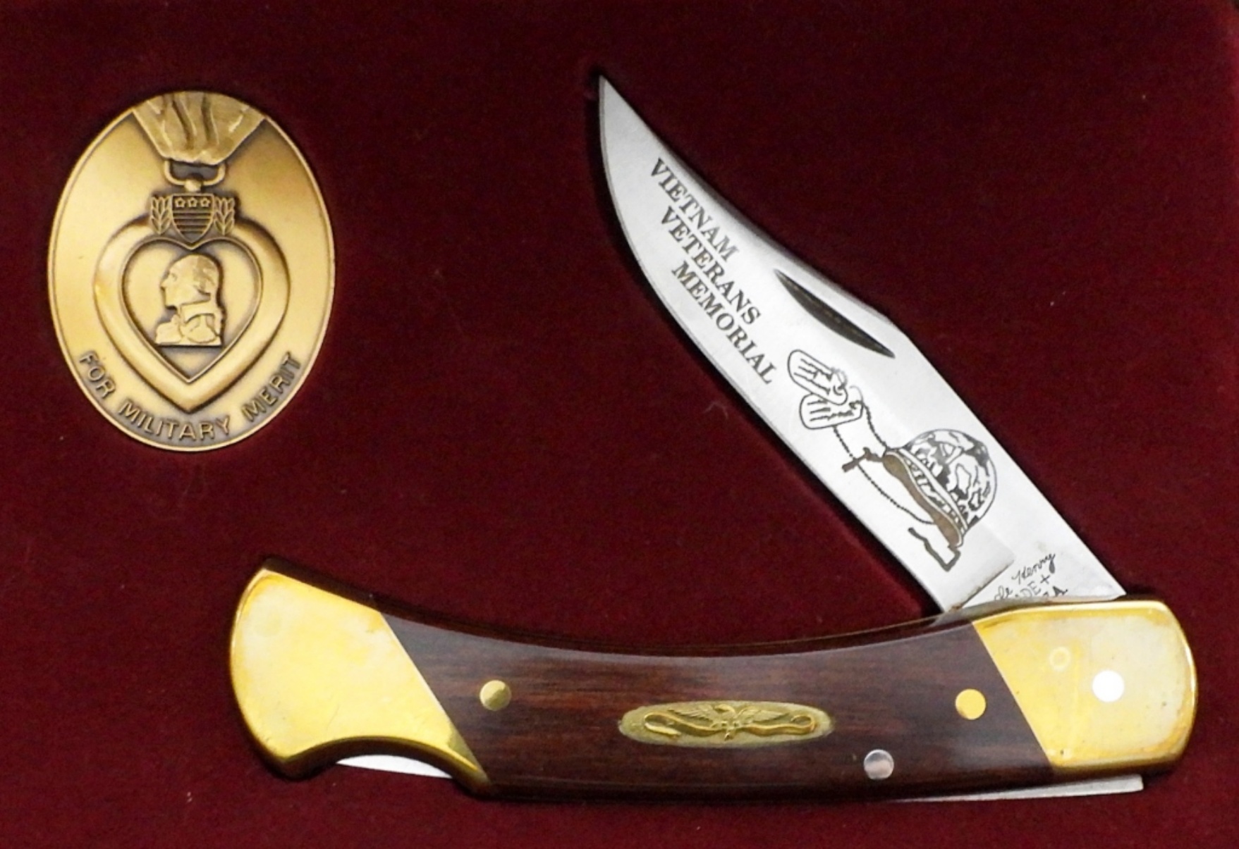 SCHRADE LOCK BACK in WOOD DISPLAY BOX w/MILITARY MERIT CHARM
