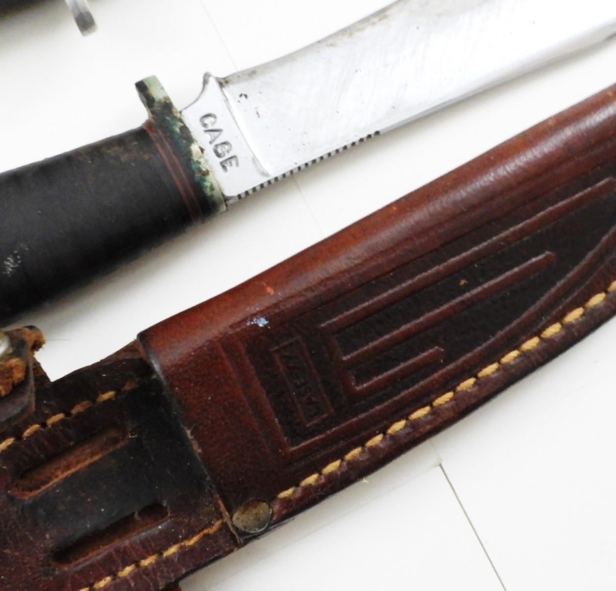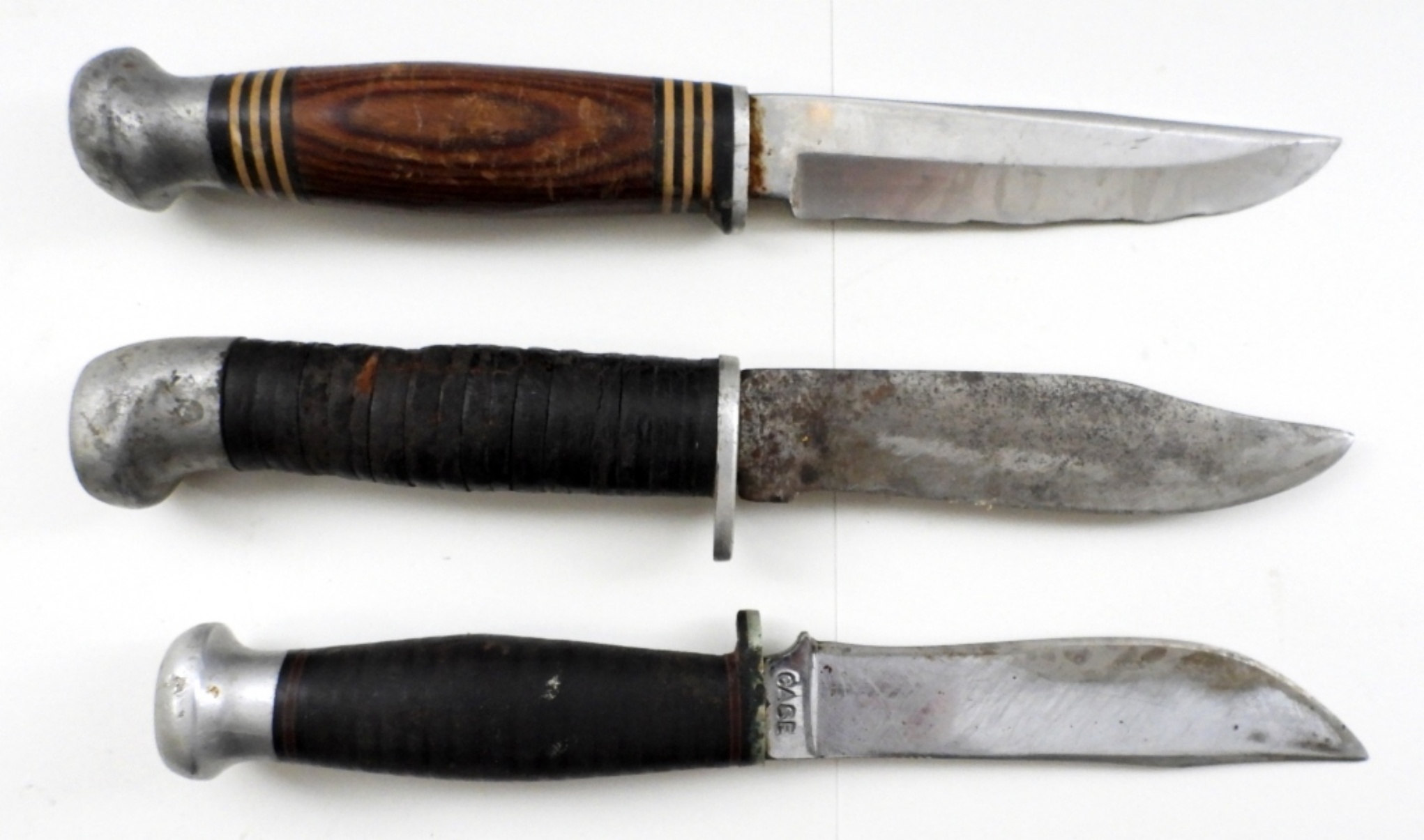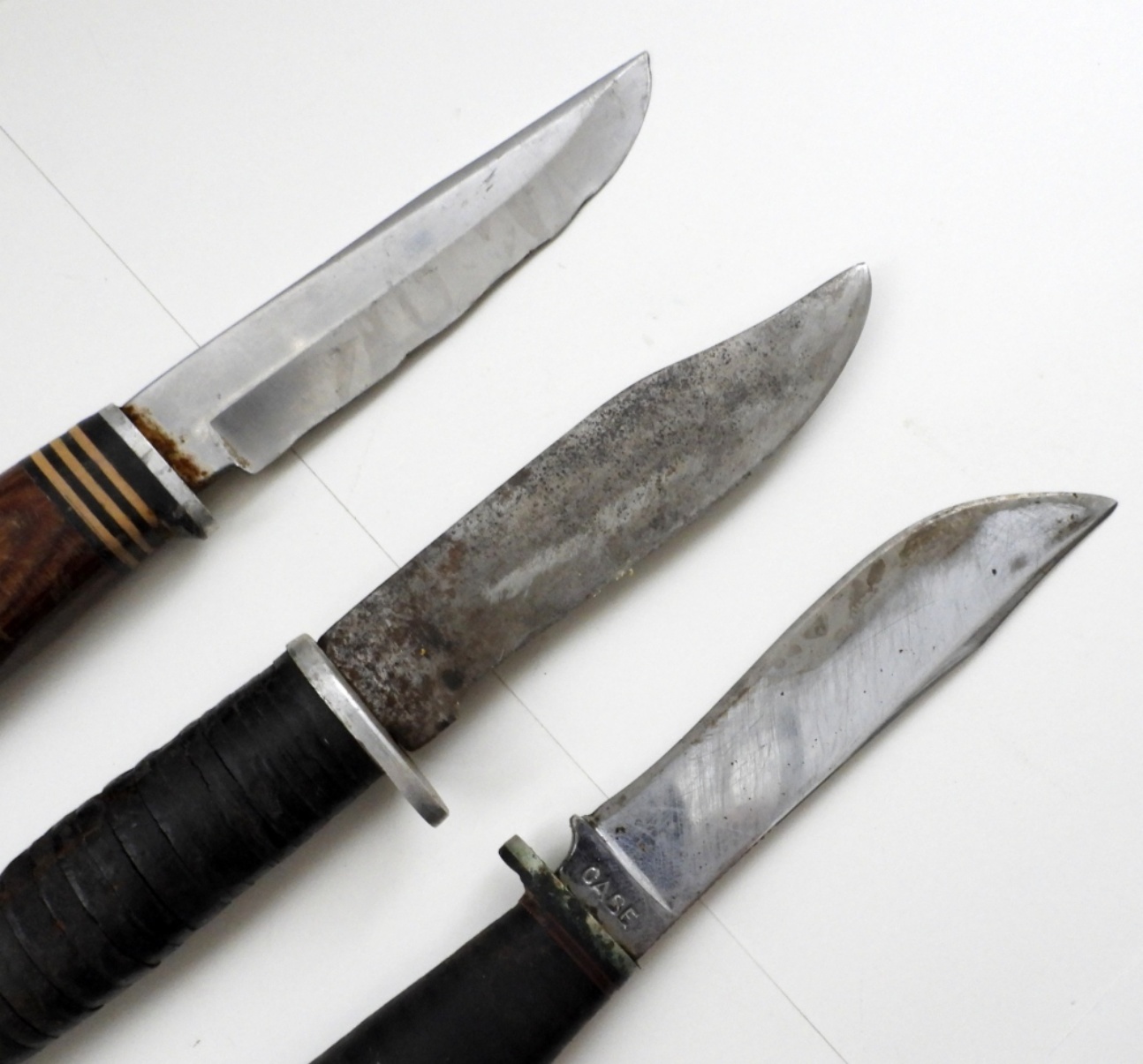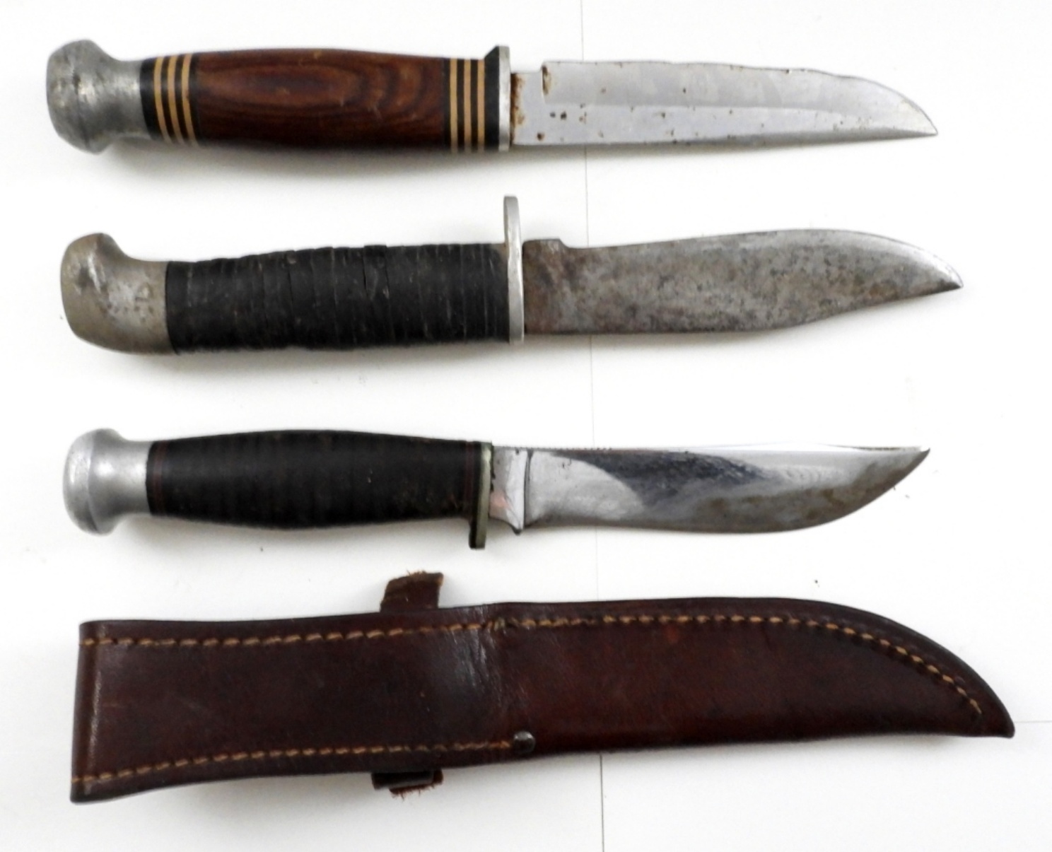 ALL 4″ BLADES, 2 ARE UNKNOWN MAKERS, 1 IS CASEXX WITH LEATHER SHEATH