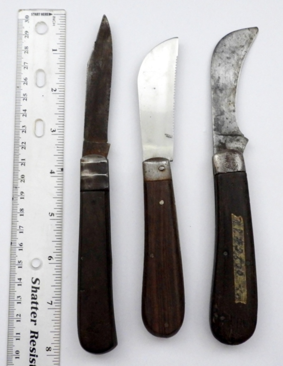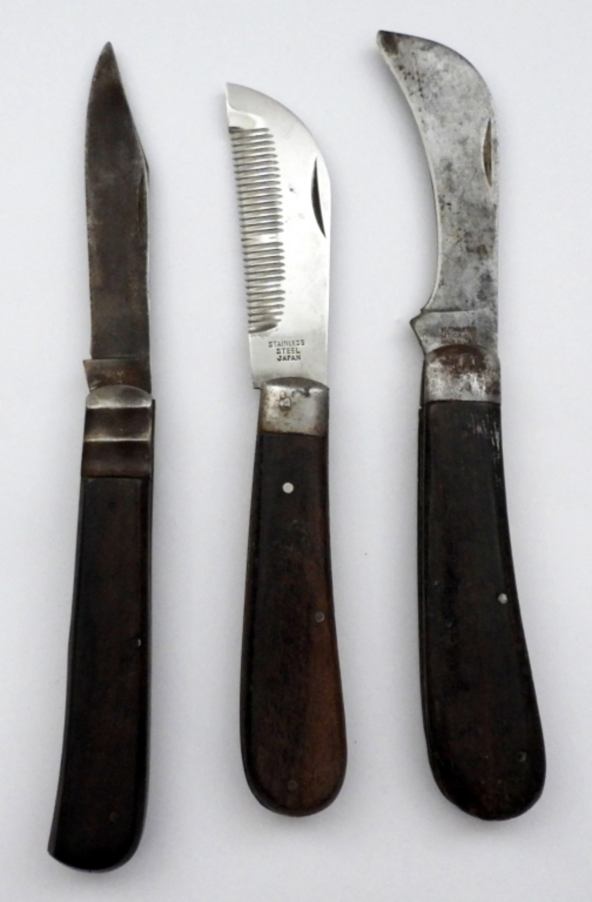 VINTAGE SINGLE BLADE FOLDING KNIVES, BILLHOOK & STRAIGHT EDGE – USED CONDITION