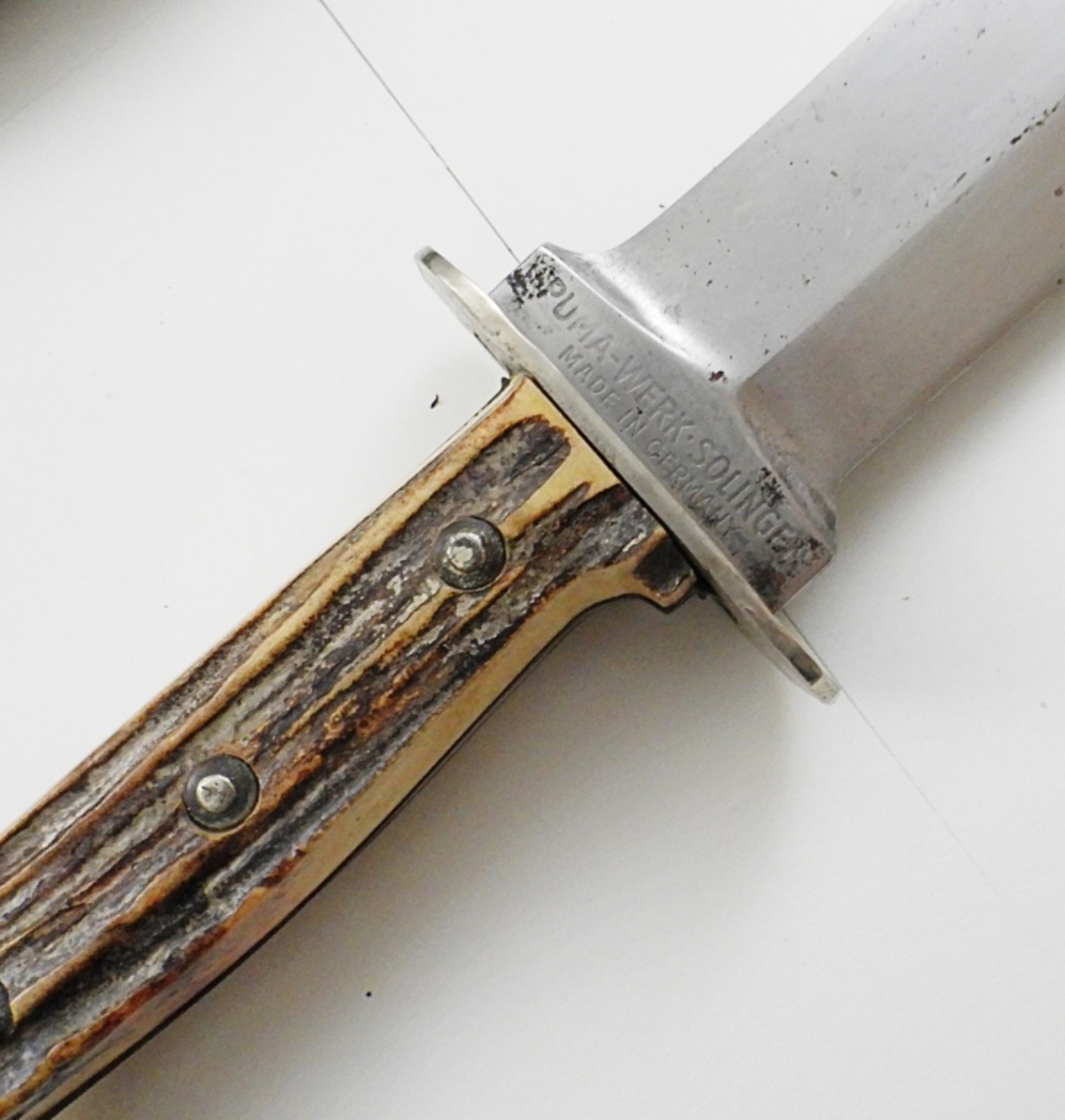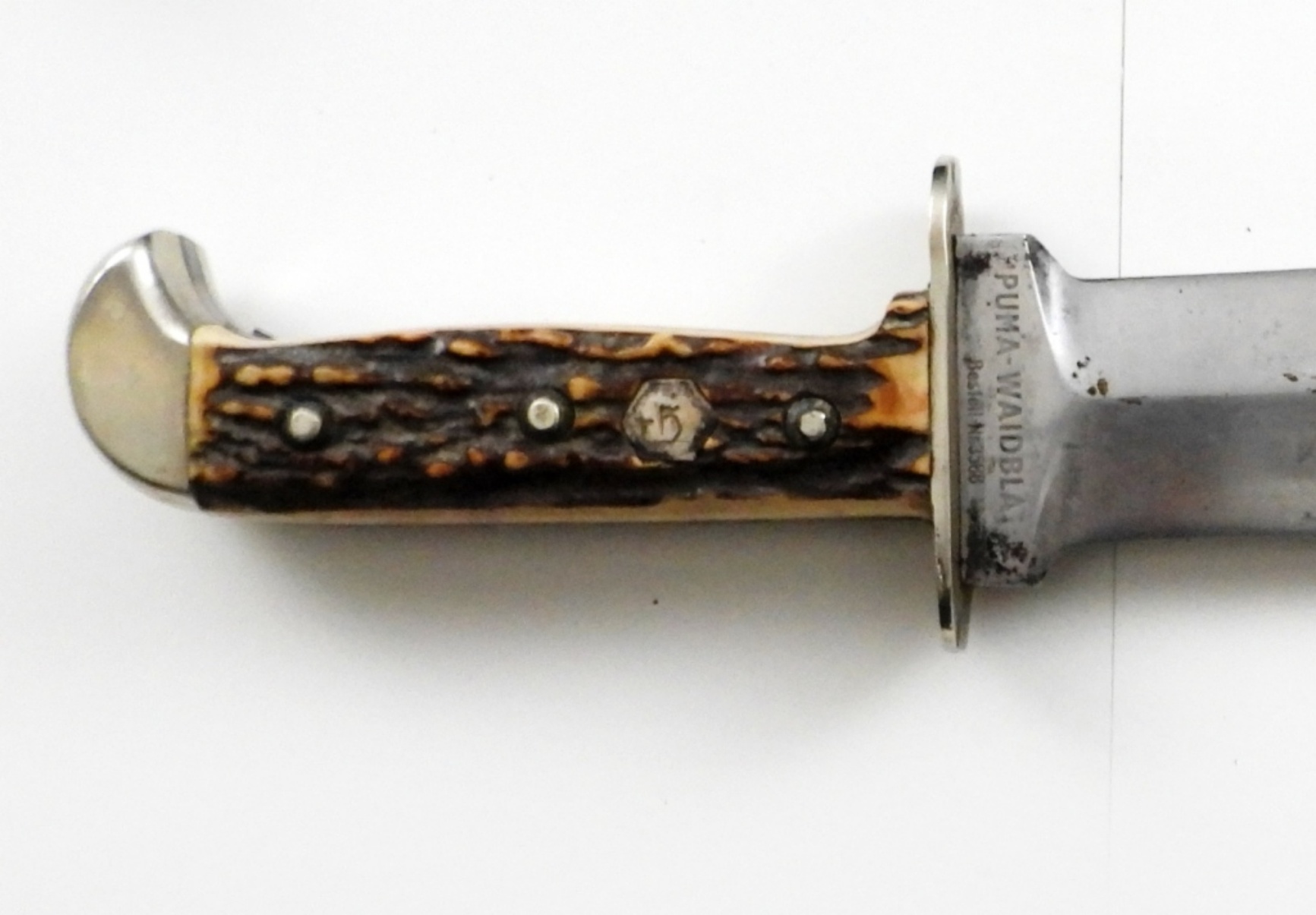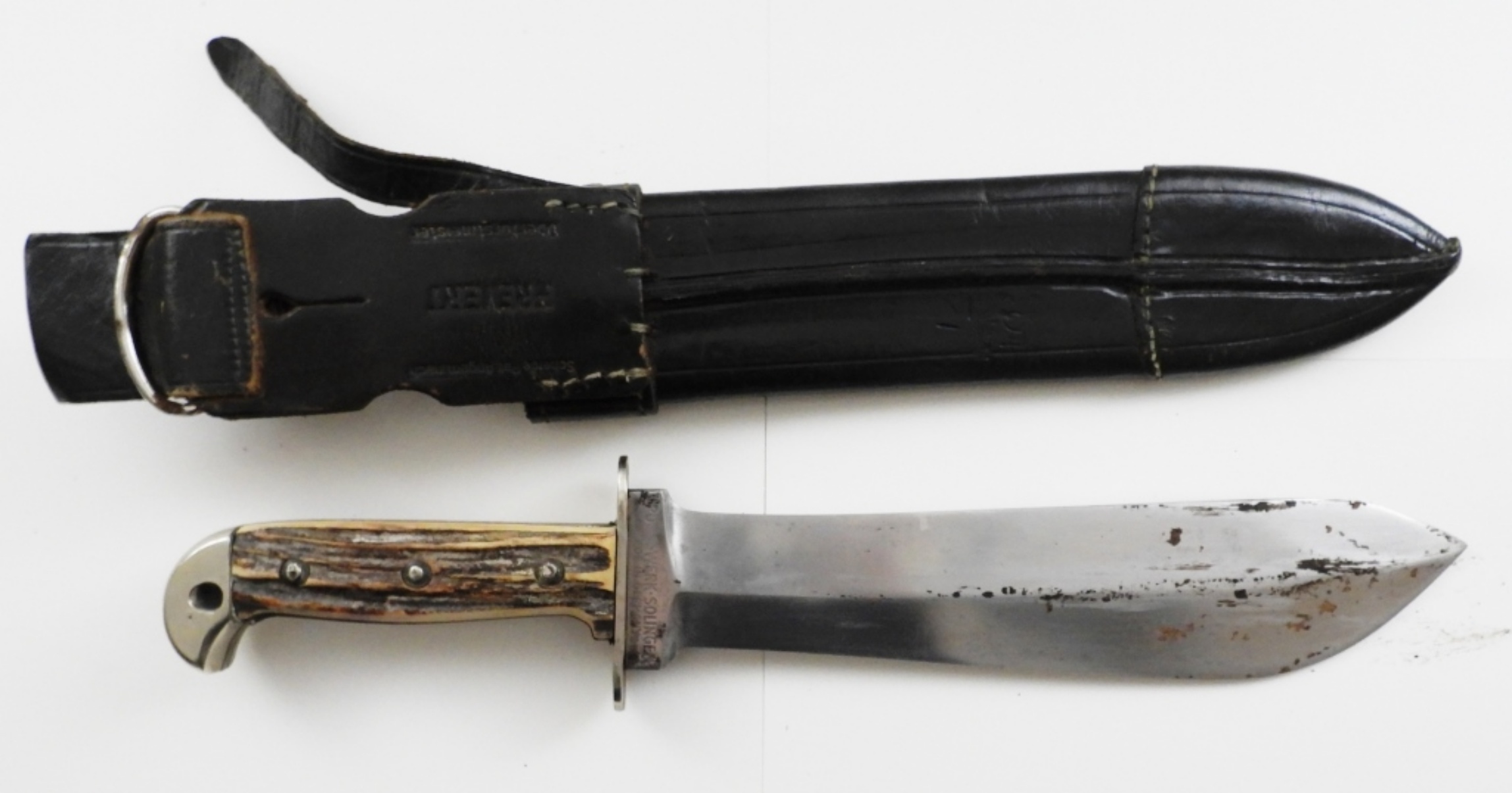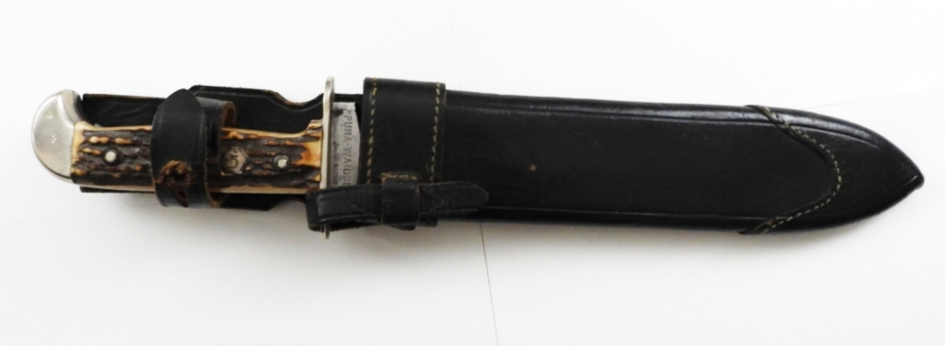NEAR 13IN LONG, BLADE 8 1/2 IN LONG, STAMPED ON BOTTOM OF BLADE PUMA-WERK-SOLINGEN, MADE IN GERMANY, BESTELL-NR.3588, WITH A LEATHER SHEATH STAMPED FREVERT ON THE BACK