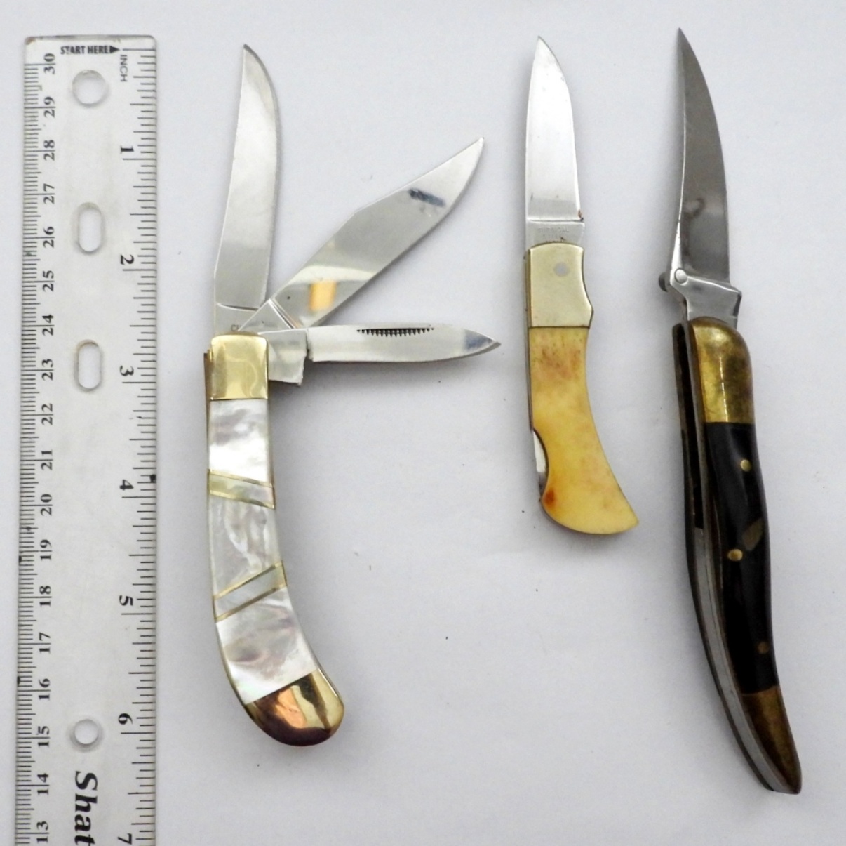 MOTHER OF PEARL HANDLE OCOEE RIVER 3-BLADE, PARKER CUT CO SURGICAL STEEL JAPAN SINGLE BLADE, LOCK BACK SINGLE BLADE FOLDING POCKET KNIFE – NICE USED CONDITION