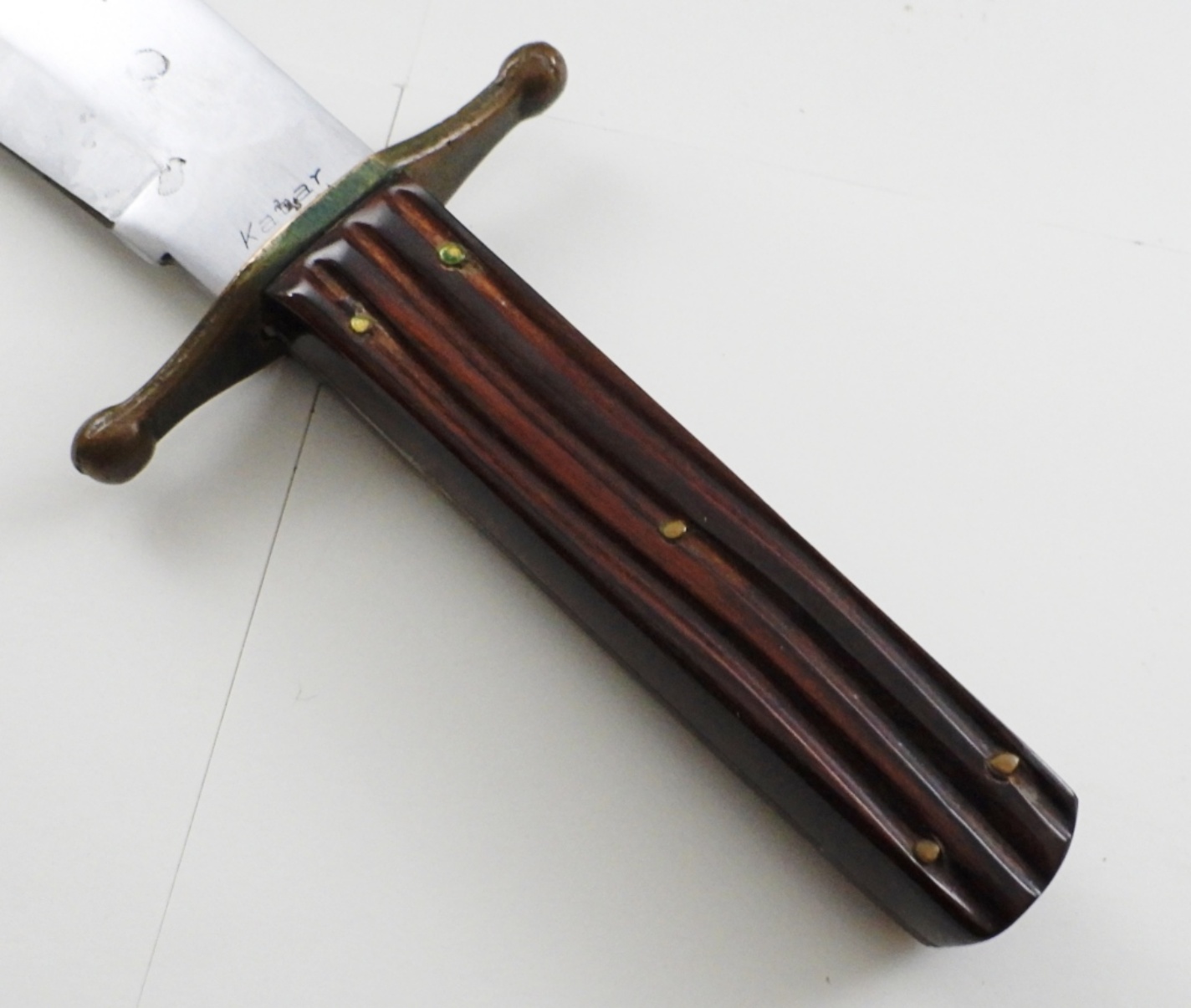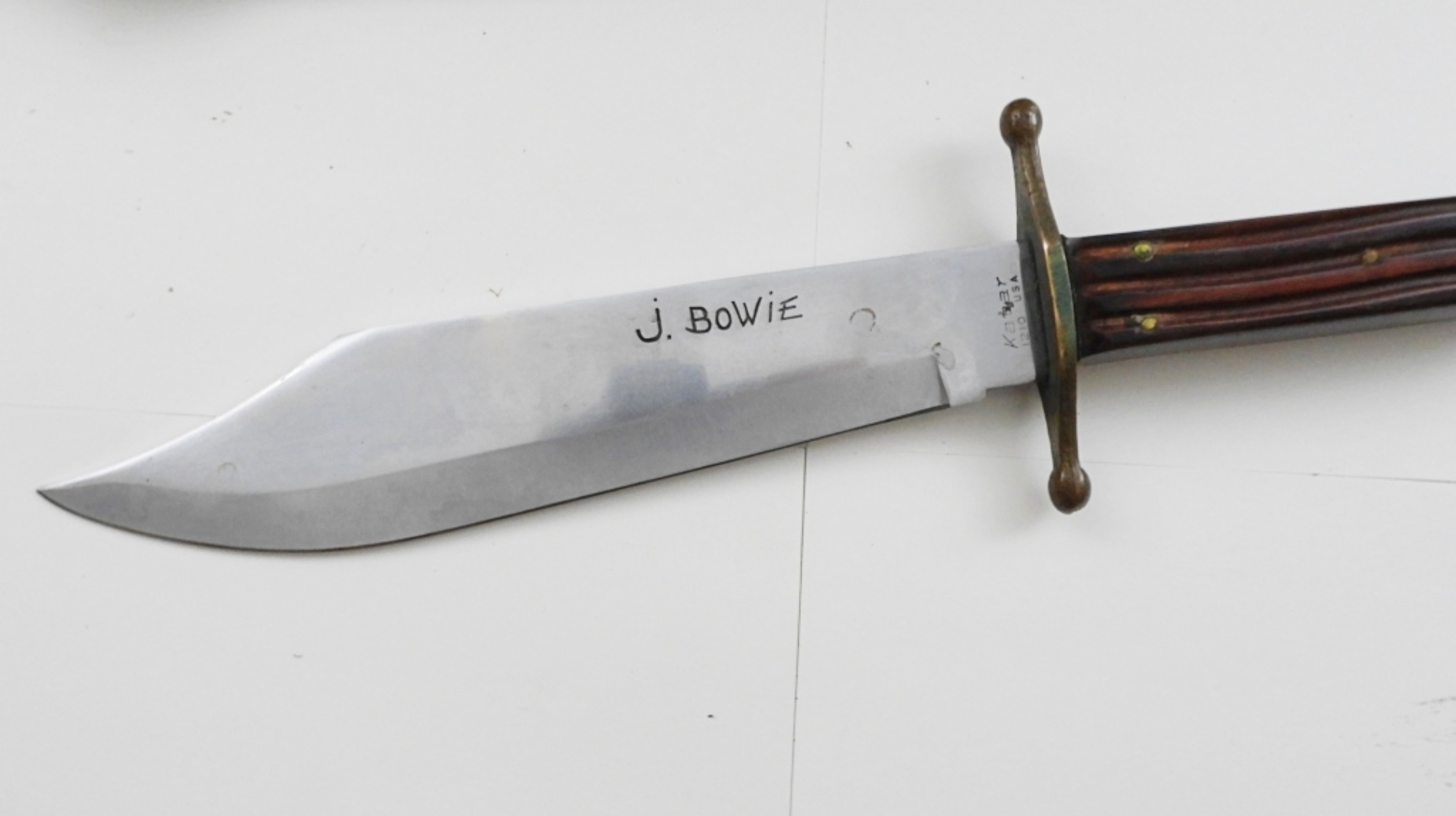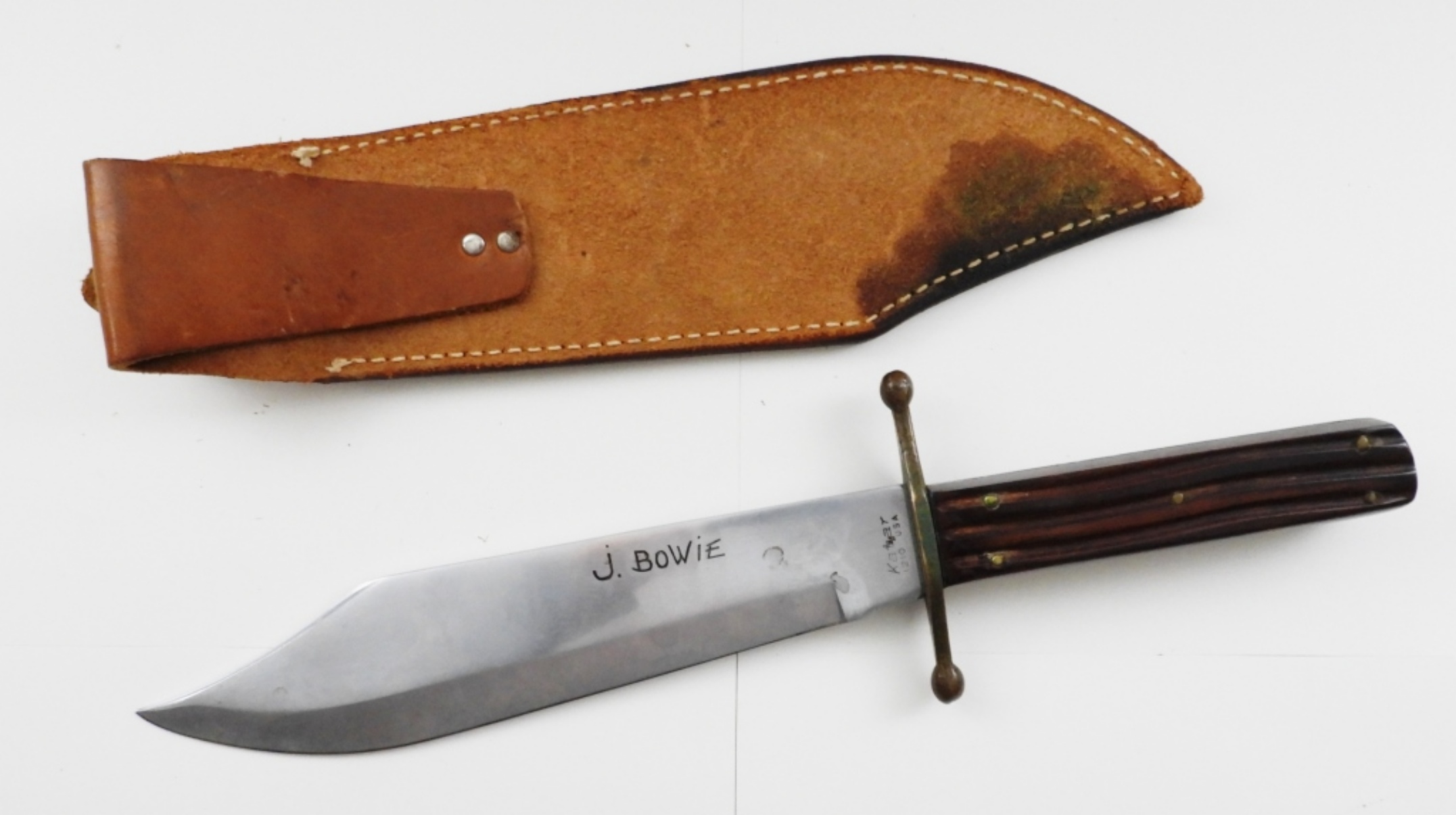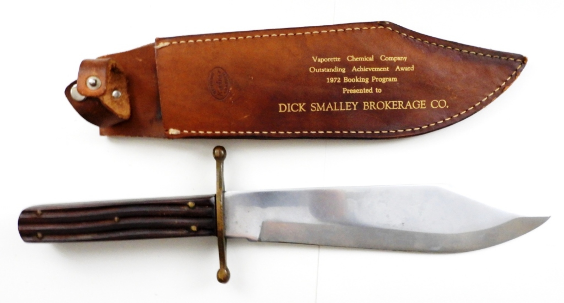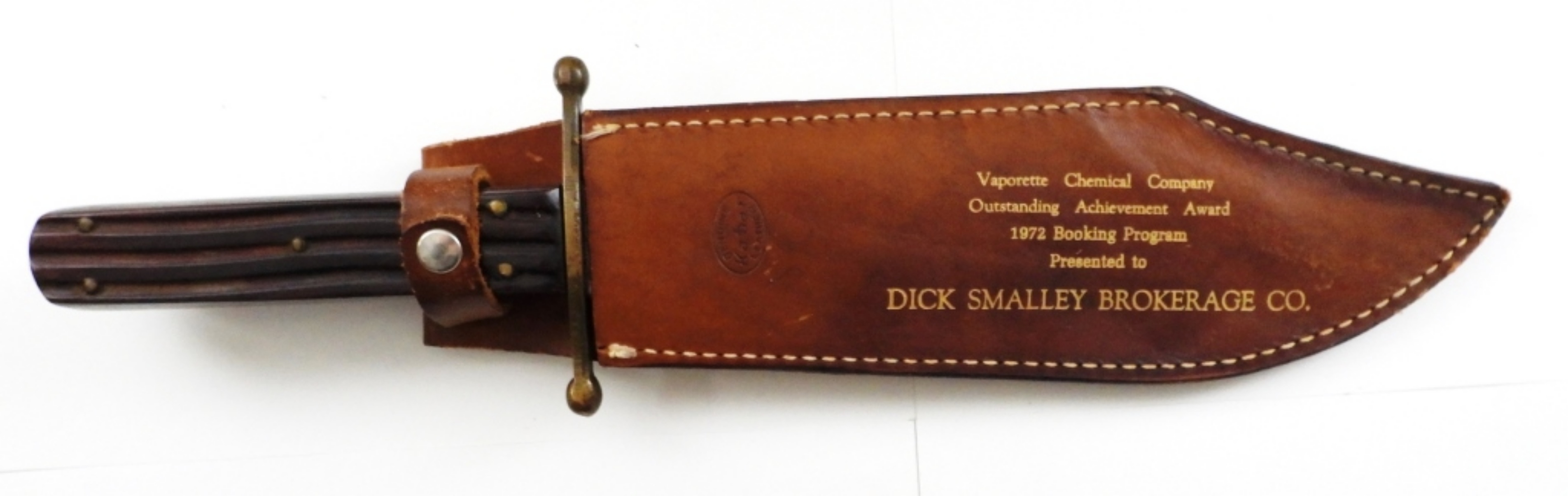 STAMPED J BOWIE ON BLADE, KA-BAR 1220 USA, BLADE IS 8 1/2″ LONG, TOTAL 13″ BOTTOM TO TIP. DEDICATION IS ON THE SHEATH “VAPORETTE CHEMICAL COMPANY OUTSTANDING ACHIEVEMENT AWARD 1972 BOOKING PROGRAM PRESENTED TO DICK
