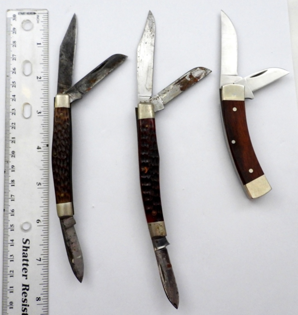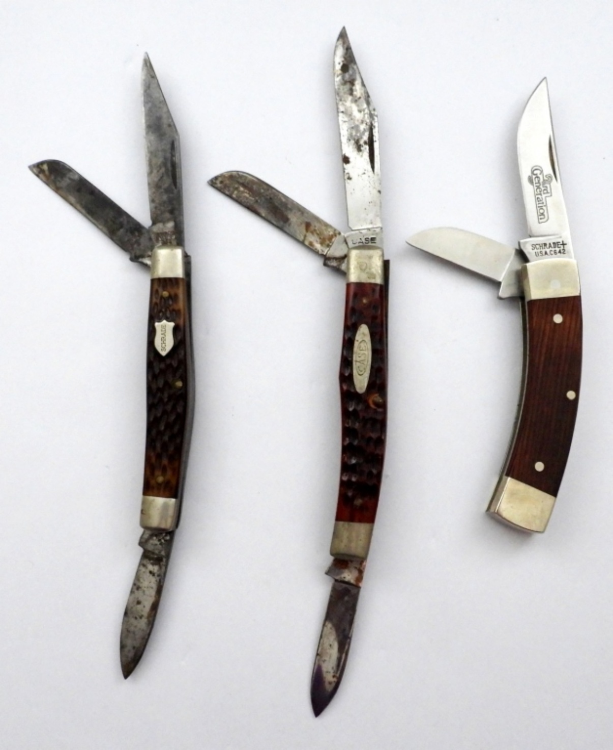 (2) SCHRADE & (1) CASE, VINTAGE WOOD HANDLE FOLDING POCKET KNIVES – USED CONDITION