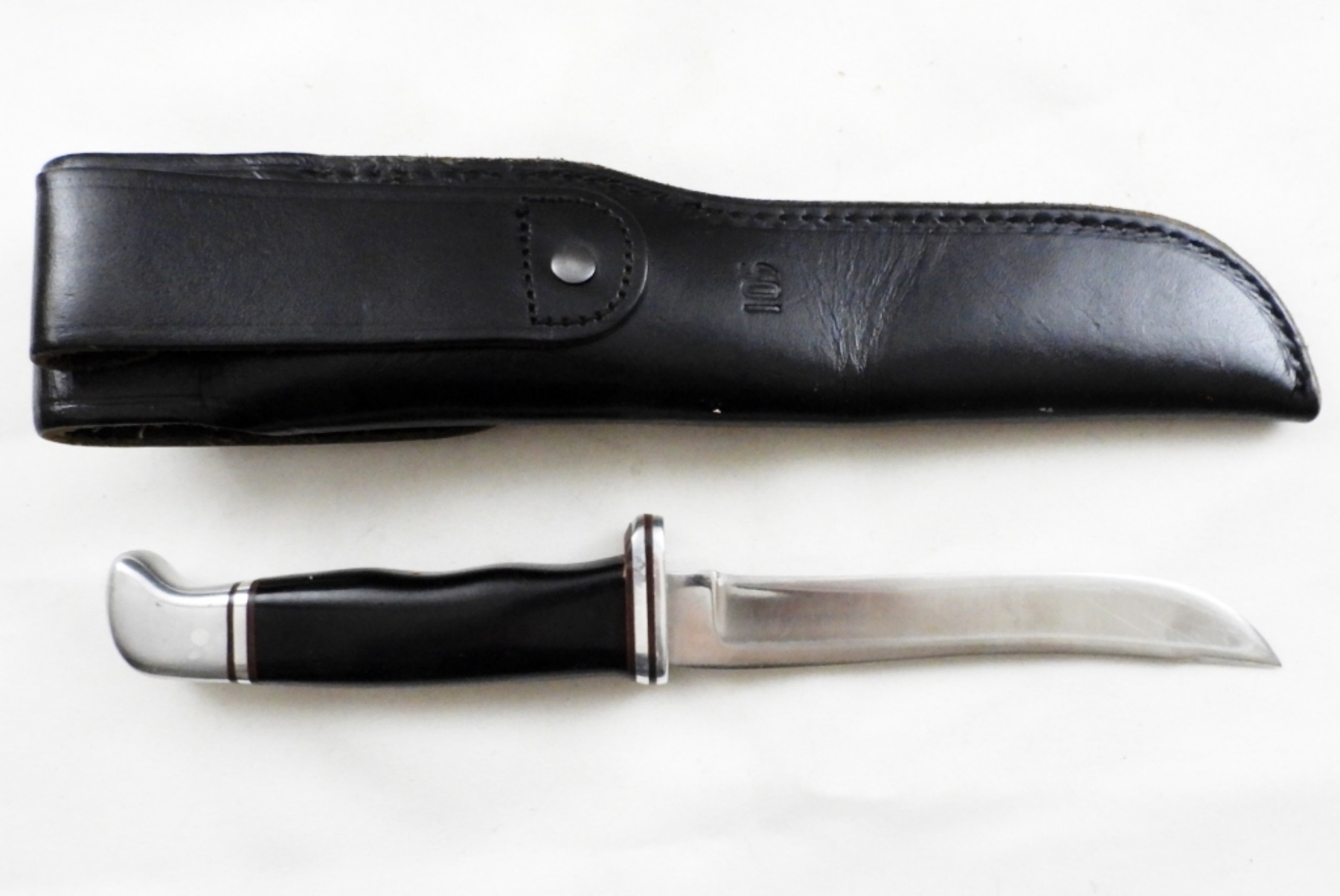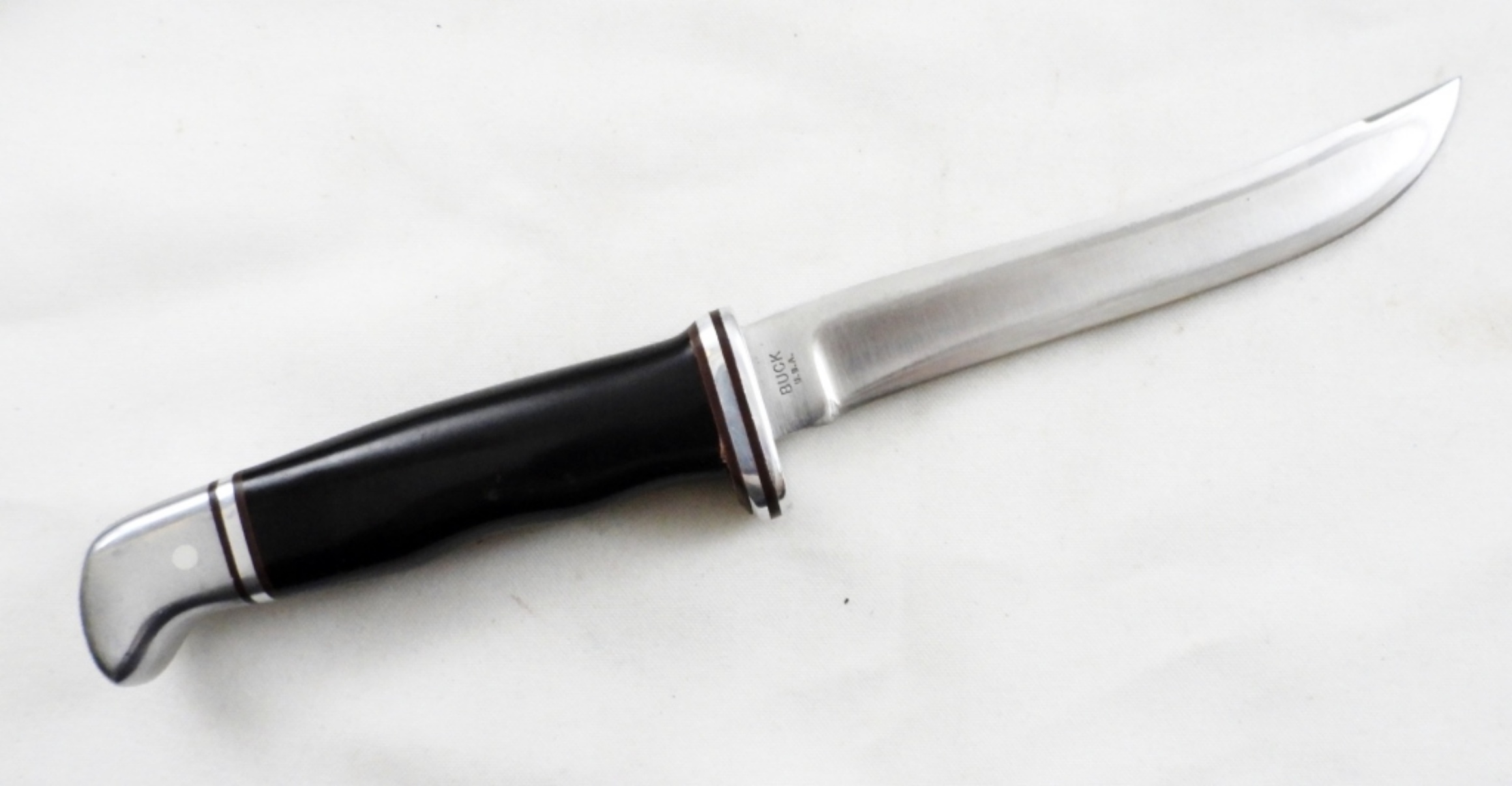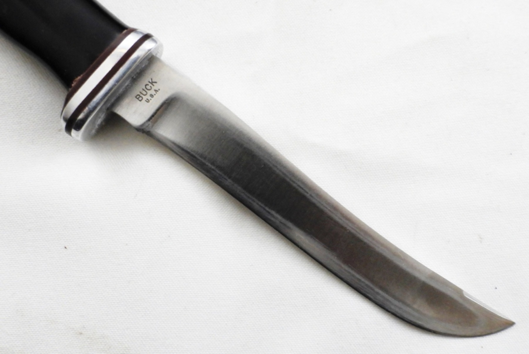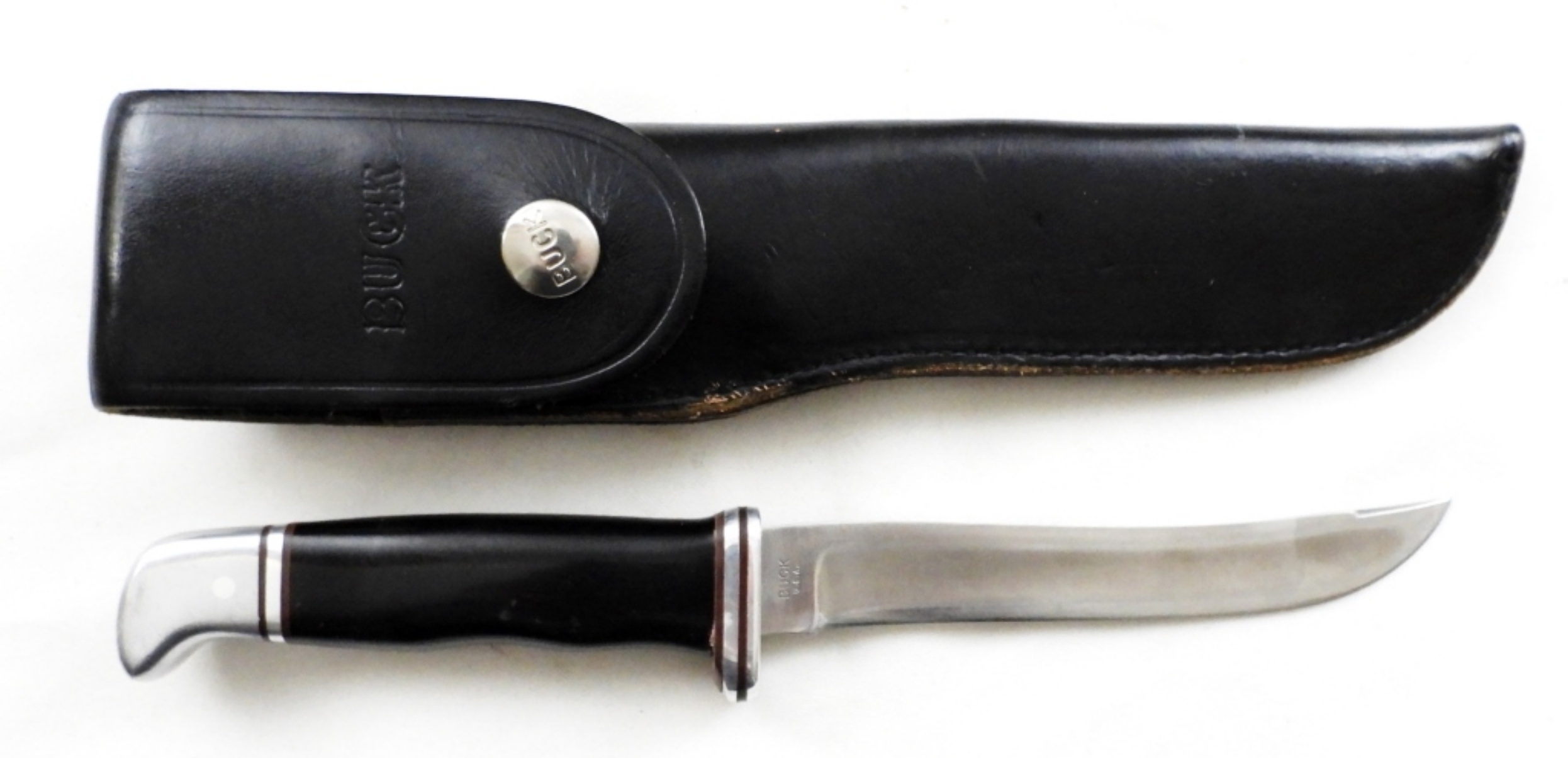 ABOUT 9 1/2″ LONG, BLADE 5″ LONG, STAMPED BUCK U.S.A., ORIGINAL SHEATH 105 ON THE BACK