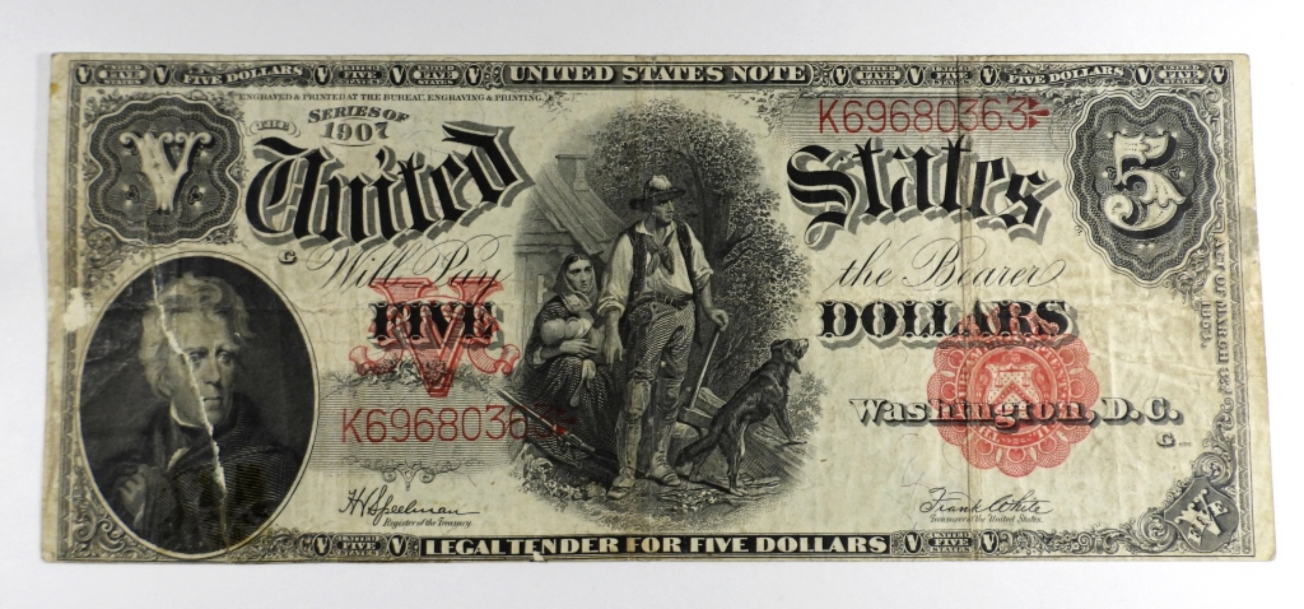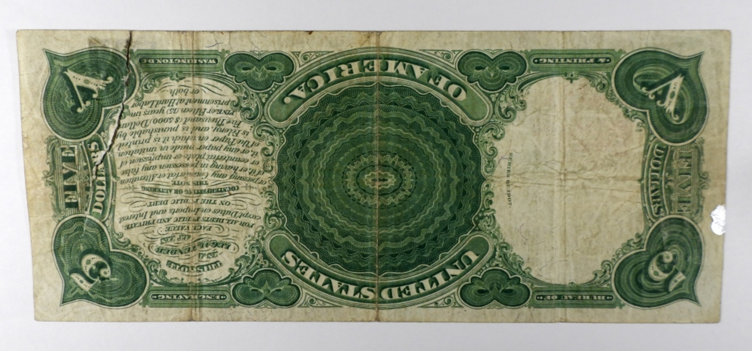 U.S. NOTE – LARGE SIZE CURRENCY has small silver paint dot on the reverse edge – NICE CIRC
