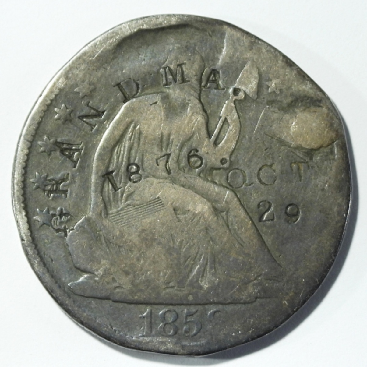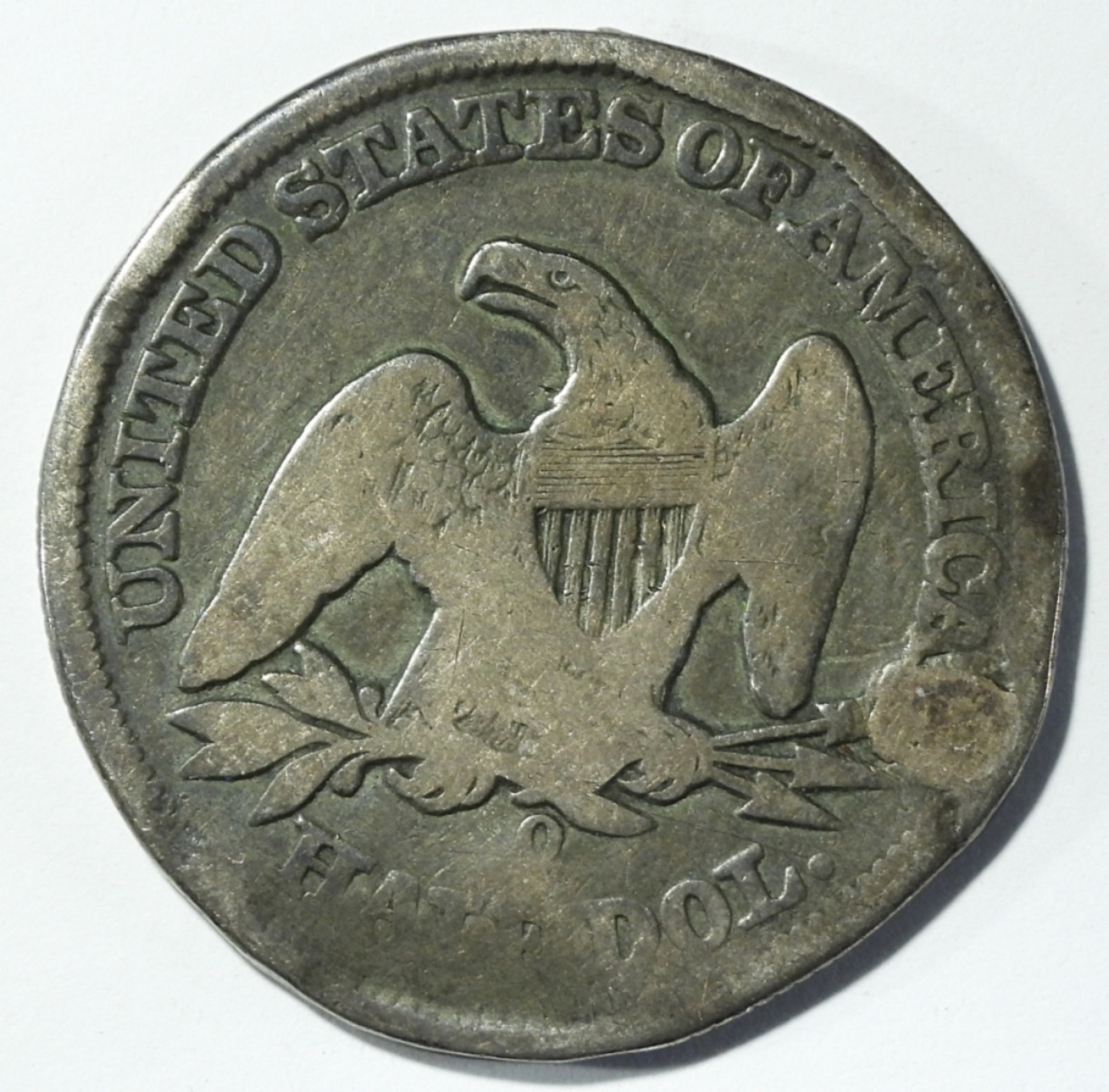 1858-O SEATED LIBERTY HALF COUNTERSTAMP
