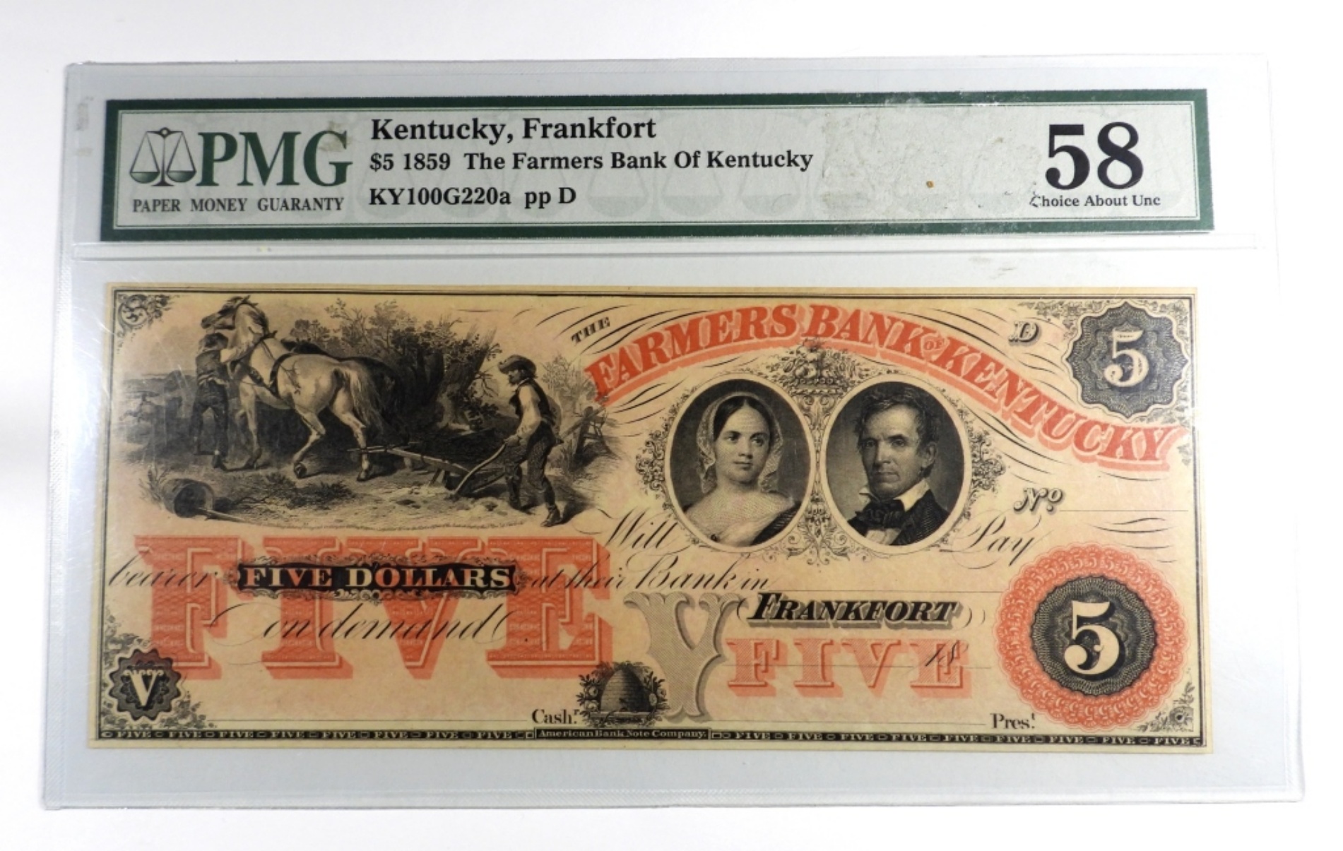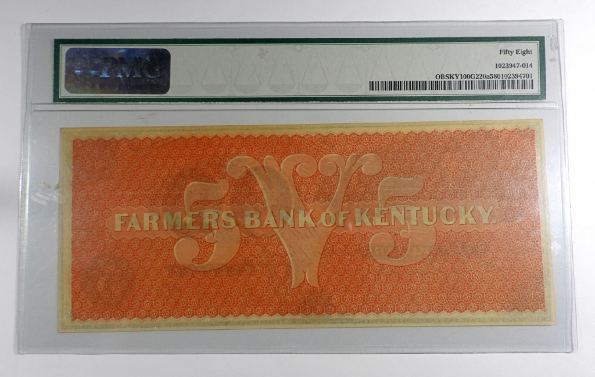 FIVE DOLLARS, THE FARMERS BANK OF KENTUCKY, KY100G220a PP D, 58 CHOICE ABOUT UNC