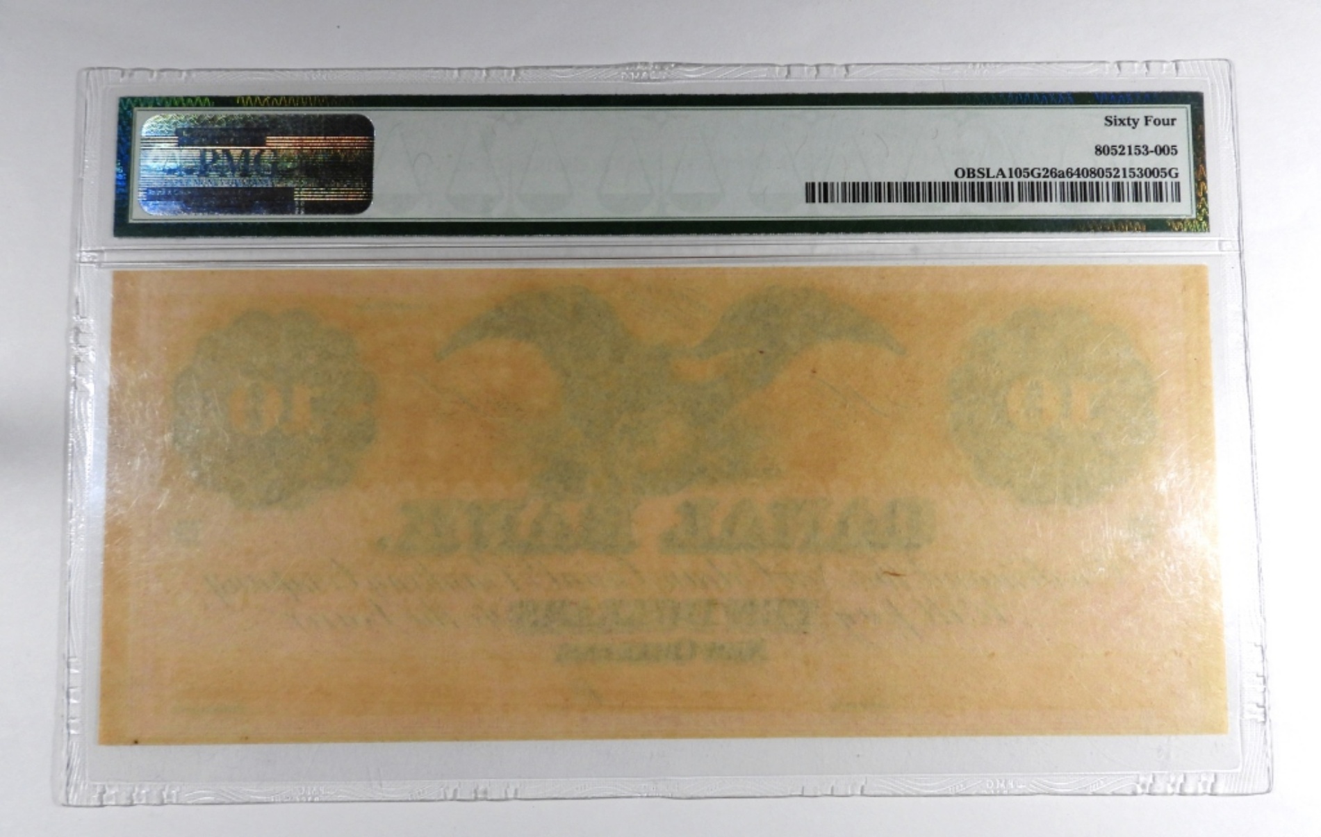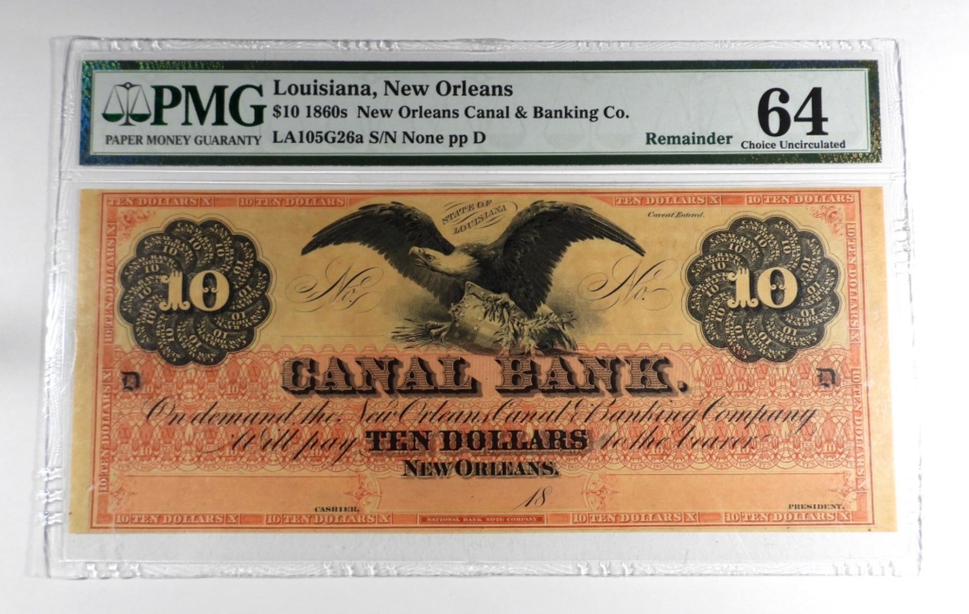 TEN DOLLARS, NEW ORLEANS CANAL & BANKING CO., LA105G26a S/N NONE PP D, 64 CHOICE UNCIRCULATED, REMAINDER
