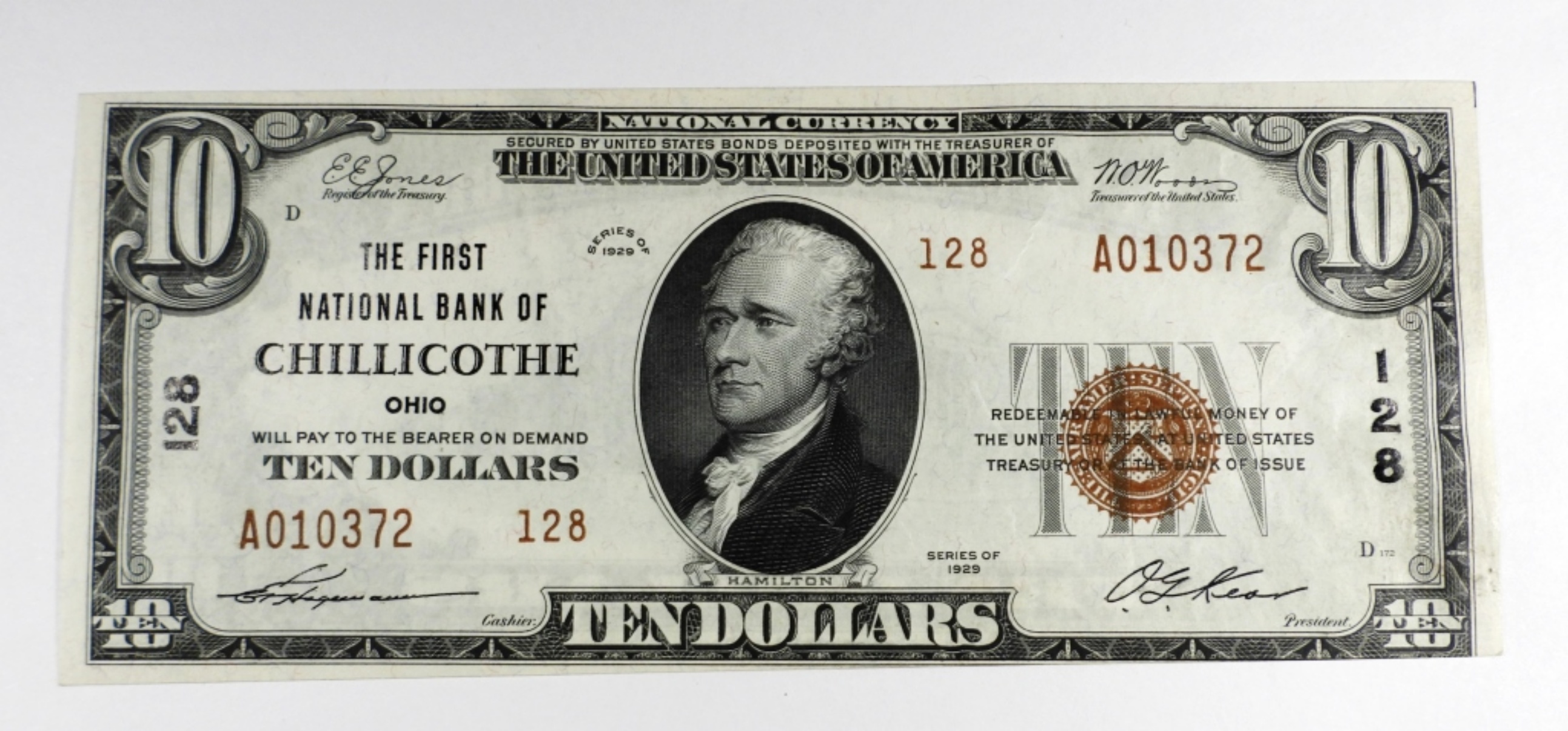 TEN DOLLARS, THE FIRST NATIONAL BANK OF CHILLICOTHE OHIO, UNCIRCULATED