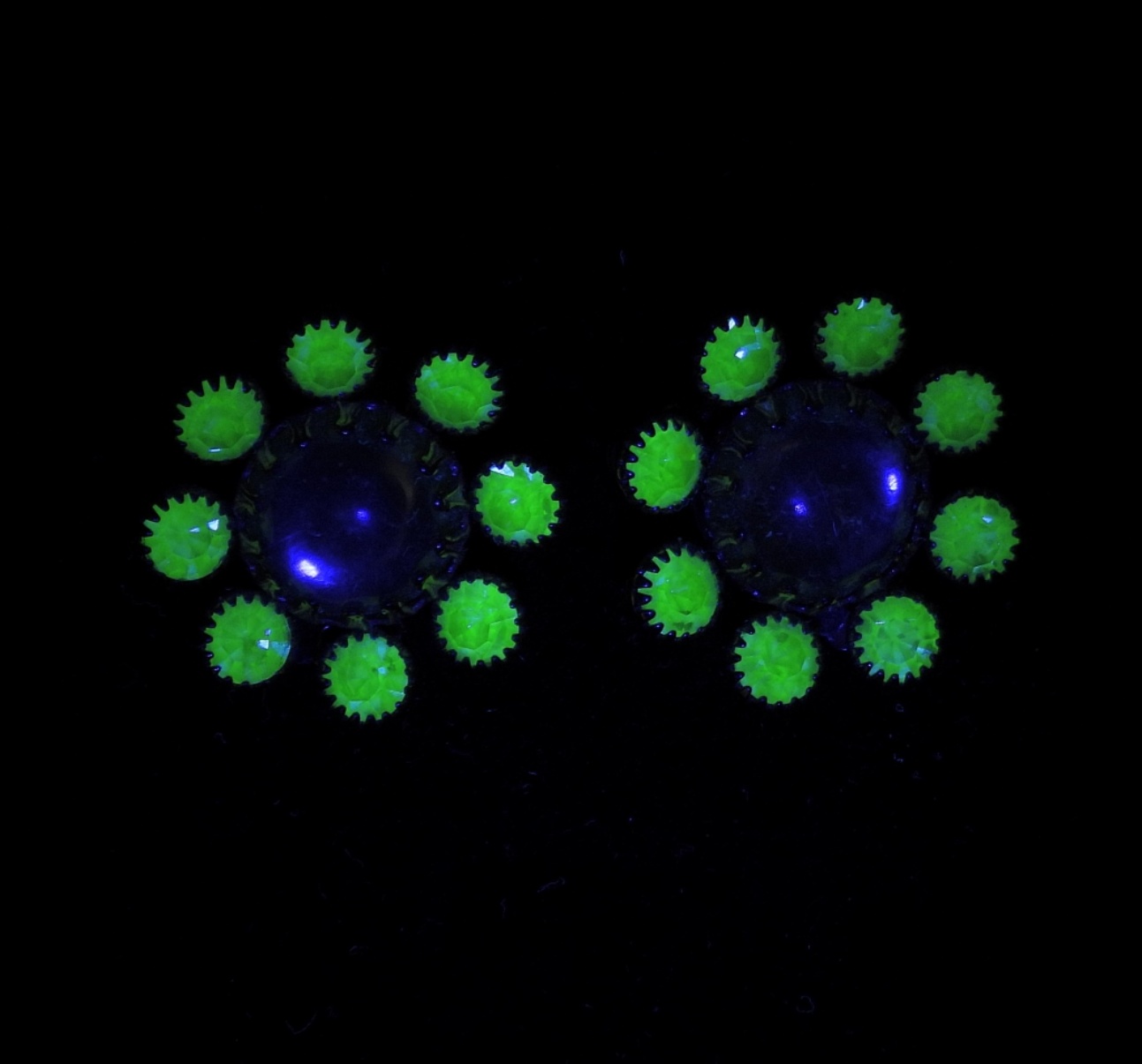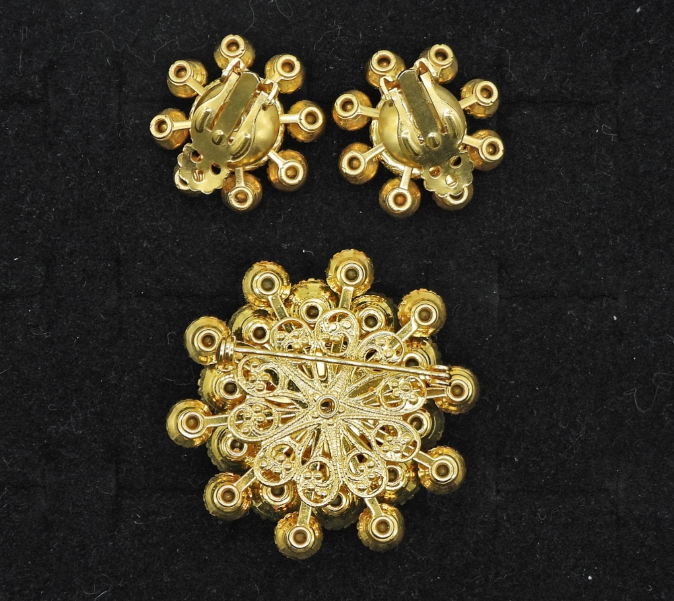 Vintage Gold Tone Brooch & Earrings with Green Gemstones. Earrings have Uranium Glass (See Photos!).