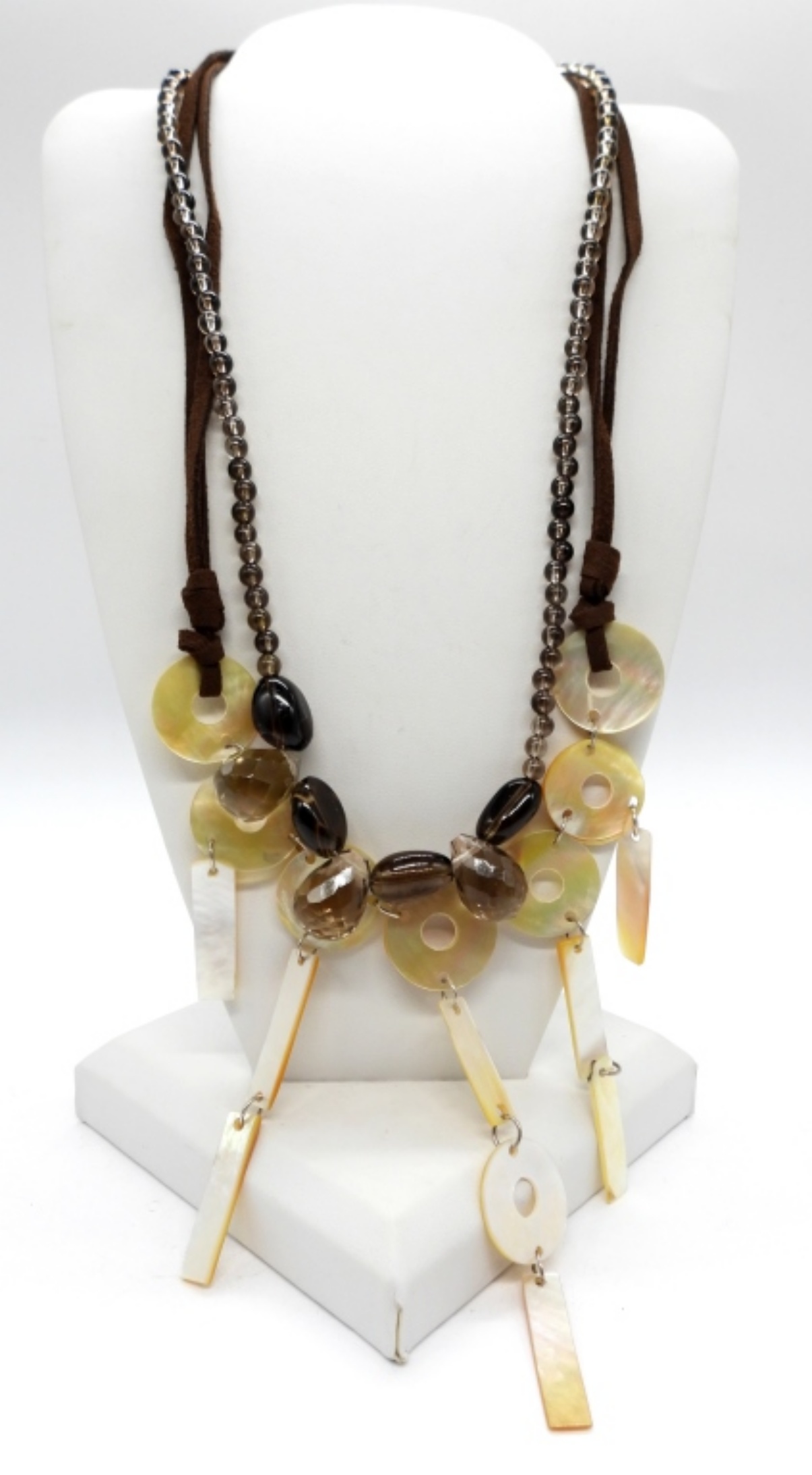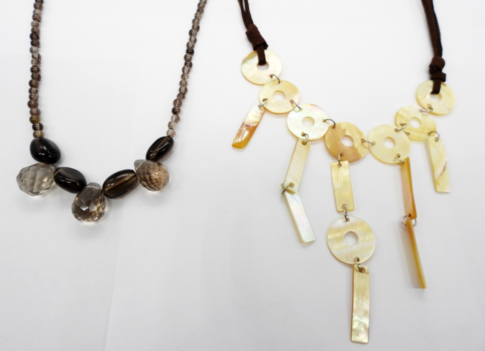 Beautiful Smokey Quartz Faceted Beaded Necklace, 18″. Leather Cord Lariat Necklace with Mother of Pearl Charms, 20″.