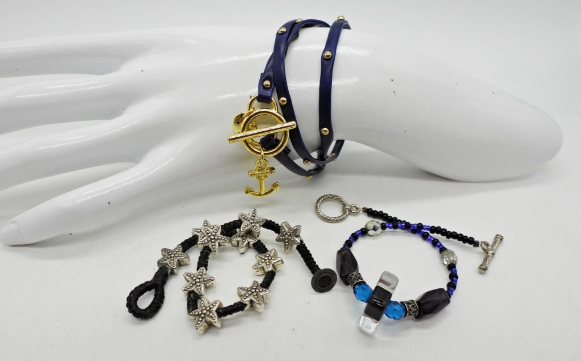 Three Nautical Themed Bracelets. Silver Tone Starfish Beads on a Black Braided Leather Cord, 7″. Purple/Blue/Black Beaded 7″ Bracelet. Navy Blue Leather Wrap Bracelet, 20″ with Gold tone Anchor Charm.