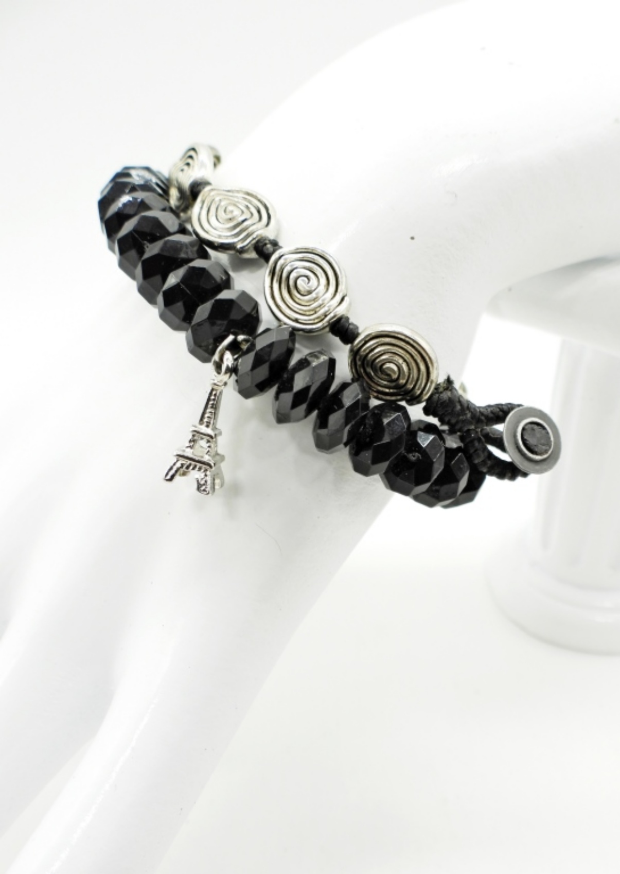 Two Bracelets, Silver Tone Spirals on a Black Braided Leather Bracelet, 7″. Black Faceted Beads on a stretchy bracelet with a silver tone Eiffel tower charm, 7″.
