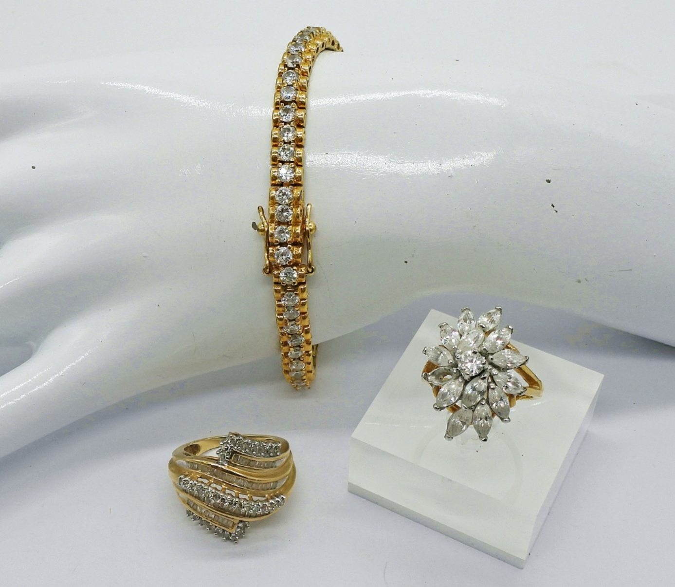 Two Gold Tone Size 7 Rings with Diamond Colored Gemstones. One Gold Tone 18″ Leaf Necklace, One Gold Tone 7.5″ Tennis Bracelet. One Ring is Missing a Stone (See Photos).