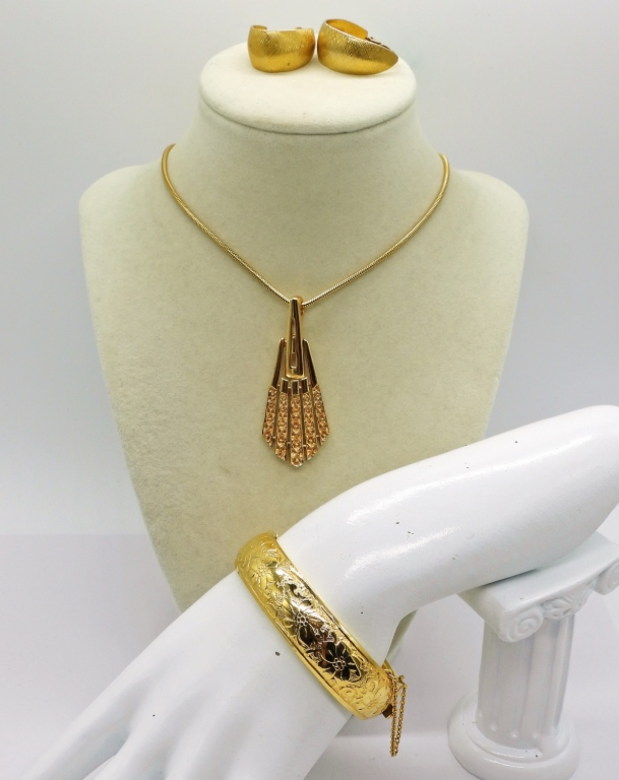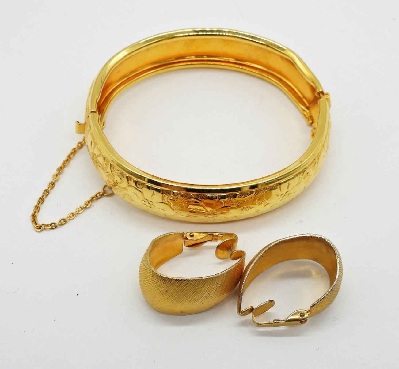 Gold Tone Sarah Coventry Fashion Necklace, 23″. Gold Tone Clip On Earrings and Bangle Bracelet.