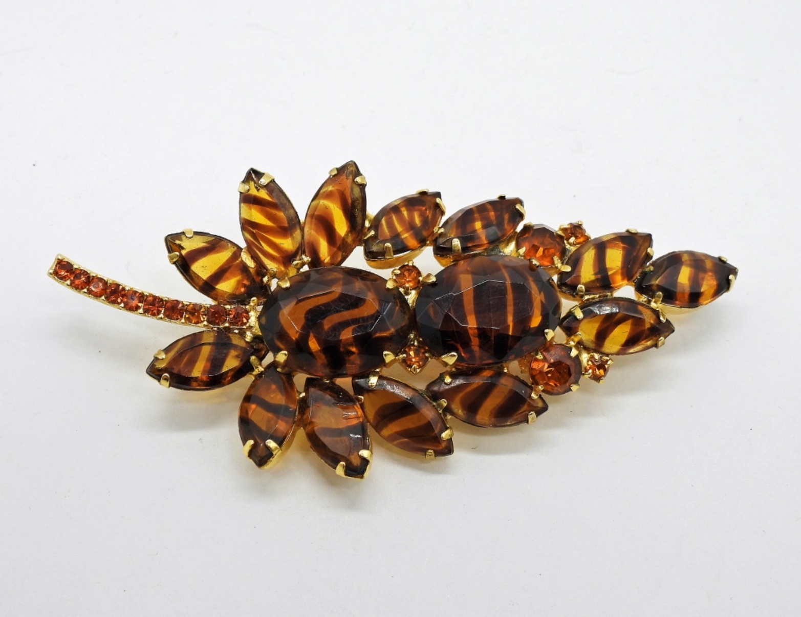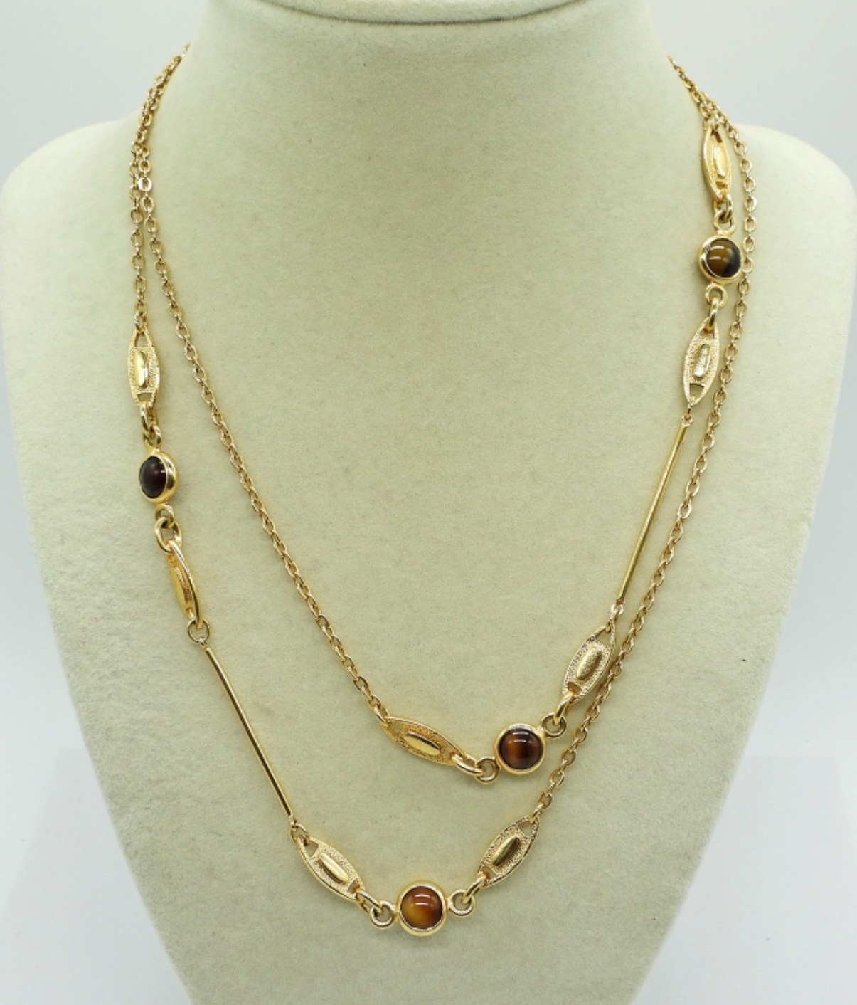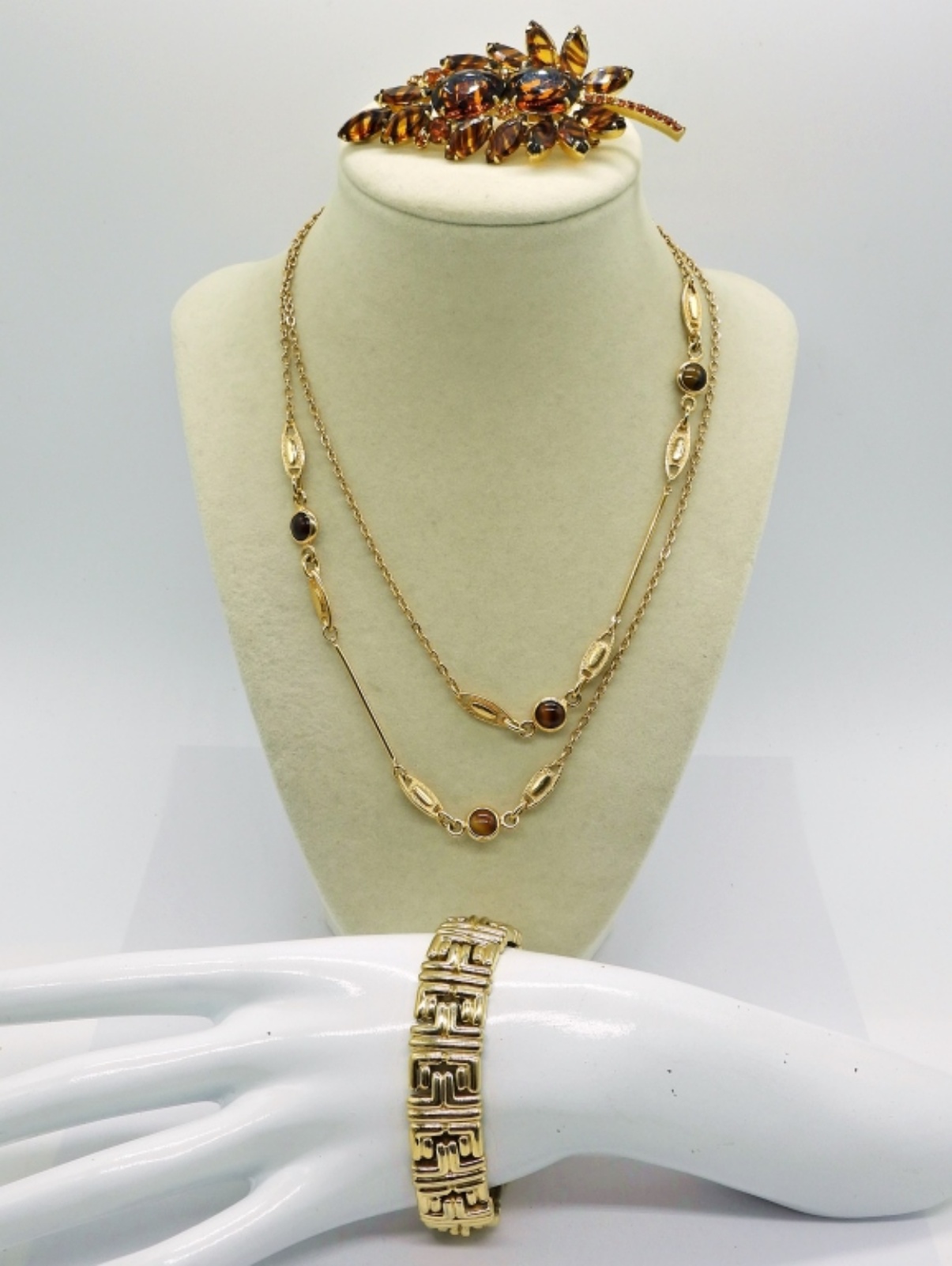 Vintage Sarah Coventry 36″ Fashion Necklace. 7.5″ Gold Tone Bracelet, Brown Gemstone Brooch, 3.5″x 1.5″.